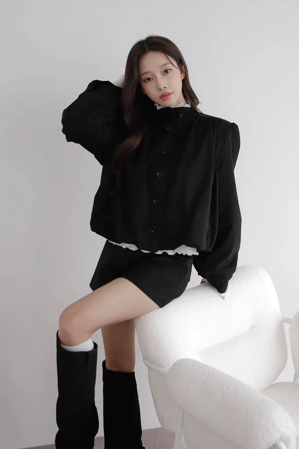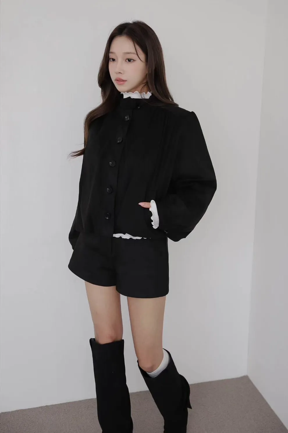 仿麂皮 內襯毛毛 排釦穿脫 立體打摺設計 微墊肩