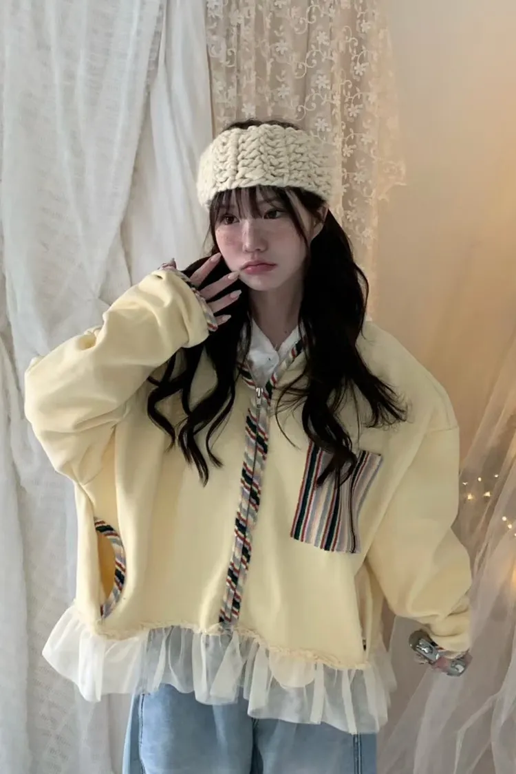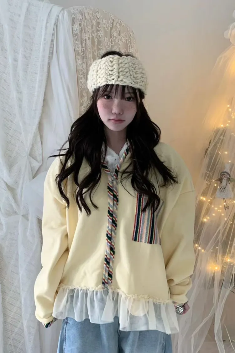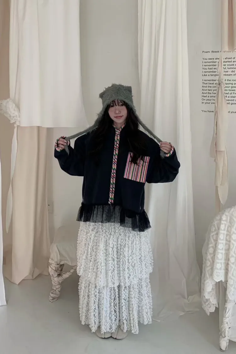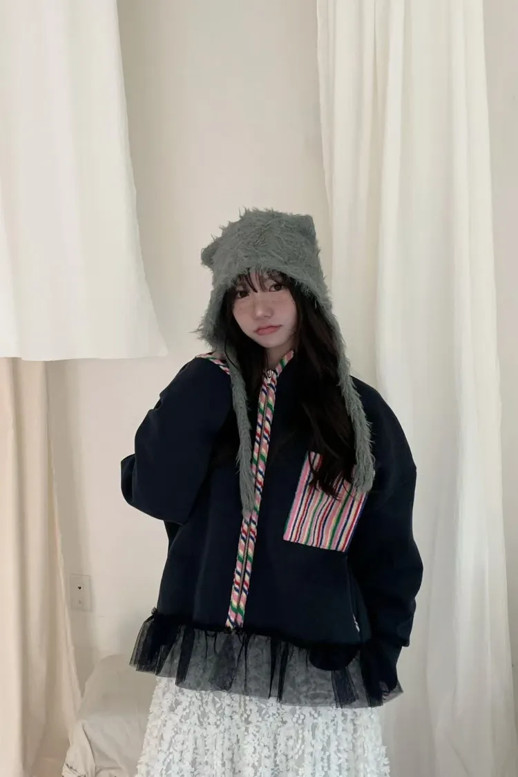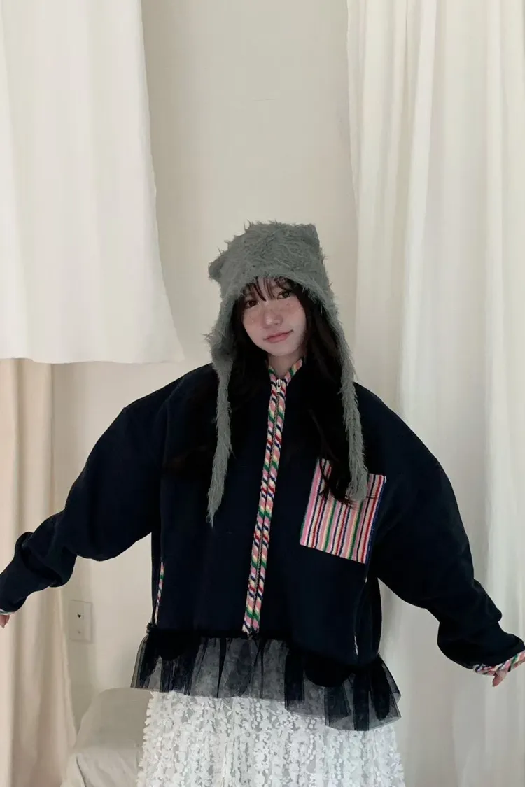 棉 內襯磨毛 彩虹滾邊口袋 下擺蕾絲
