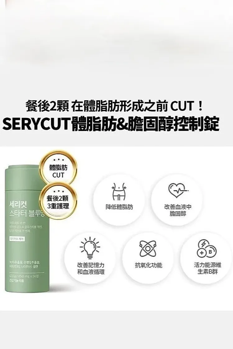 HK728韓國sery box體脂醣類控制錠小綠盒(56錠/瓶) $620 體驗效果 : 有效纖體、降低體脂肪、BMI、內臟脂肪 添加效果 : 改善記憶力 改善膽固醇 抗氧化及增強活力適合群體 : 防止脂肪形成、不戒醣類也能輕鬆減重品質保證:富含銀杏、綠茶、維生素服用方式 : 每日一次, 每次兩粒, 餐後服用