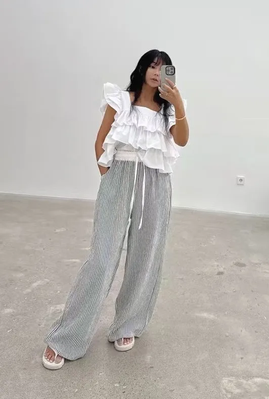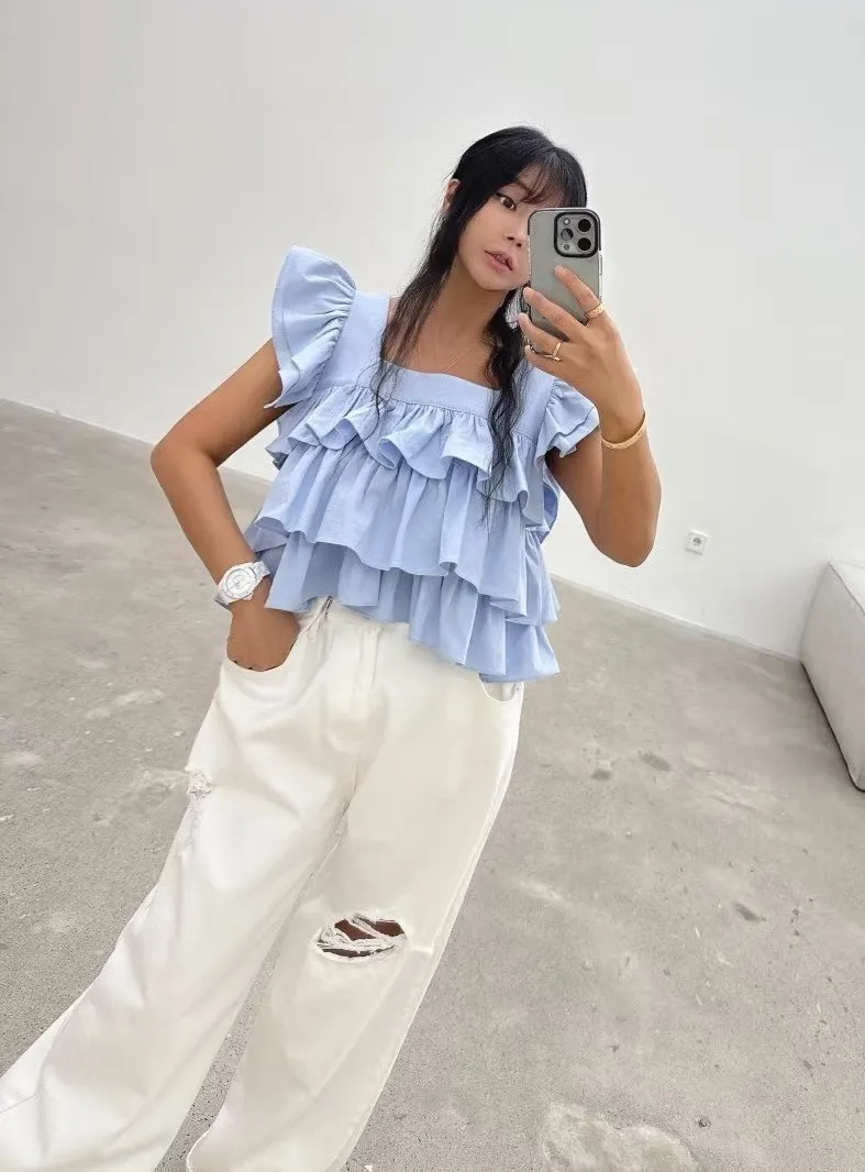 棉 紮實挺度 方領顯瘦 面料舒適 遮肉荷葉袖 美背綁帶設計