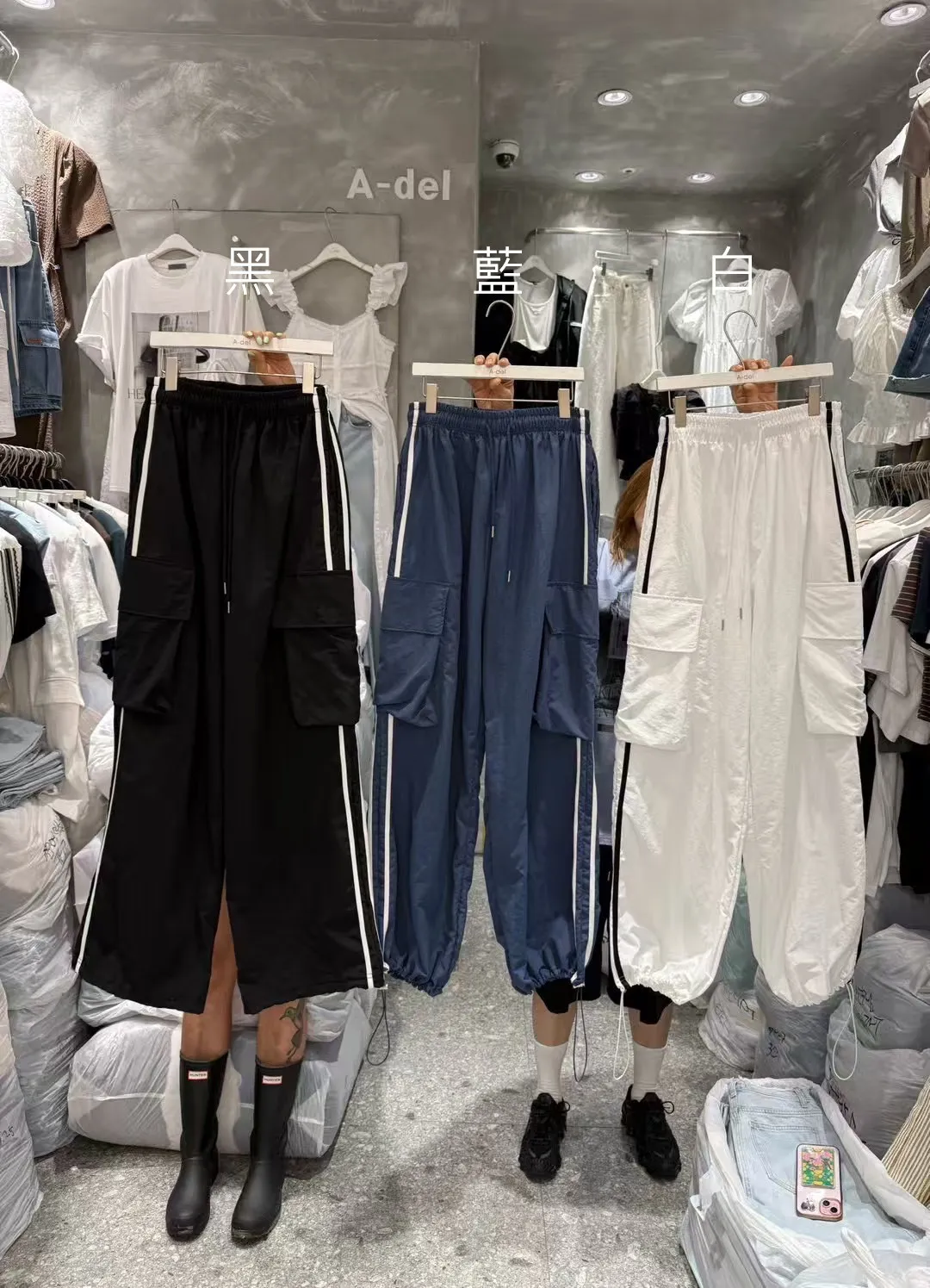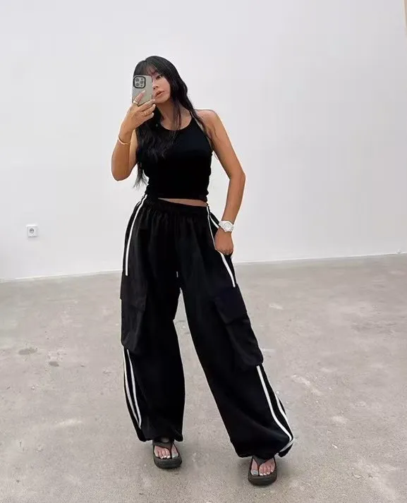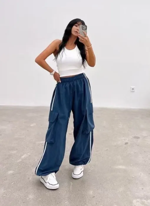 尼龍 全腰鬆緊有抽繩 雙側腿跳色車線 有口袋 褲管有抽繩