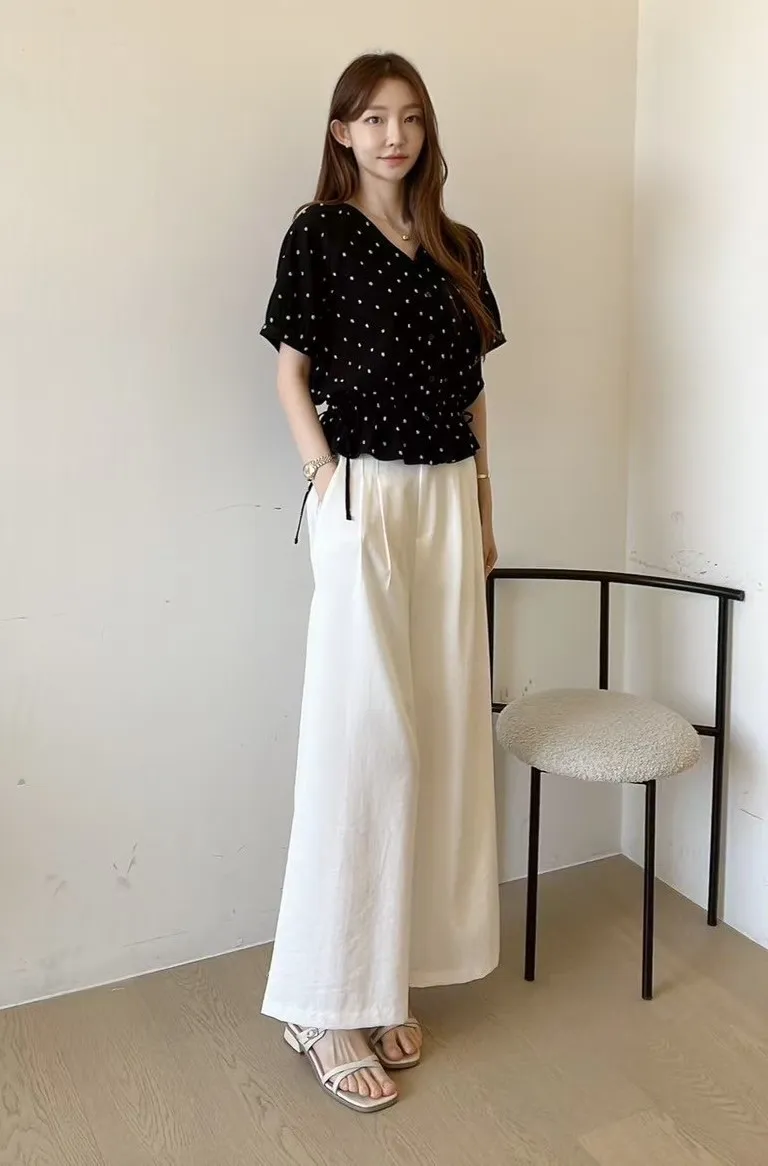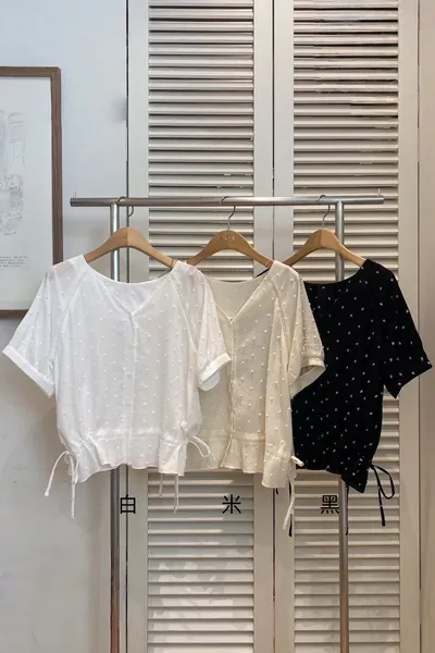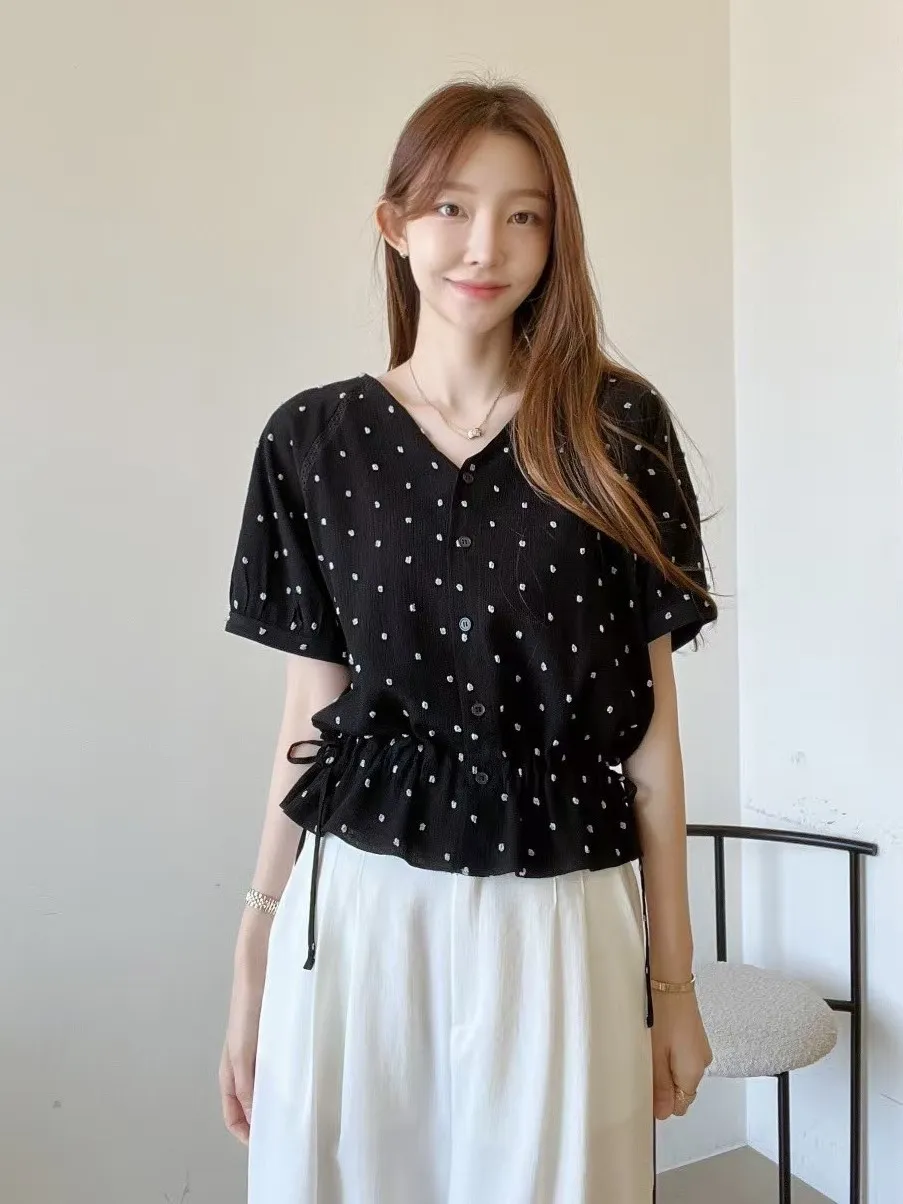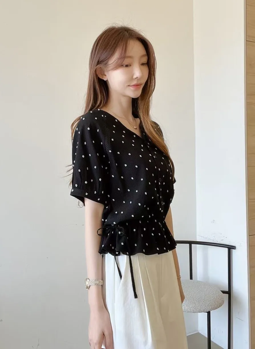 棉 透氣舒適 雙側腰抽繩 細緻點點面料 排釦穿脫 V領顯瘦