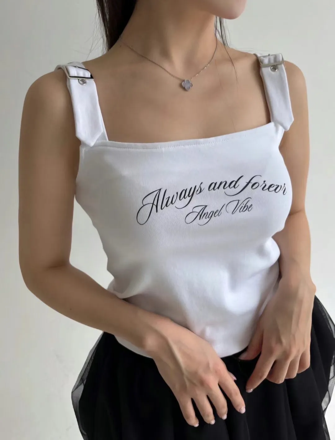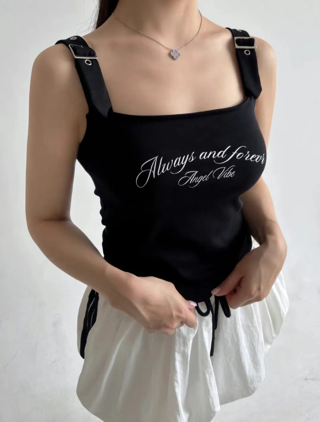 棉+彈力 柔軟親膚 類似莫代爾有彈性 肩帶釦條 百搭風格 穿到M號