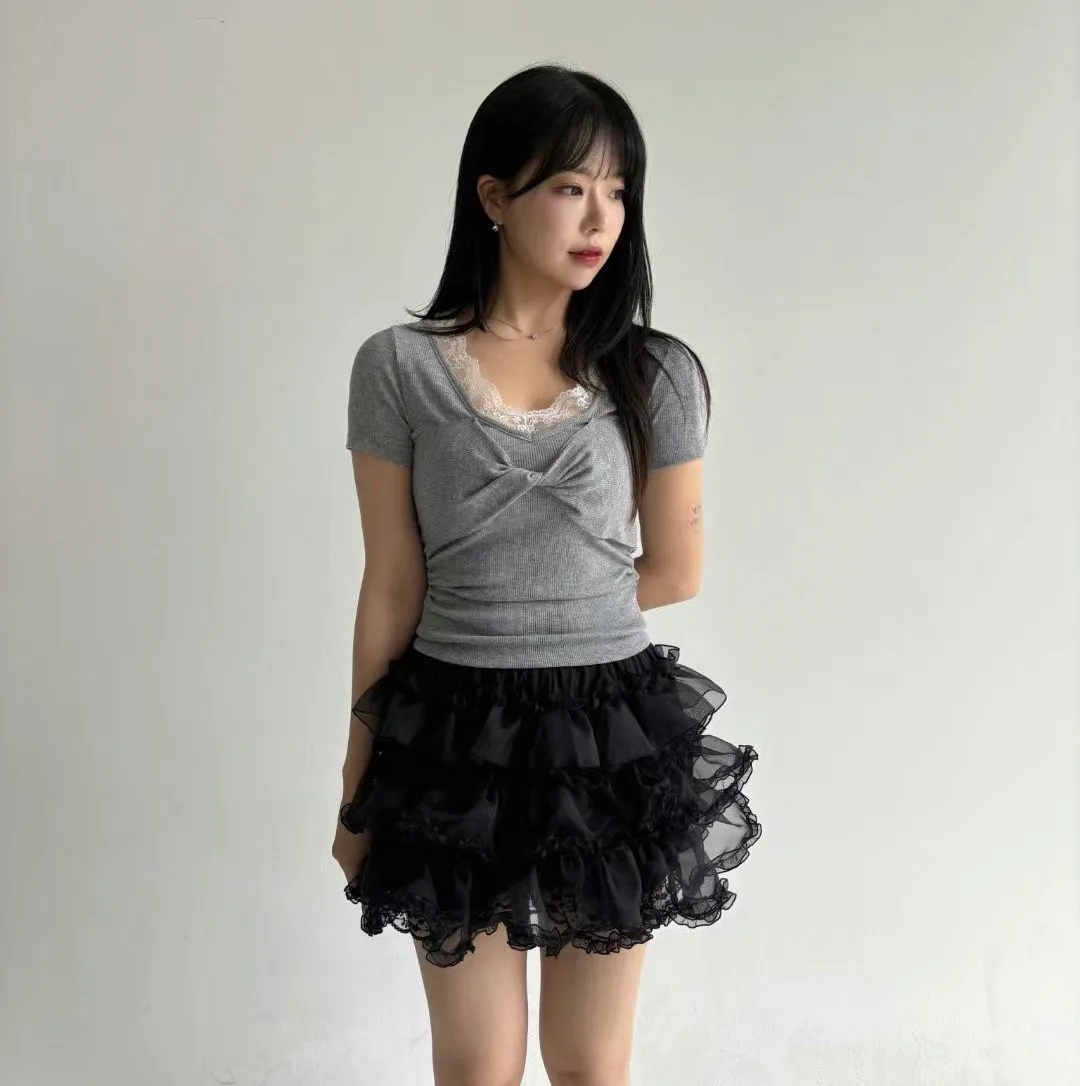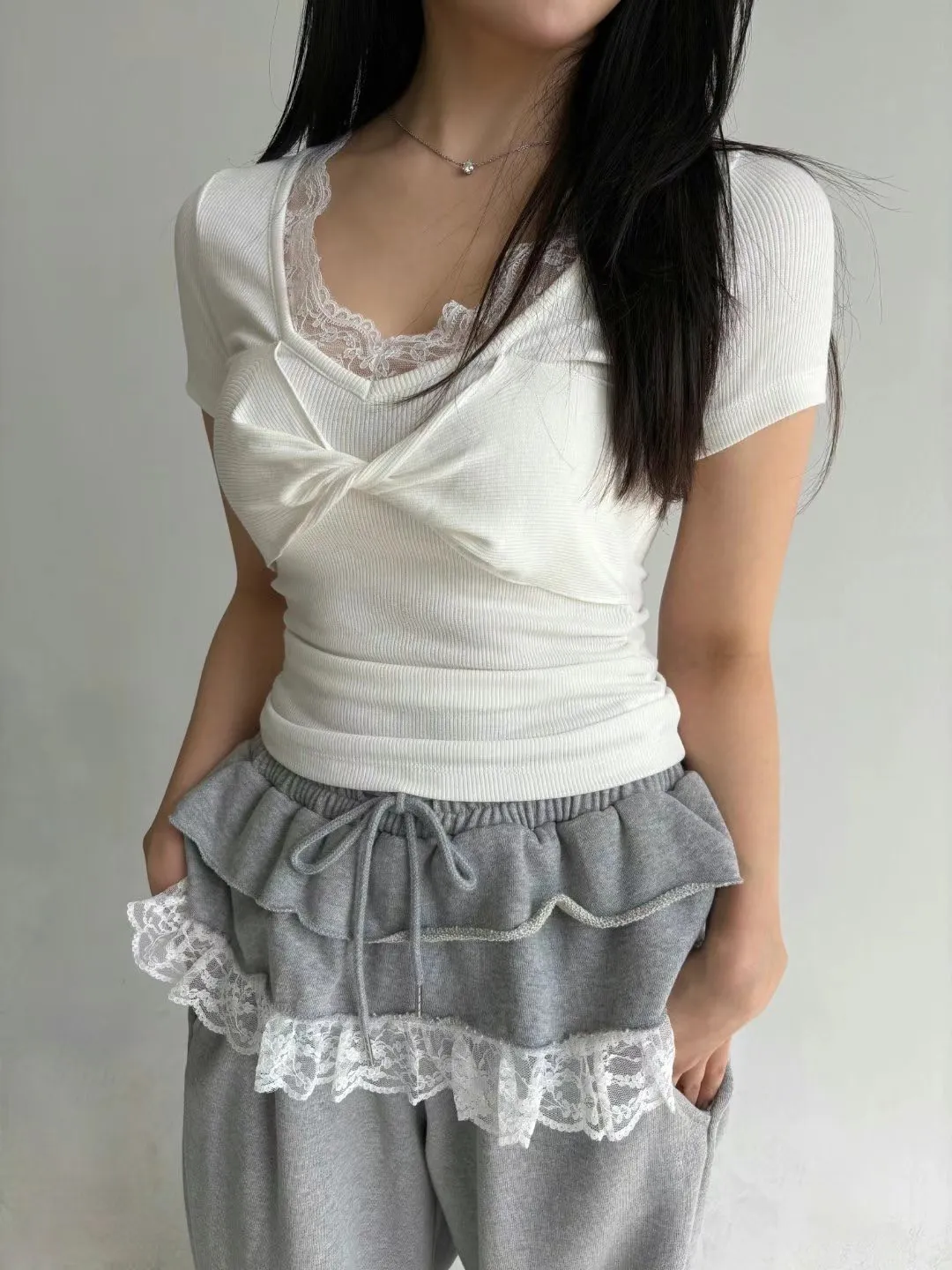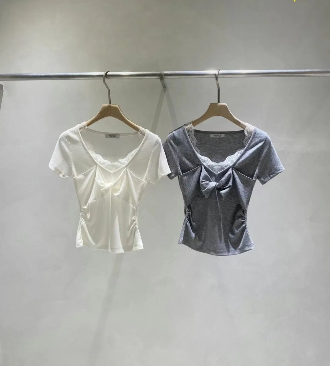 棉 親膚透氣 蕾絲領口滾邊 胸前扭結設計 短版好比例 穿到S號