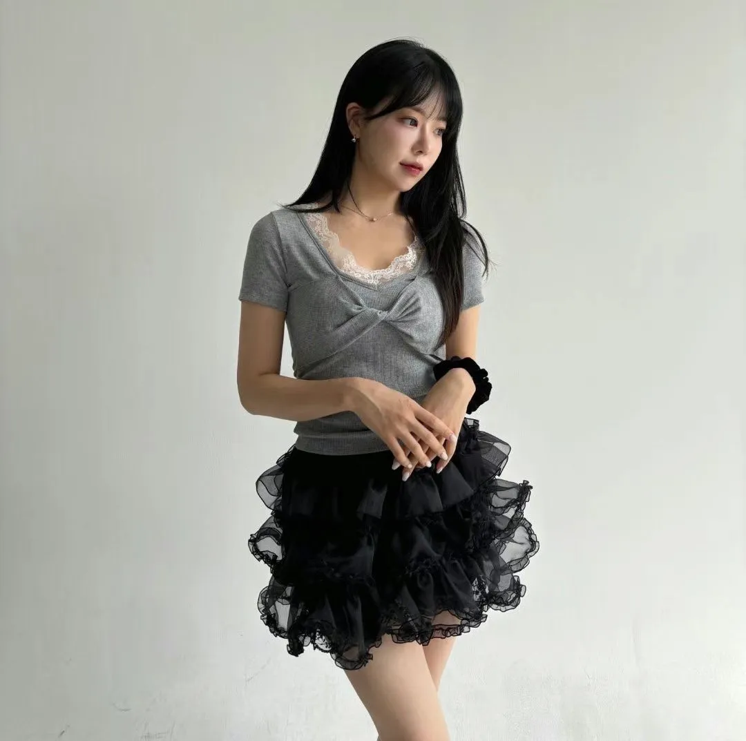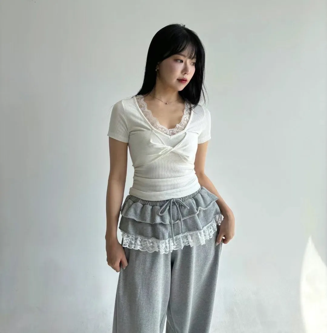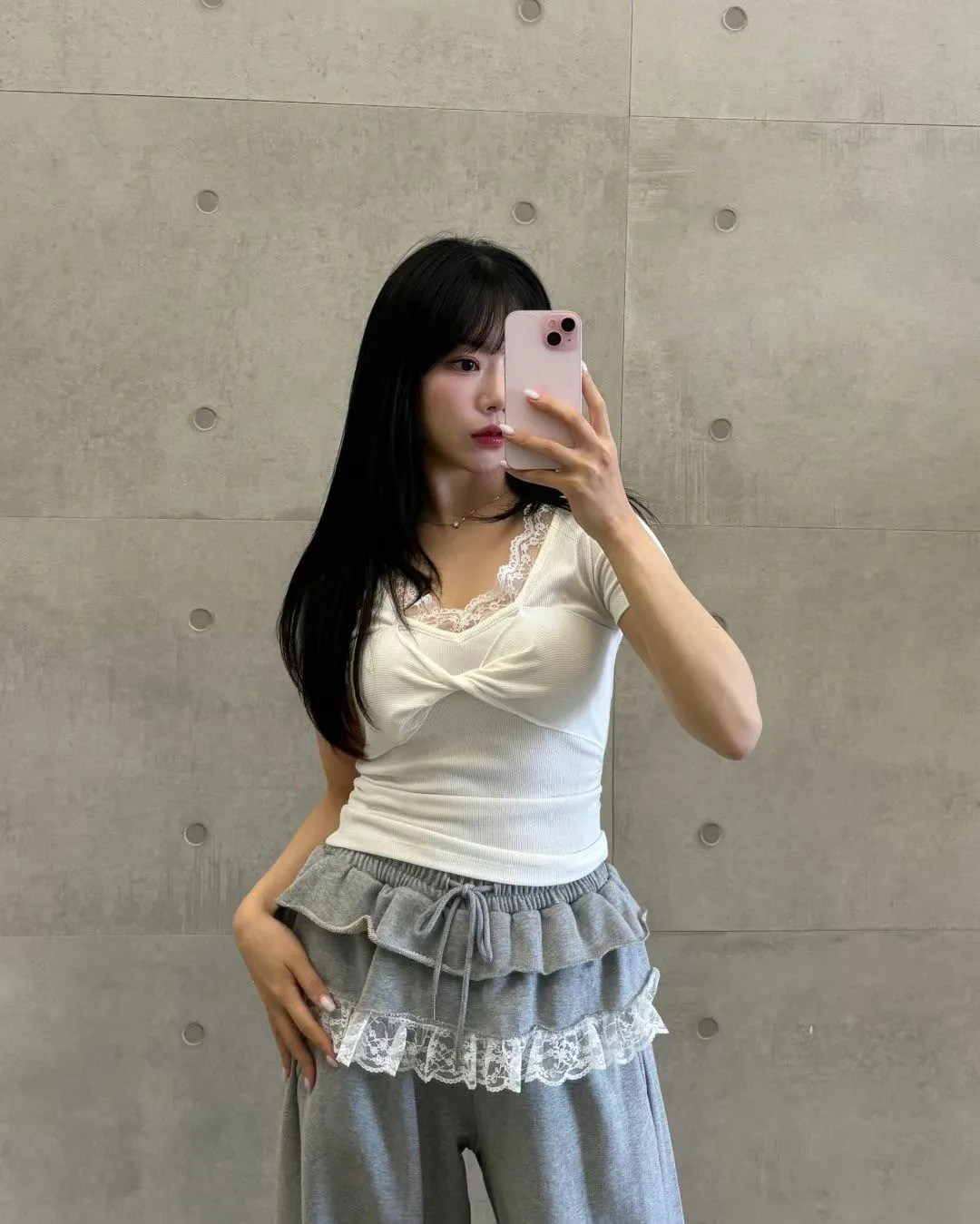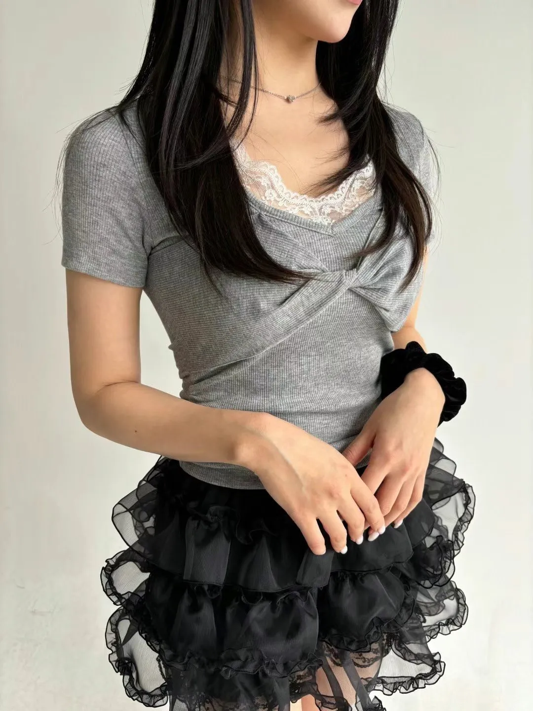 棉 親膚透氣 蕾絲領口滾邊 胸前扭結設計 短版好比例 穿到S號
