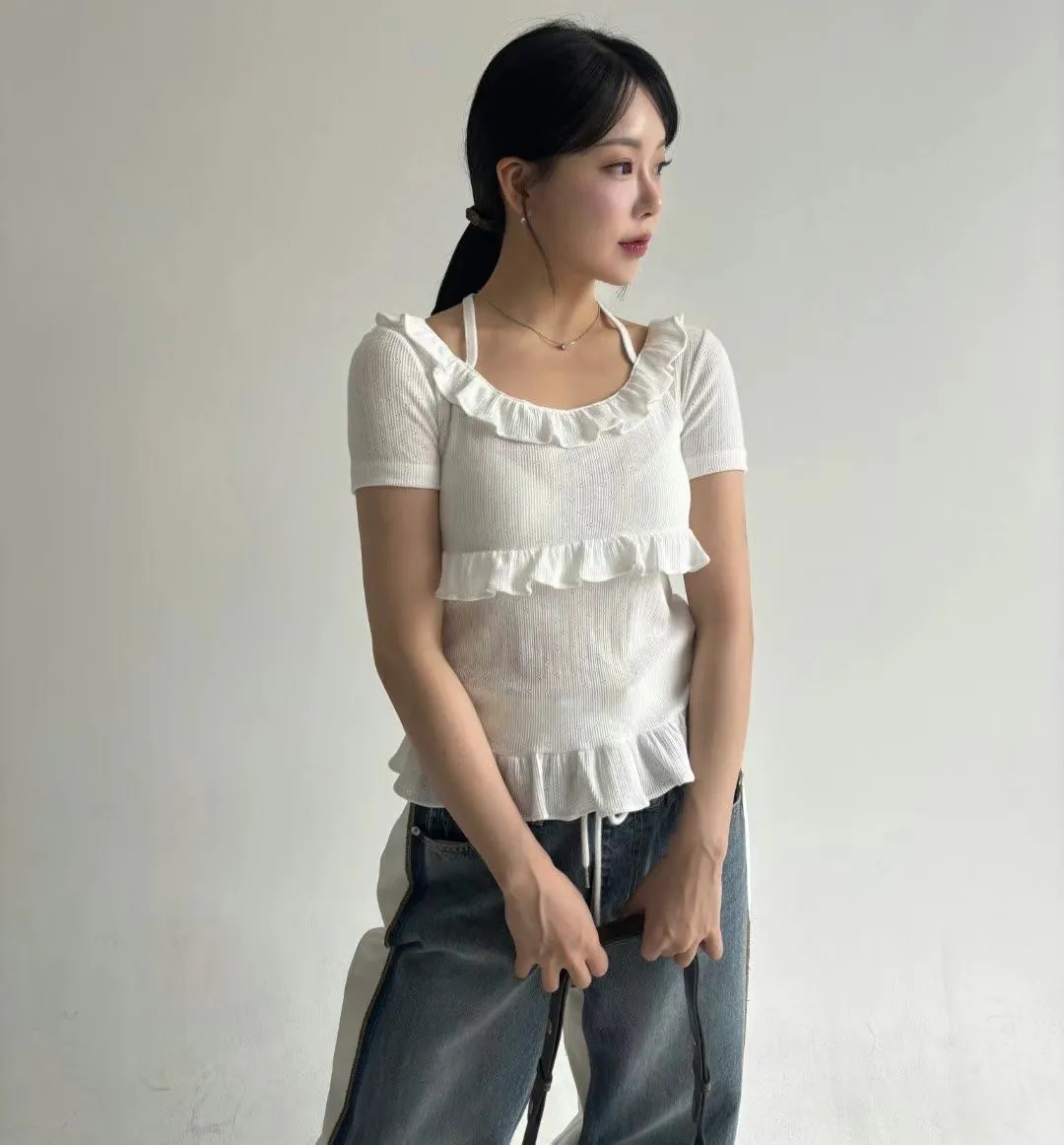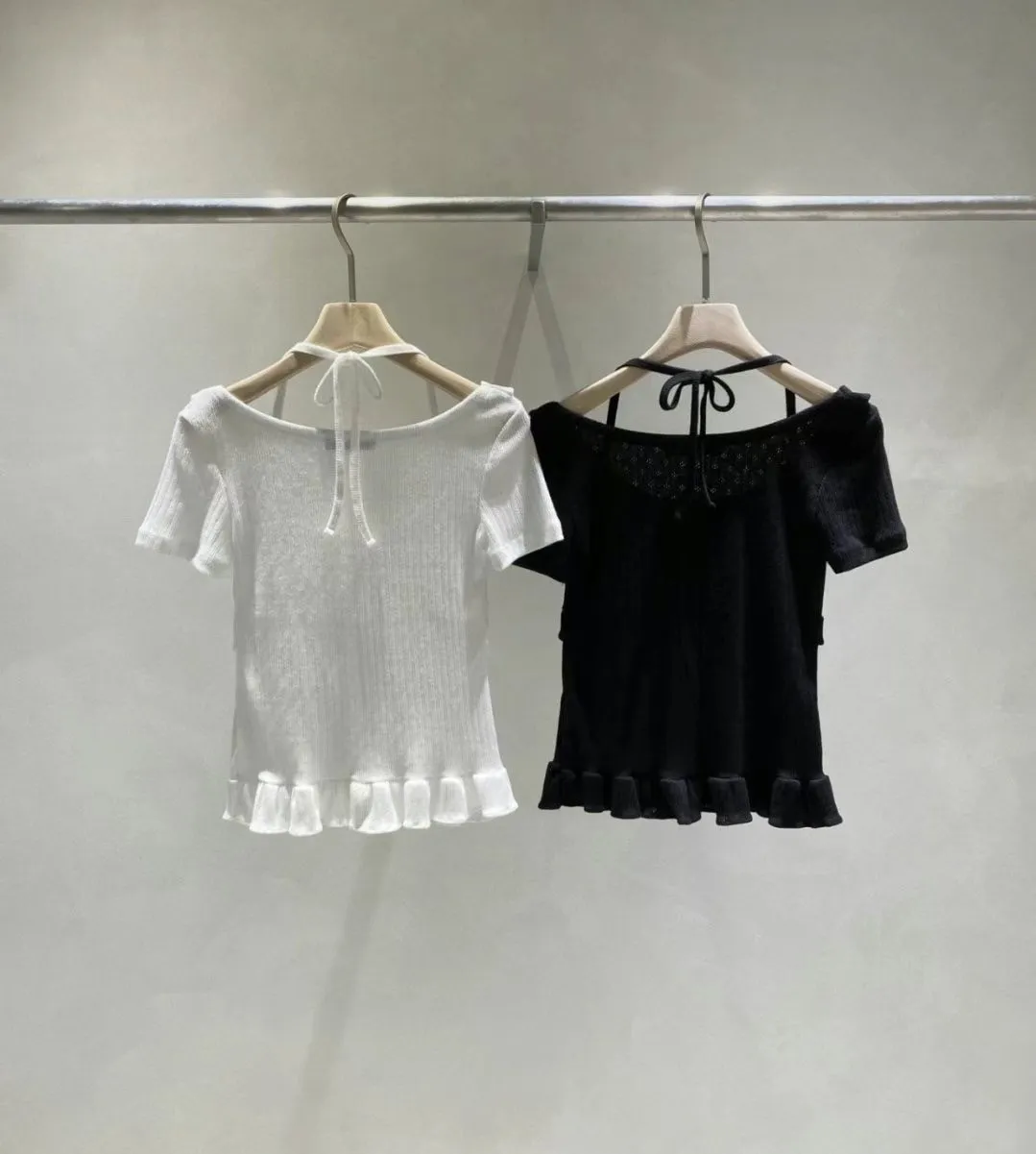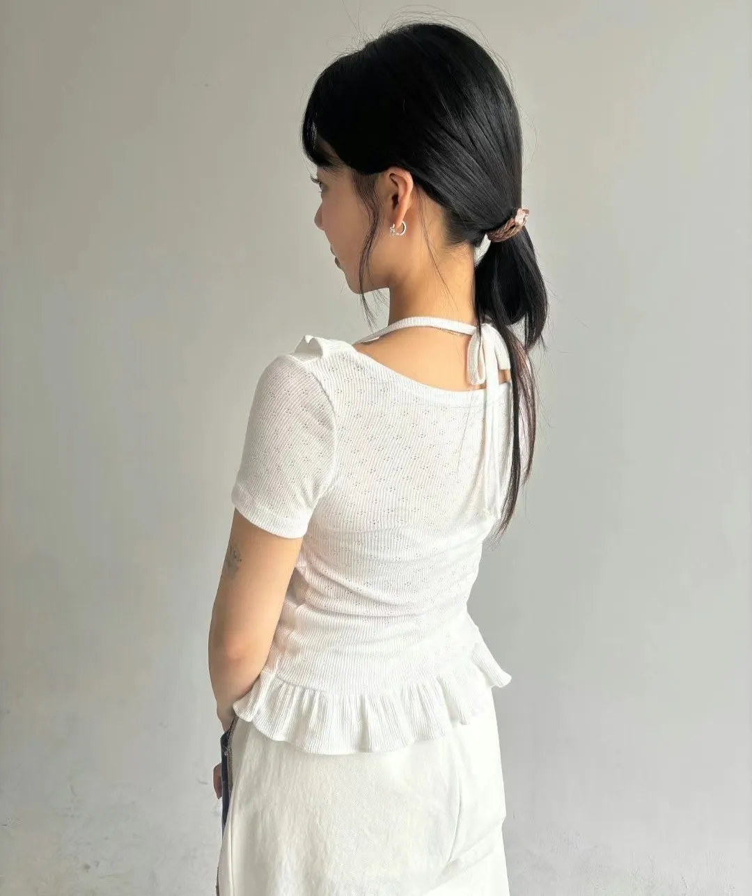 棉+彈力 細洞燒花棉 彈性佳 荷葉下擺 繫繩繞頸 舒適寬領