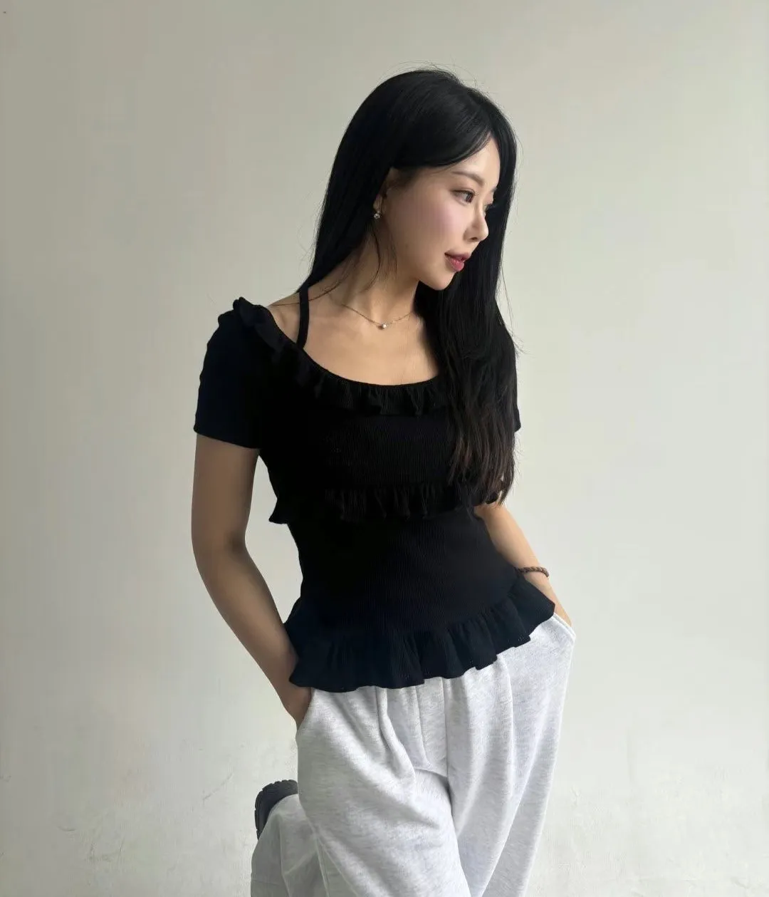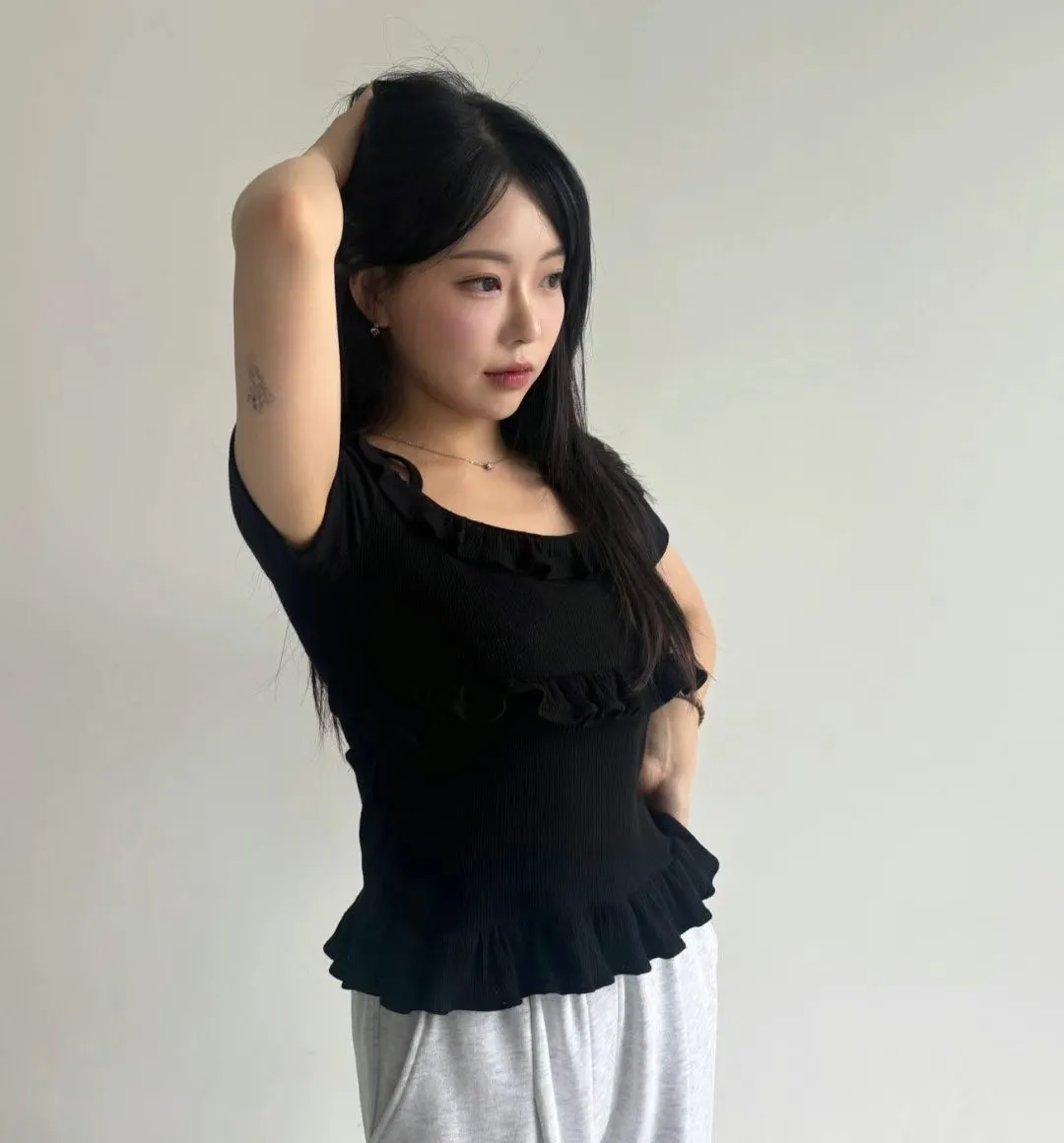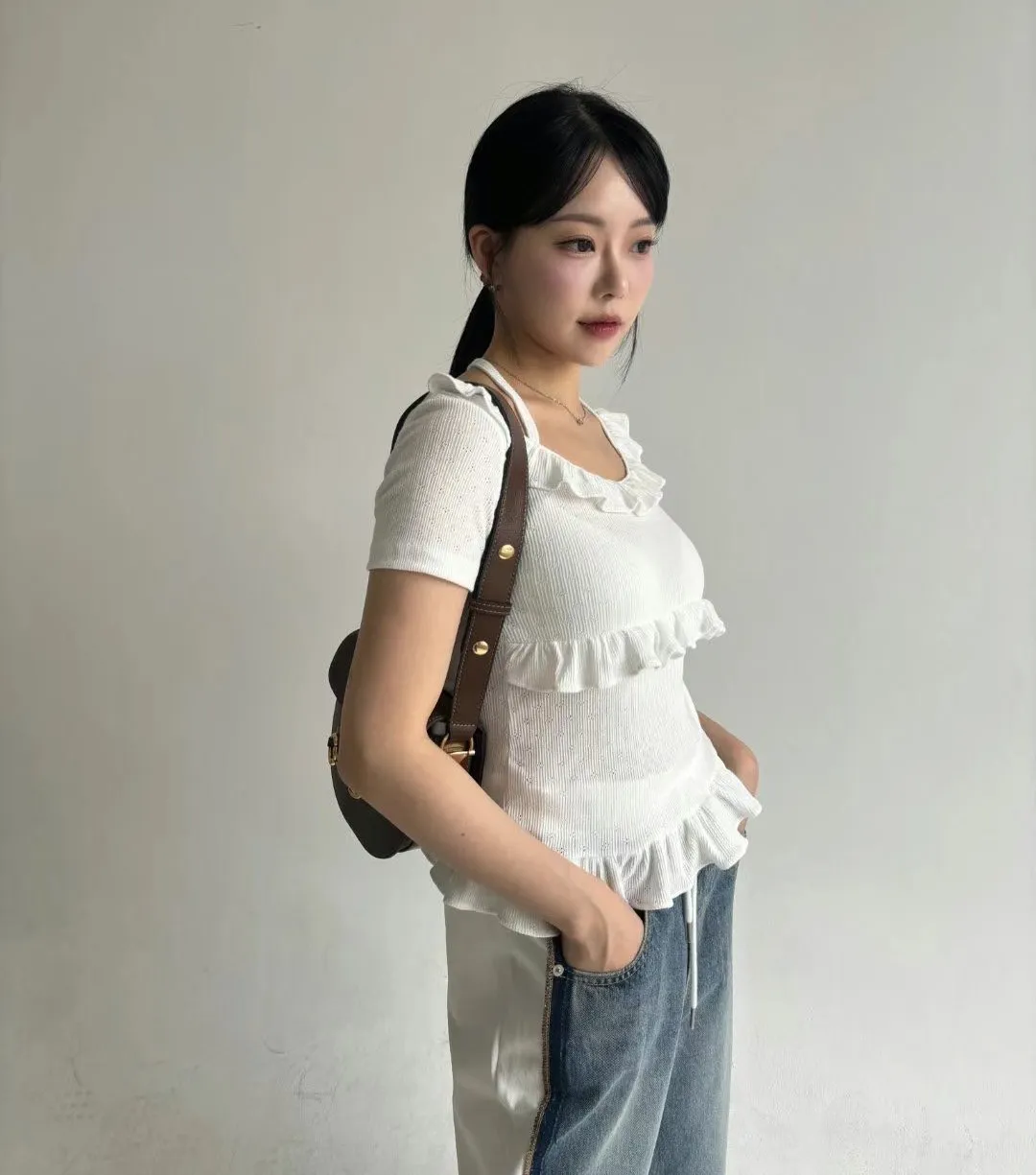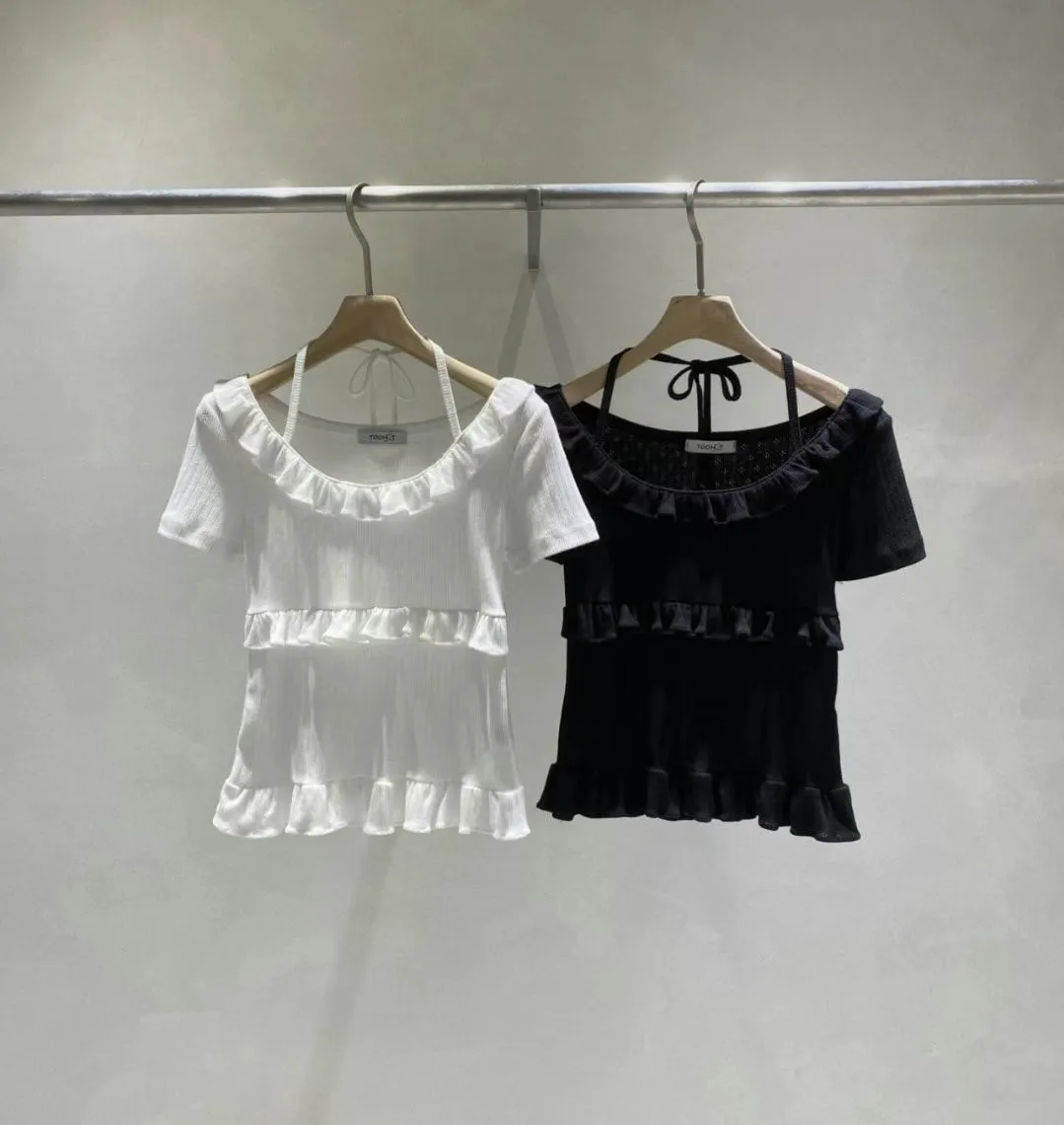 棉+彈力 細洞燒花棉 彈性佳 荷葉下擺 繫繩繞頸 舒適寬領