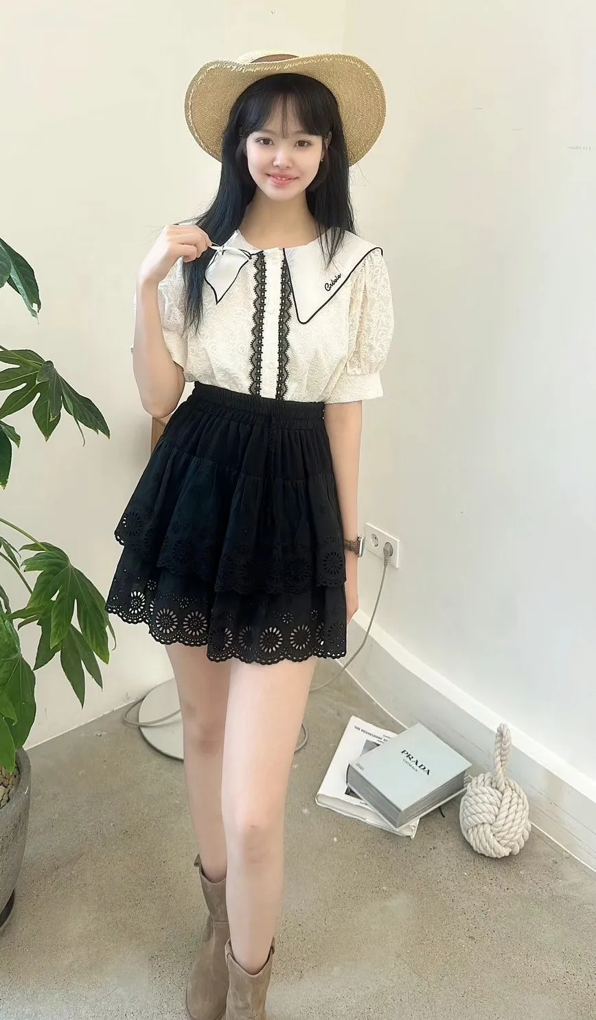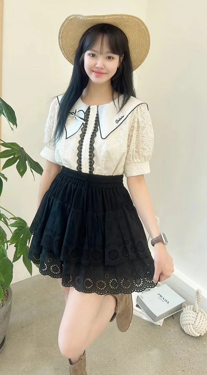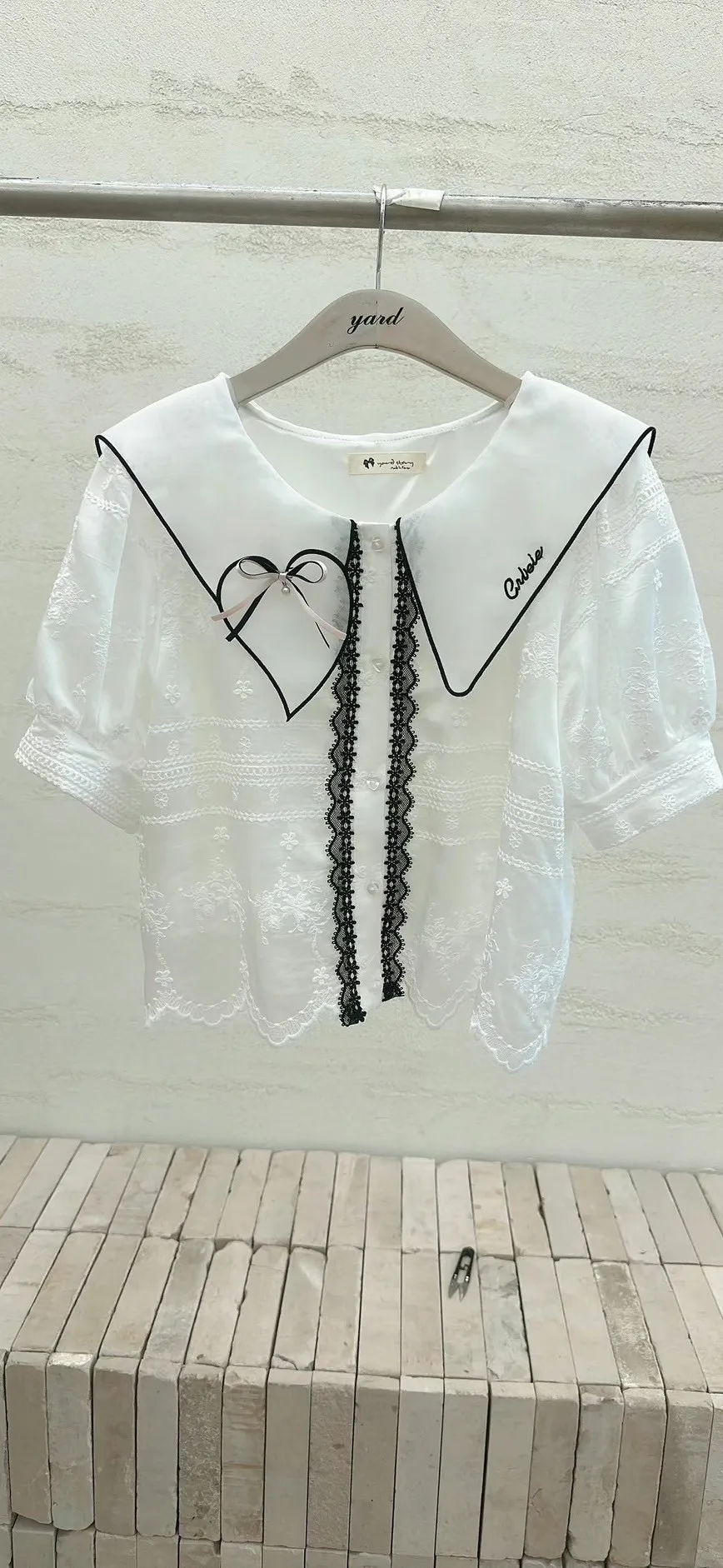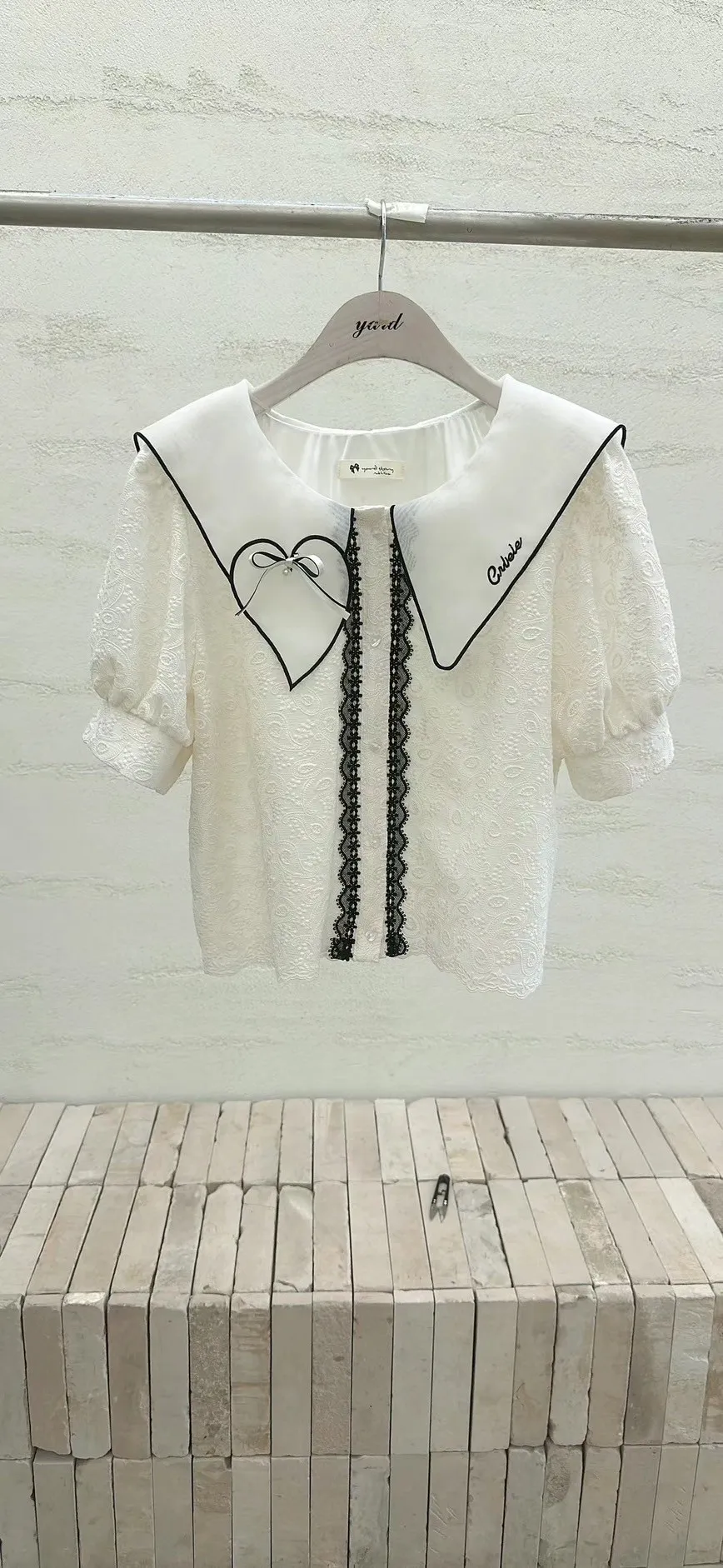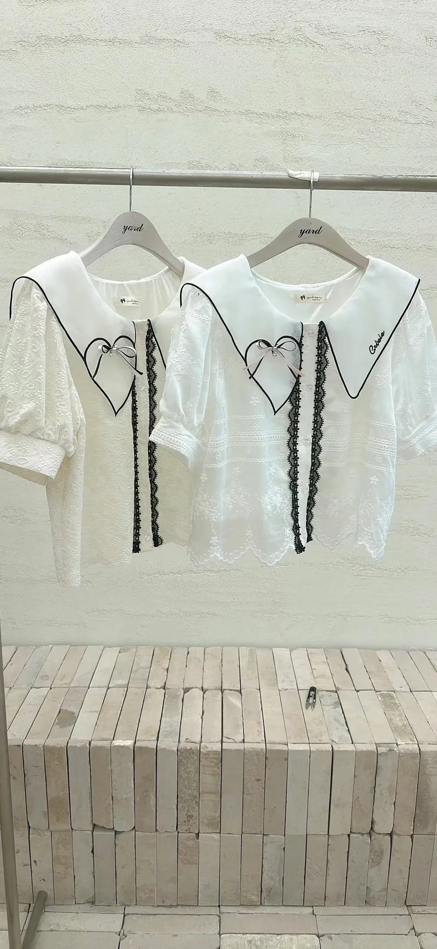 白=棉,米=布蕾絲,領口上的蝴蝶結是別針可拆