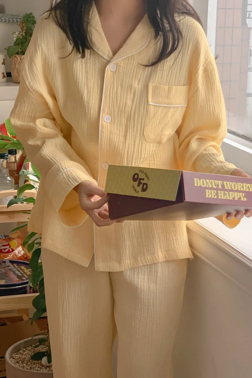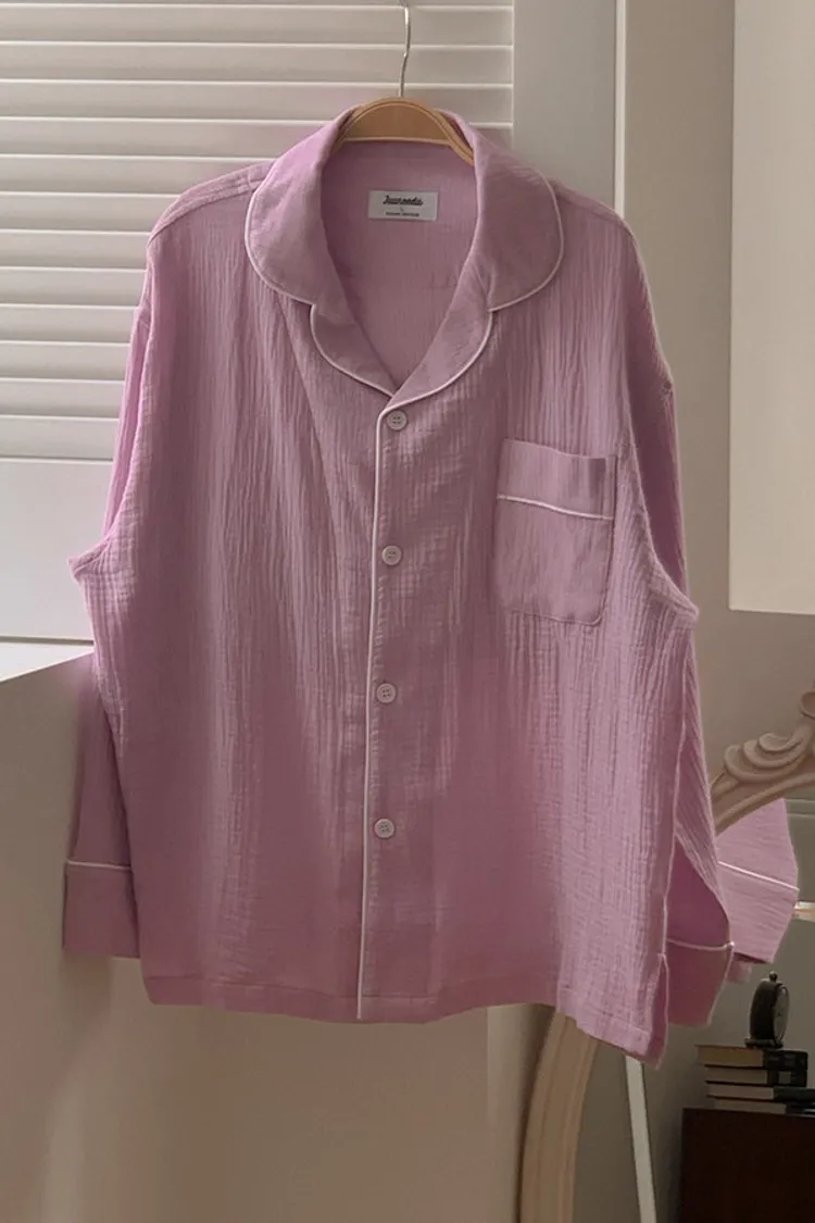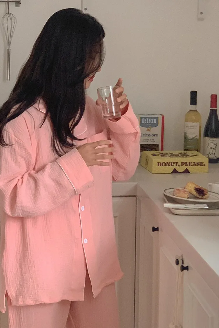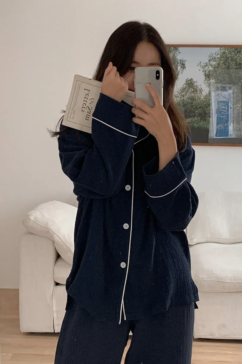 JUU009Karina同款純棉素色長袖睡衣套裝組 淺藍 深藍 淺粉 深粉 黃 橘 紫 原價$1100 特價$890棉100%上衣尺寸cmL 胸寬59 肩寬53 袖長50 全長64XL 胸寬62 肩寬57 袖長56 全長73褲子尺寸cmL 腰寬30 臀寬52 大腿寬29 褲檔33 全長92XL 腰寬34 臀寬56 大腿寬32 褲檔35 全長95 以下為深藍色穿搭👇🏻 以下為淺藍色穿搭👇🏻 以下顏色,深藍>淺藍 以下為黃色穿搭👇🏻 以下顏色,淺藍>黃 以下顏色,橘>黃 以下為紫色穿搭👇🏻 以下為淺粉色穿搭👇🏻 以下為深粉色穿搭👇🏻 以下顏色,深粉>淺粉 以下顏色,如圖所示