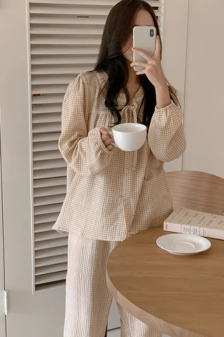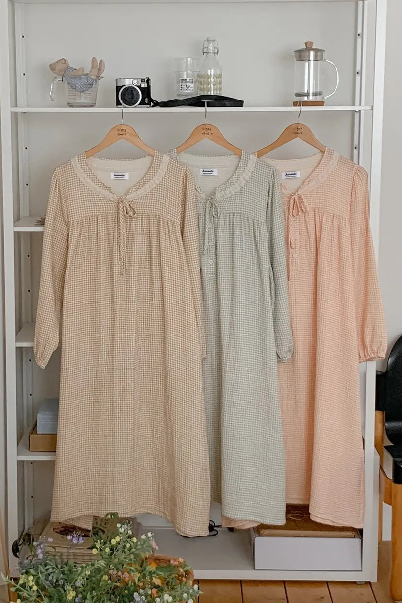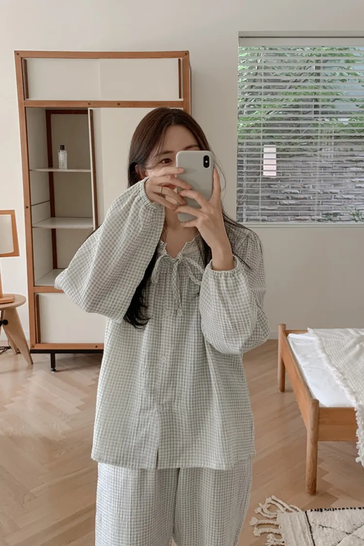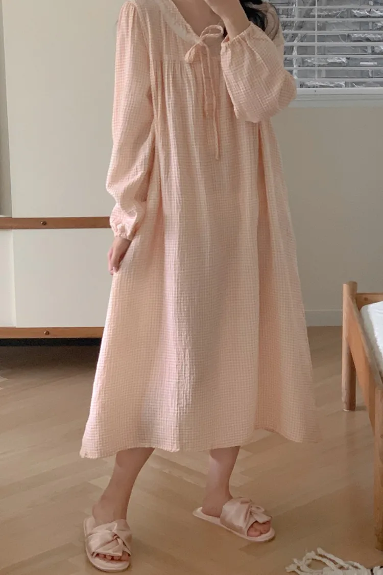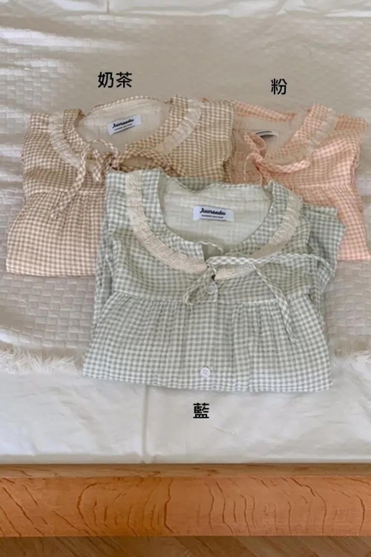 JUU011娃娃領純棉綁帶格紋睡衣套裝組(裙/褲) 奶茶 粉 藍 原價$1100 特價$899棉100%裙子尺寸cm胸寬55 肩寬38 袖長60 全長115上衣尺寸cm胸寬55 肩寬38 袖長60 全長65褲子尺寸cm腰寬32 臀寬55 大腿寬30 褲檔30 全長95以下為奶茶色穿搭👇🏻 以下為藍色穿搭👇🏻 以下顏色,奶茶>藍色 以下為粉色穿搭👇🏻 以下顏色,粉>藍 以下顏色,如圖所示