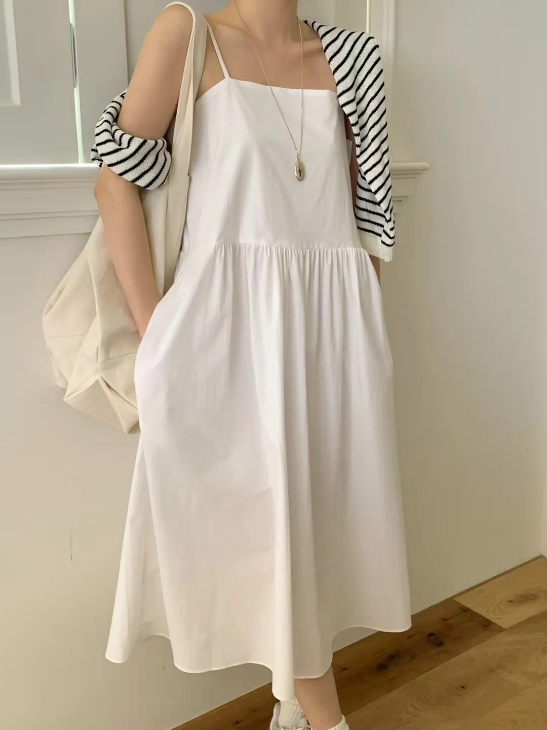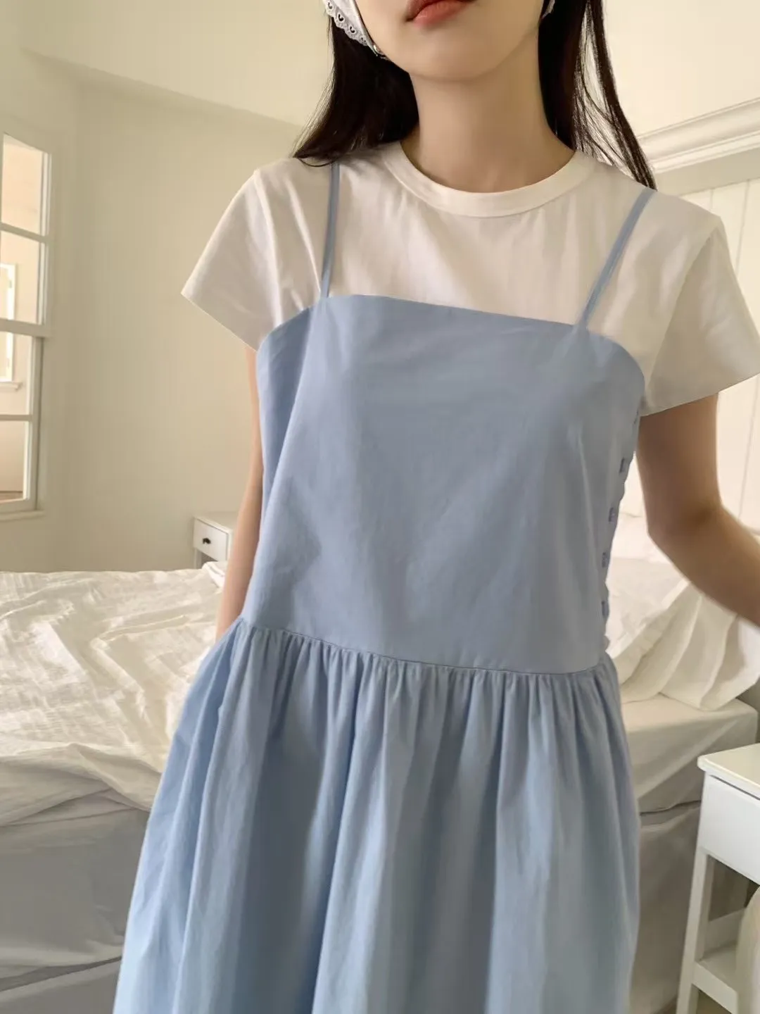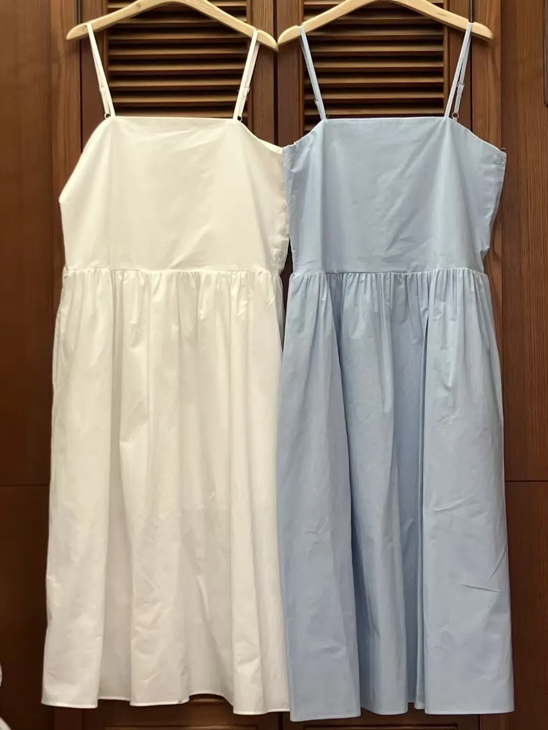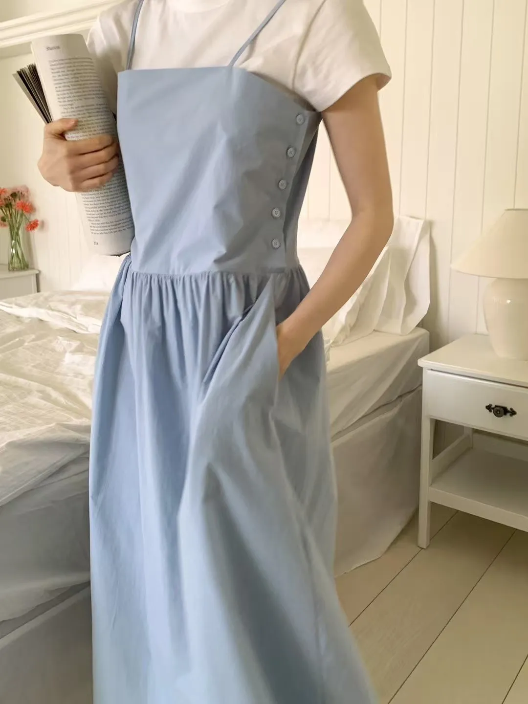 棉,薄款透氣 裙有內裡 有口袋 肩帶可調 穿到L號