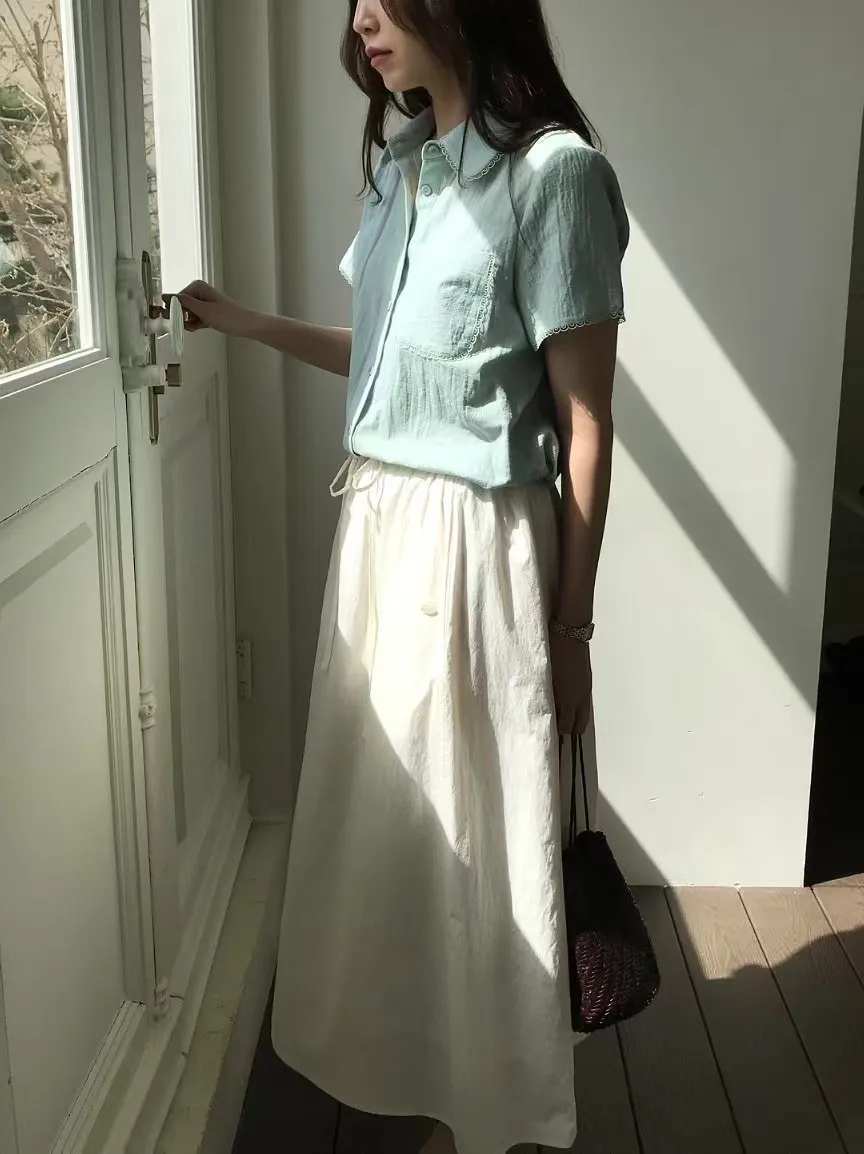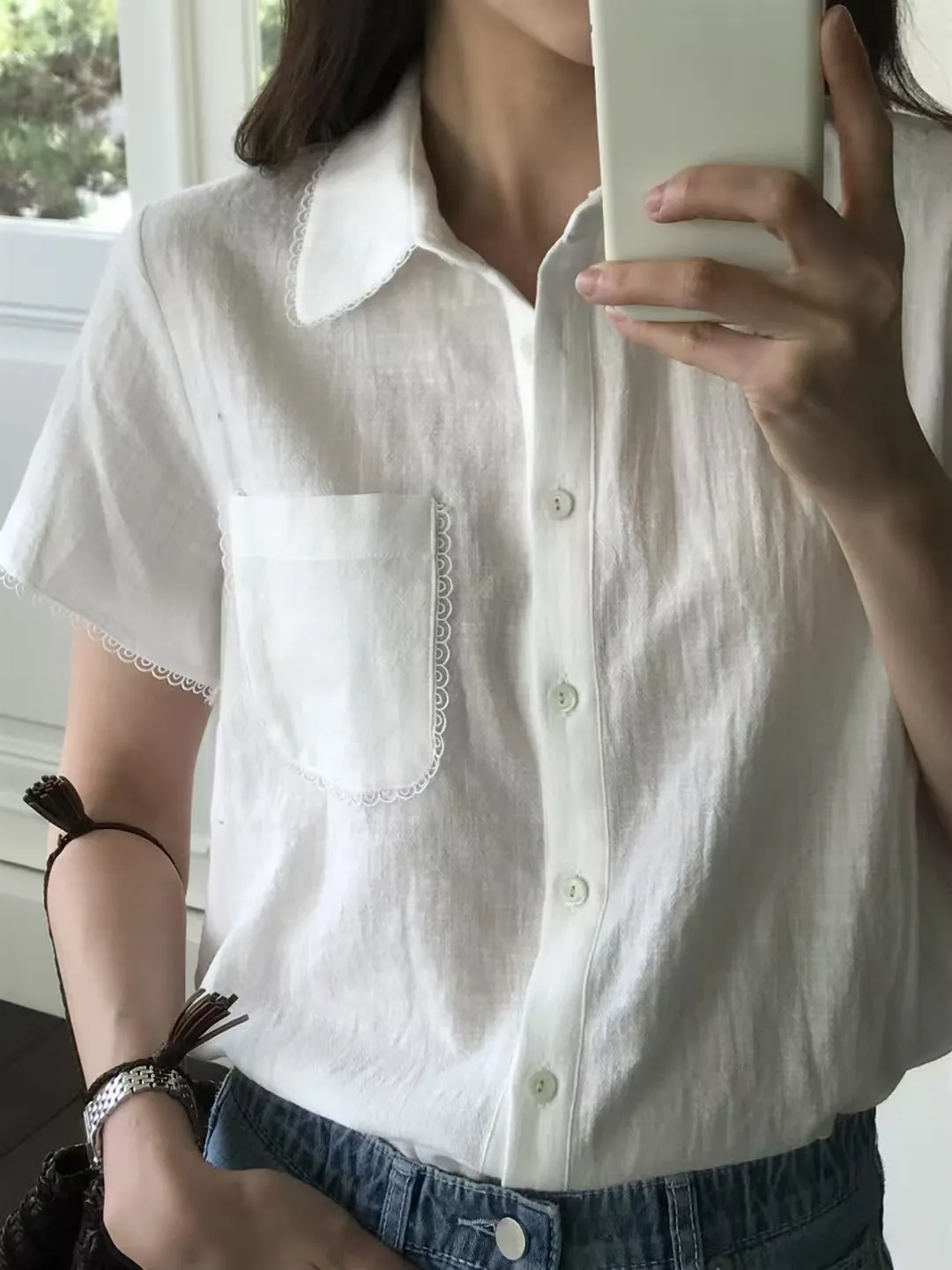 棉 排釦穿脫 胸前口袋 細緻蕾絲滾邊領口袖口 透氣舒適 適合夏天