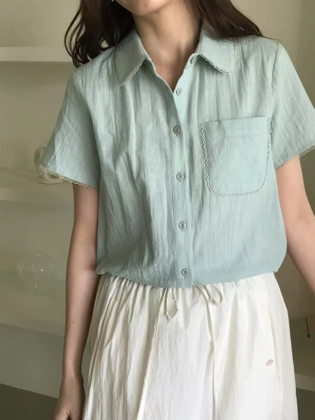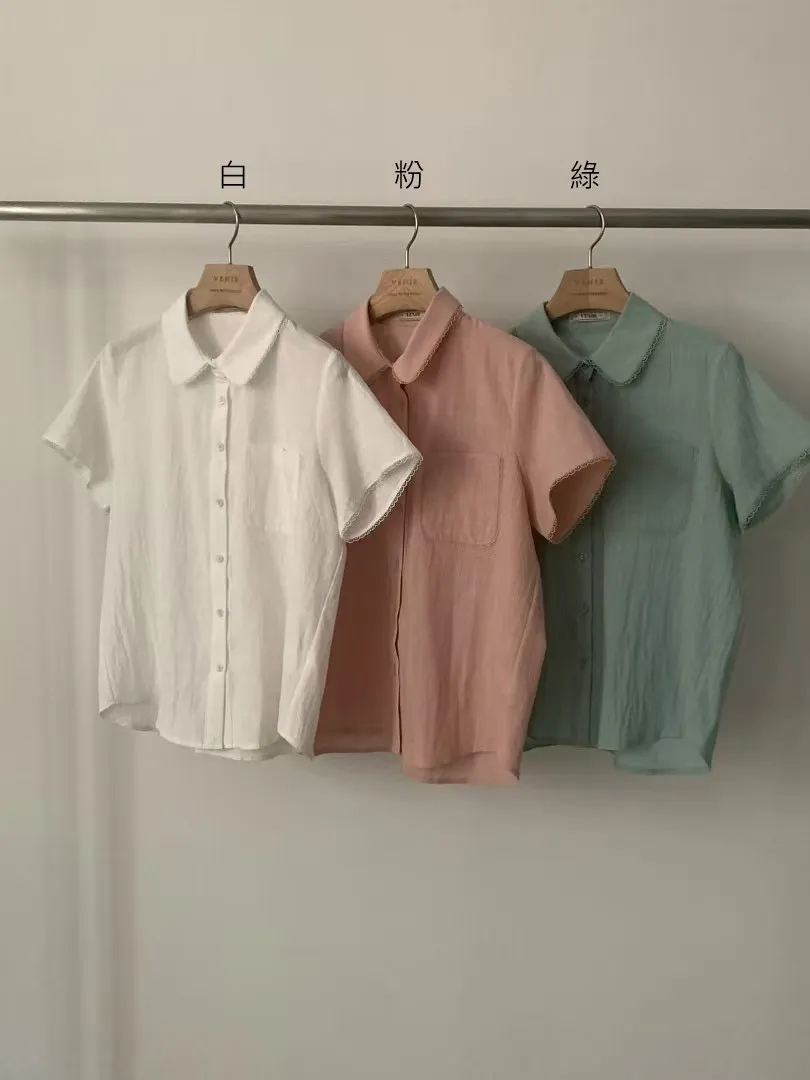 KB220細緻蕾絲滾邊翻領上衣 白 粉 綠 官網價$1170 線上價$1140