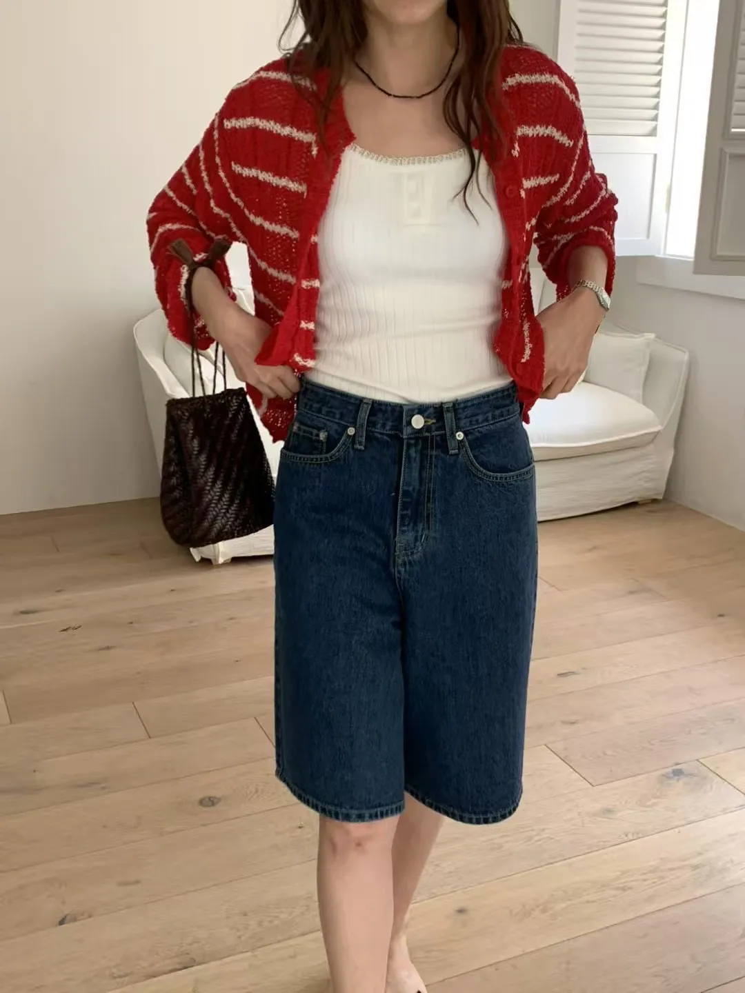 棉 釦鍊穿脫 有口袋 五分褲 中高腰版型 後腰皮革標 四季厚度