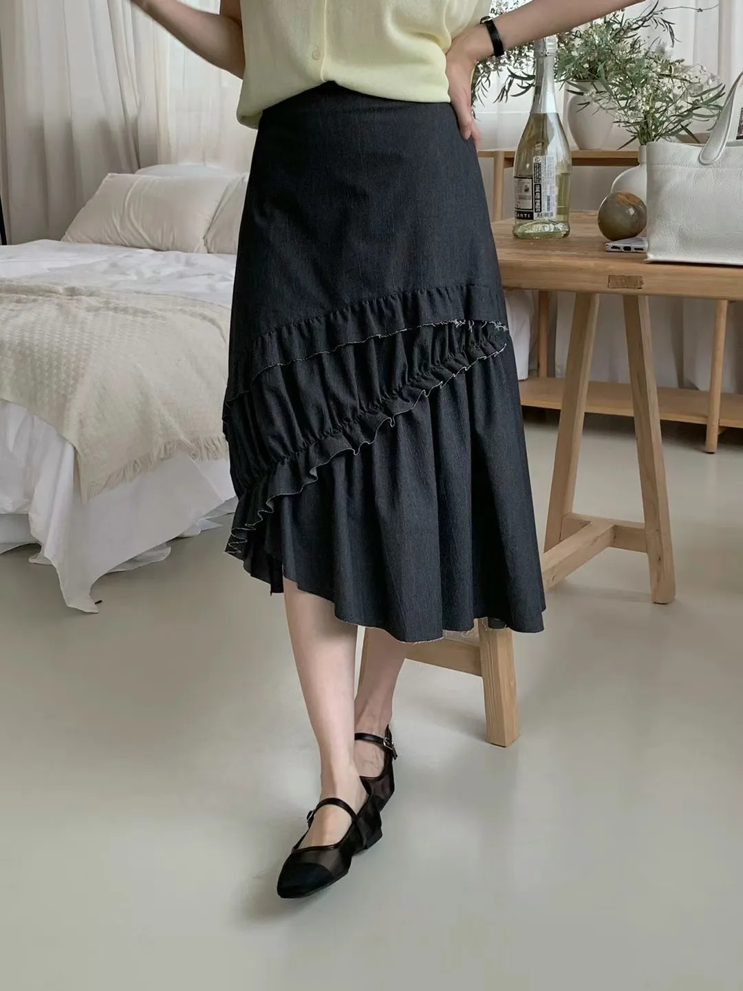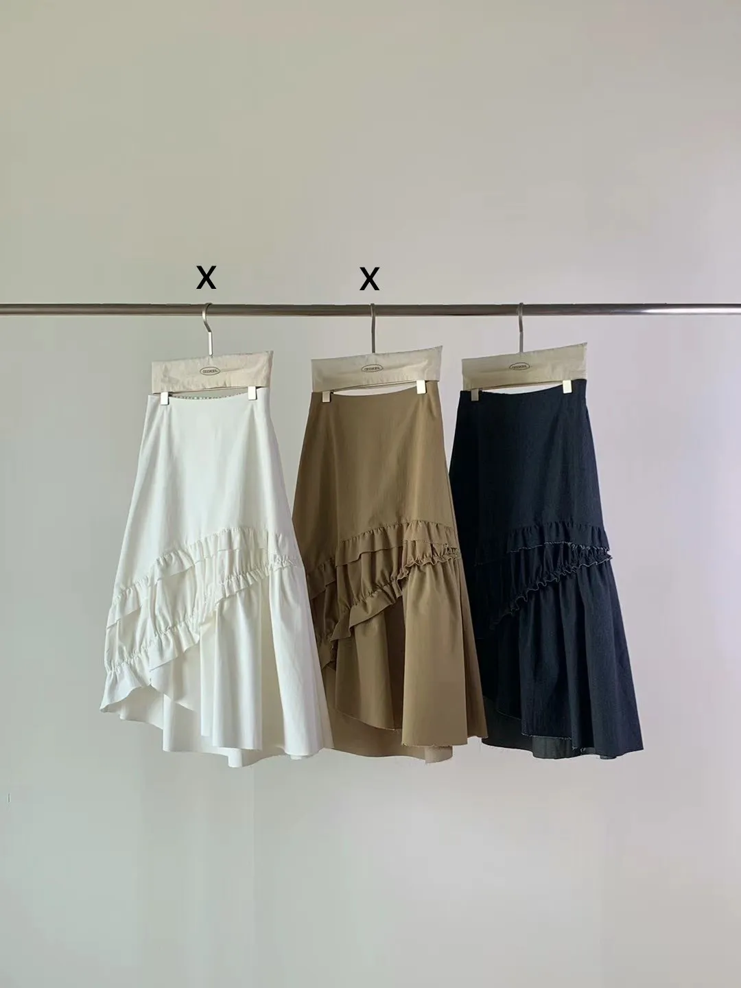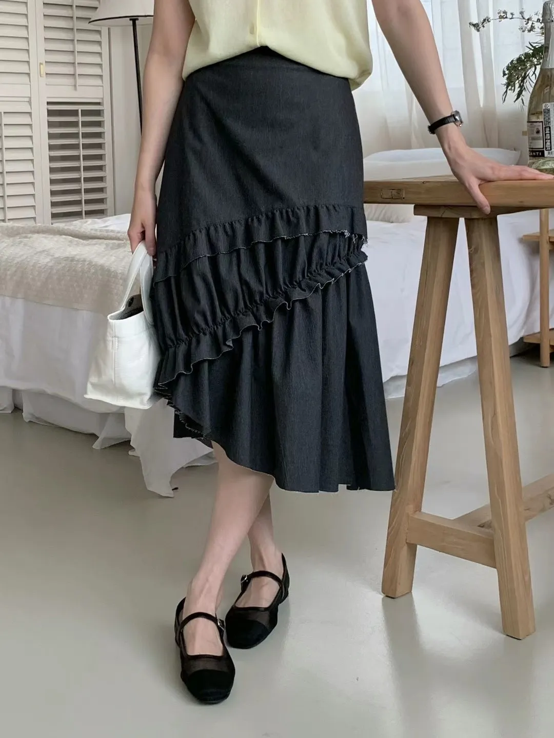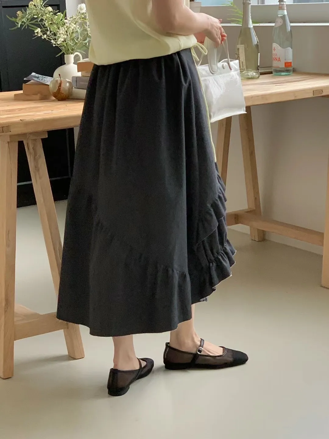 棉+彈力 後腰鬆緊 側拉鍊 不對稱裙擺