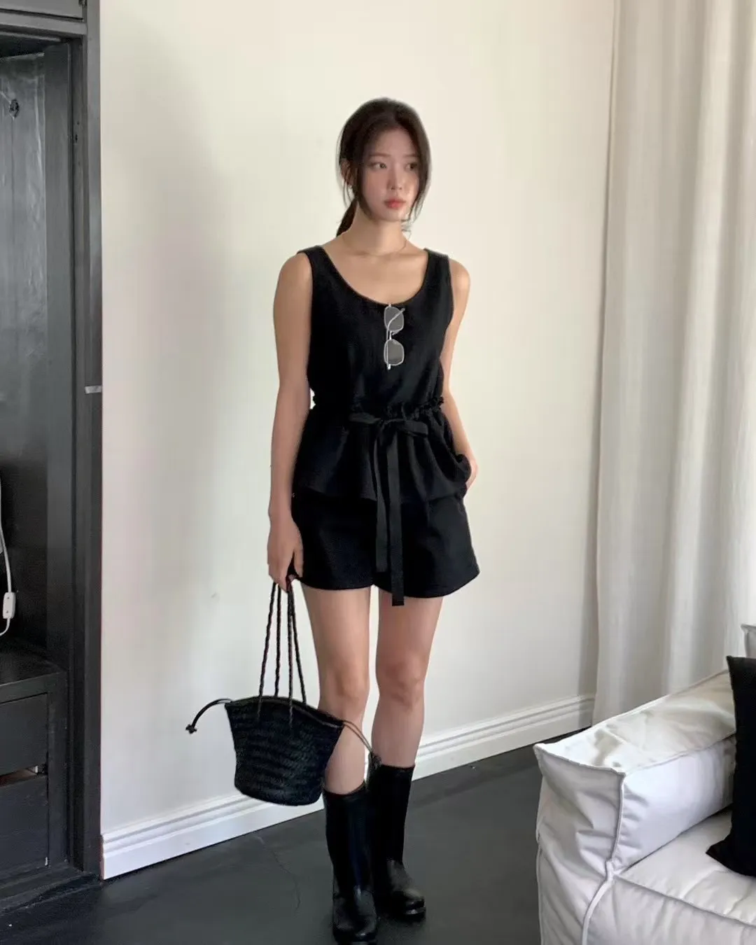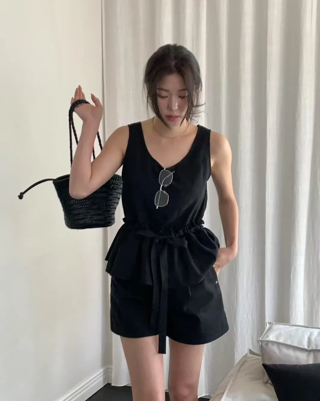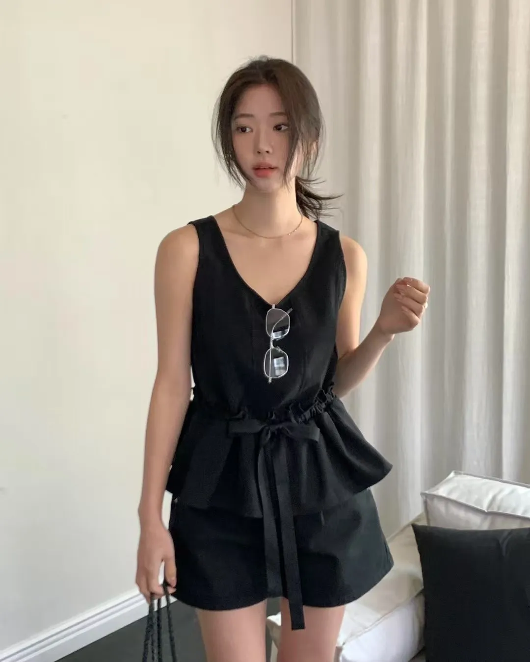 棉+亞麻 親膚舒適 前方領後V領 腰綁帶自然傘擺 夏天合適
