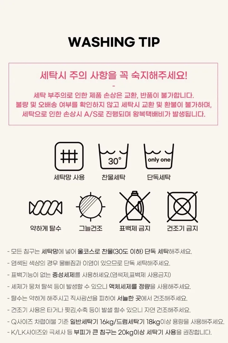 因洗滌不慎造成的產品損壞不能換貨或退貨。未檢查瑕疵或出貨錯誤 而洗滌的商品,不予退換貨。