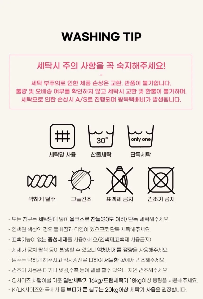- 雙人尺寸被子,一般洗衣機請使用16公斤以上容量/滾筒洗衣機請使用18公斤以上容量。