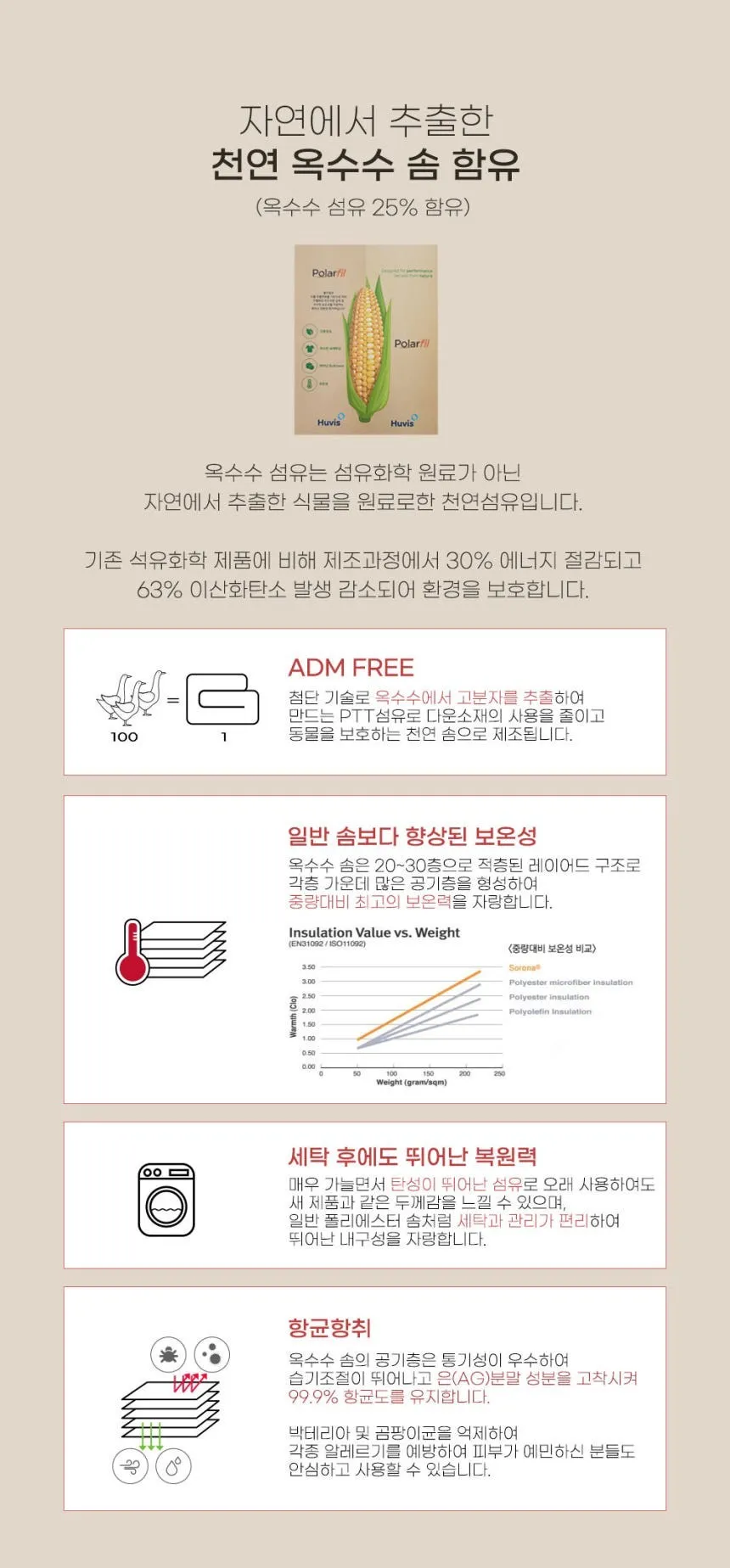 非常纖細且彈性卓越的纖維,長時間使用也能感受到與新產品相同的厚度感,像普通滌綸棉一樣洗滌和管理便利,擁有卓越的耐久性