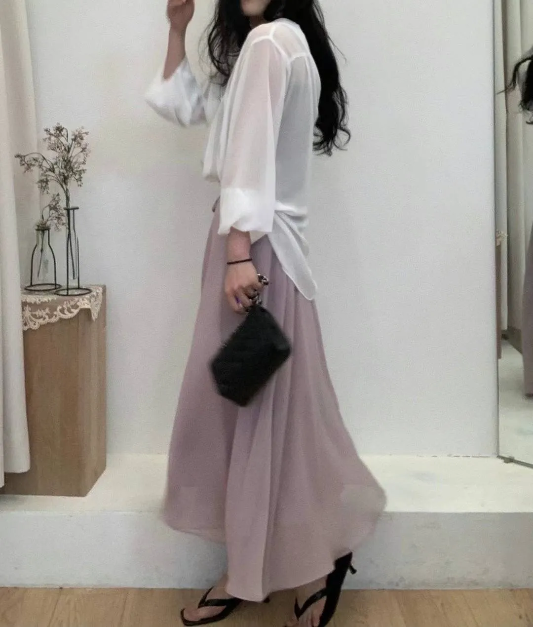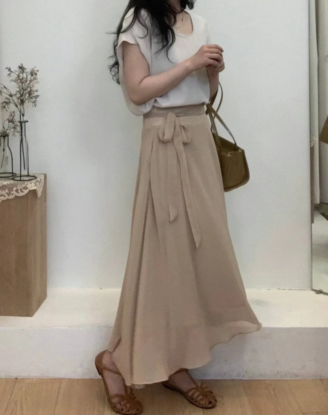 高級雪紡 後拉鍊穿脫 有口袋 腰綁帶 高腰裙 有內裡 紗質感 不規則飄逸裙擺