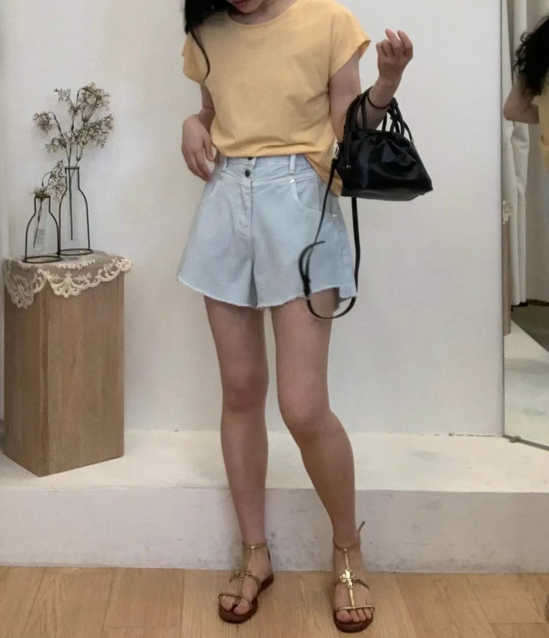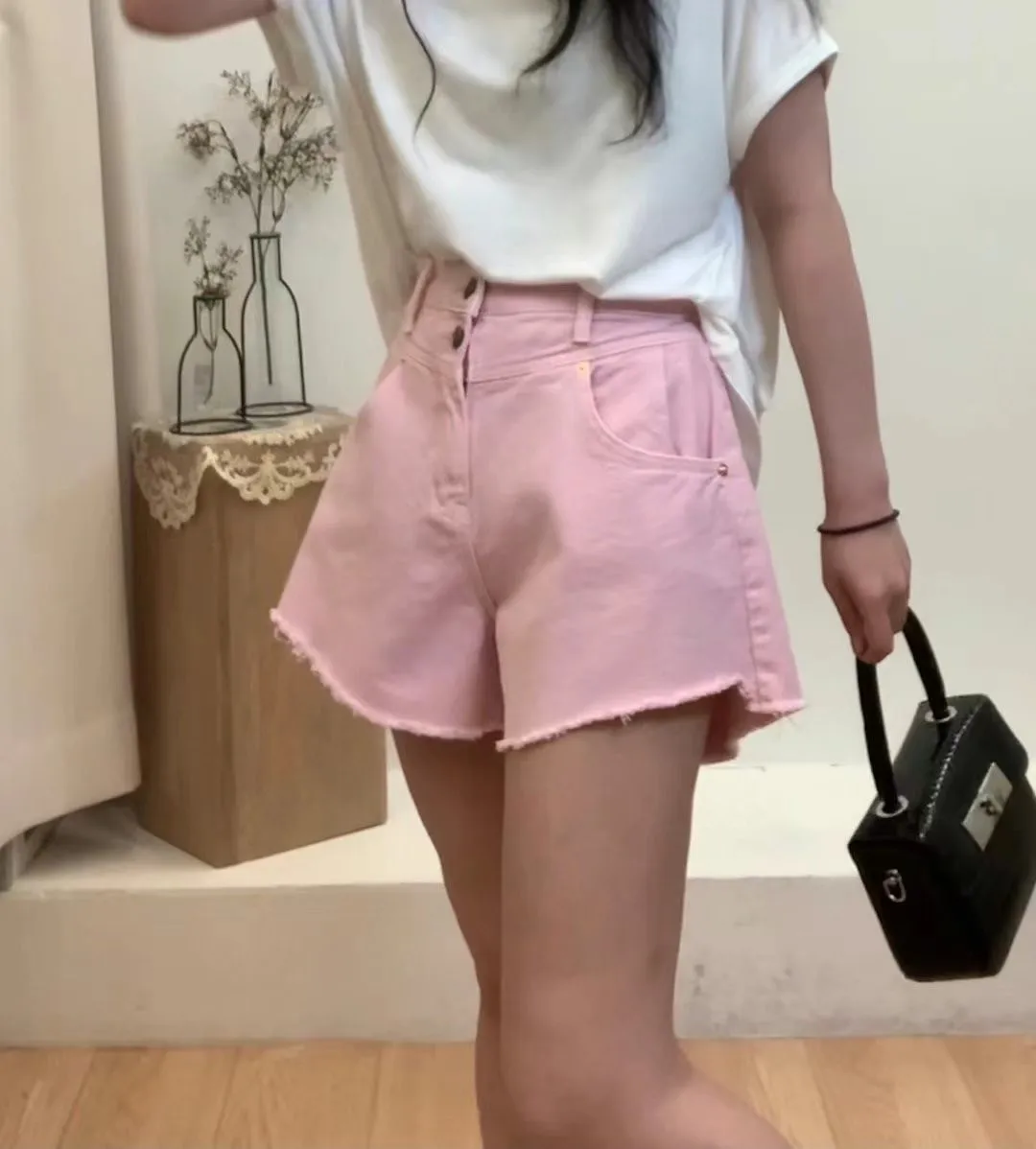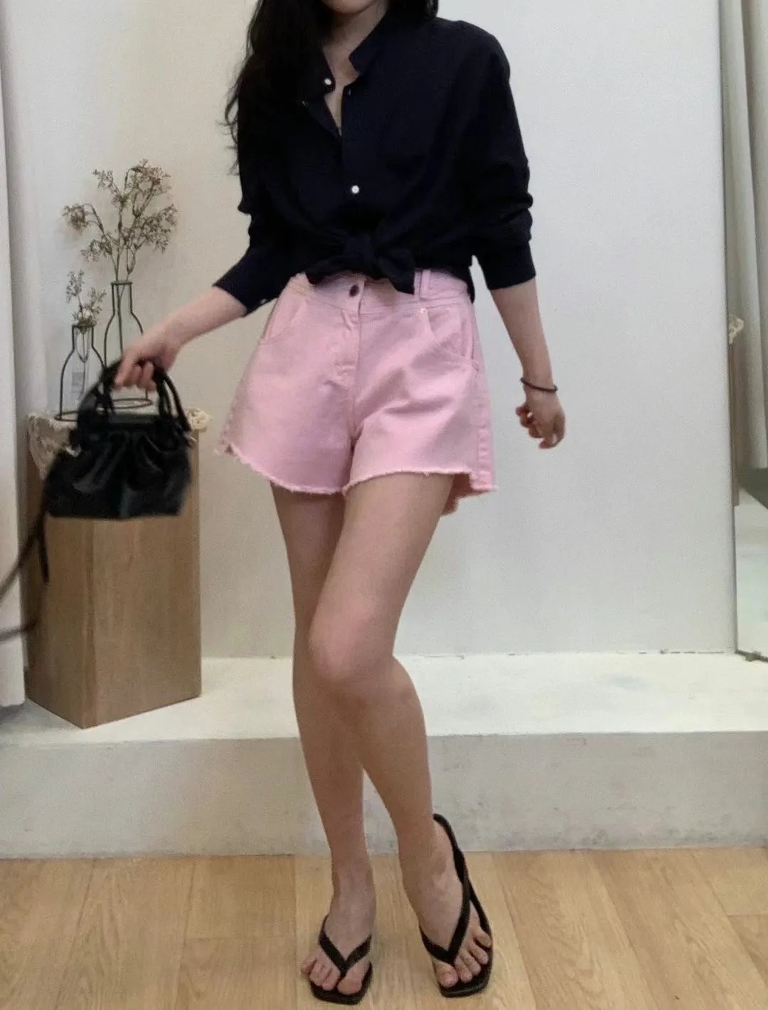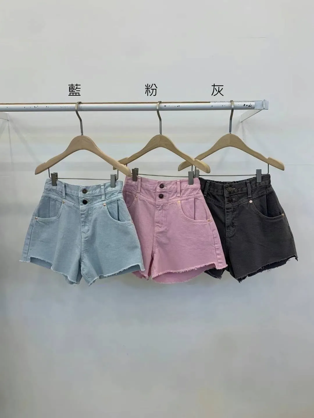 KM047不收邊雙釦牛仔Aline短褲 藍 粉 灰 S M L 官網價$1090 線上價$1060