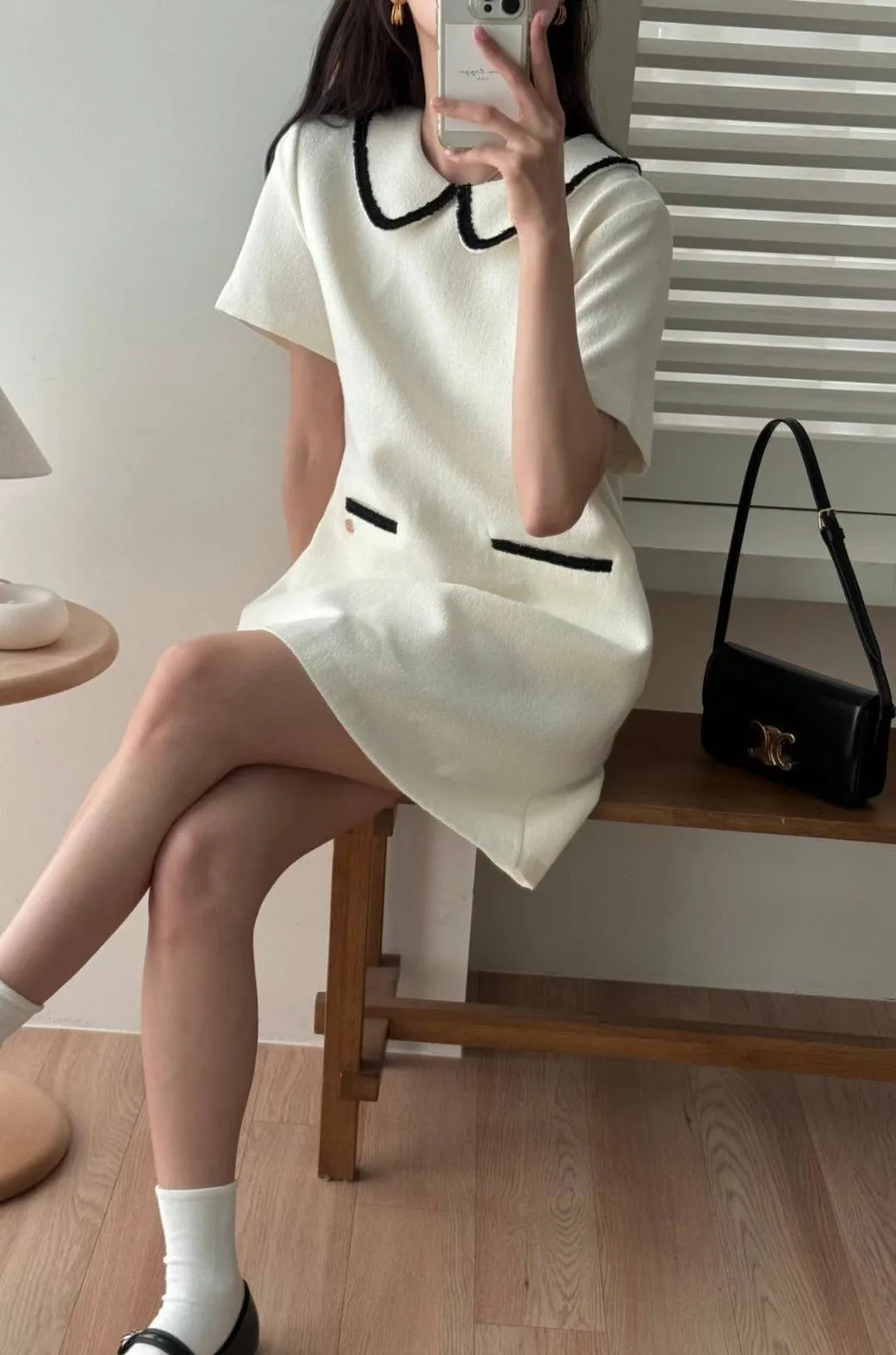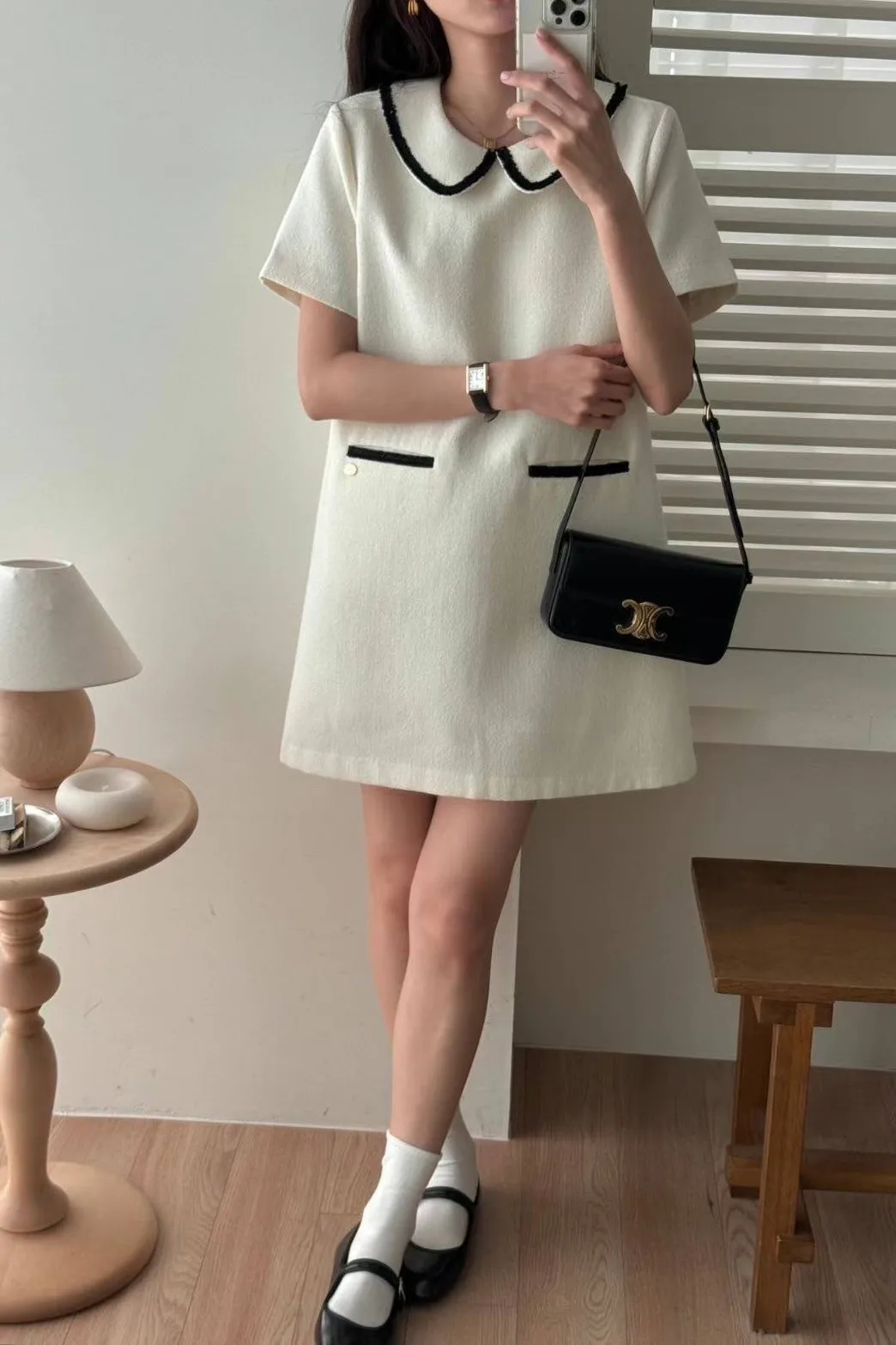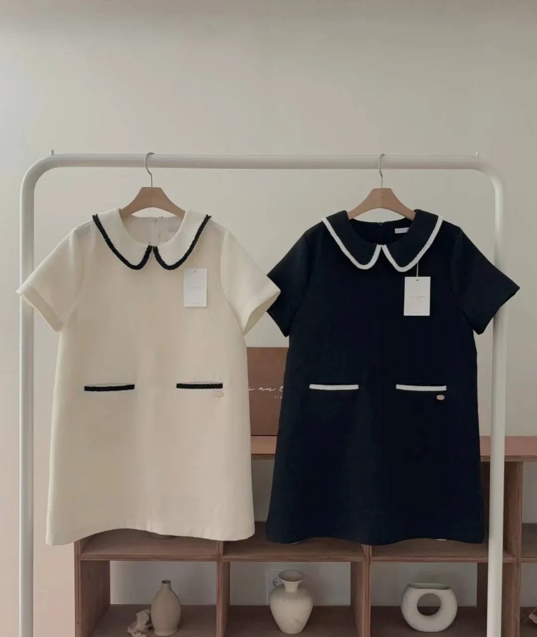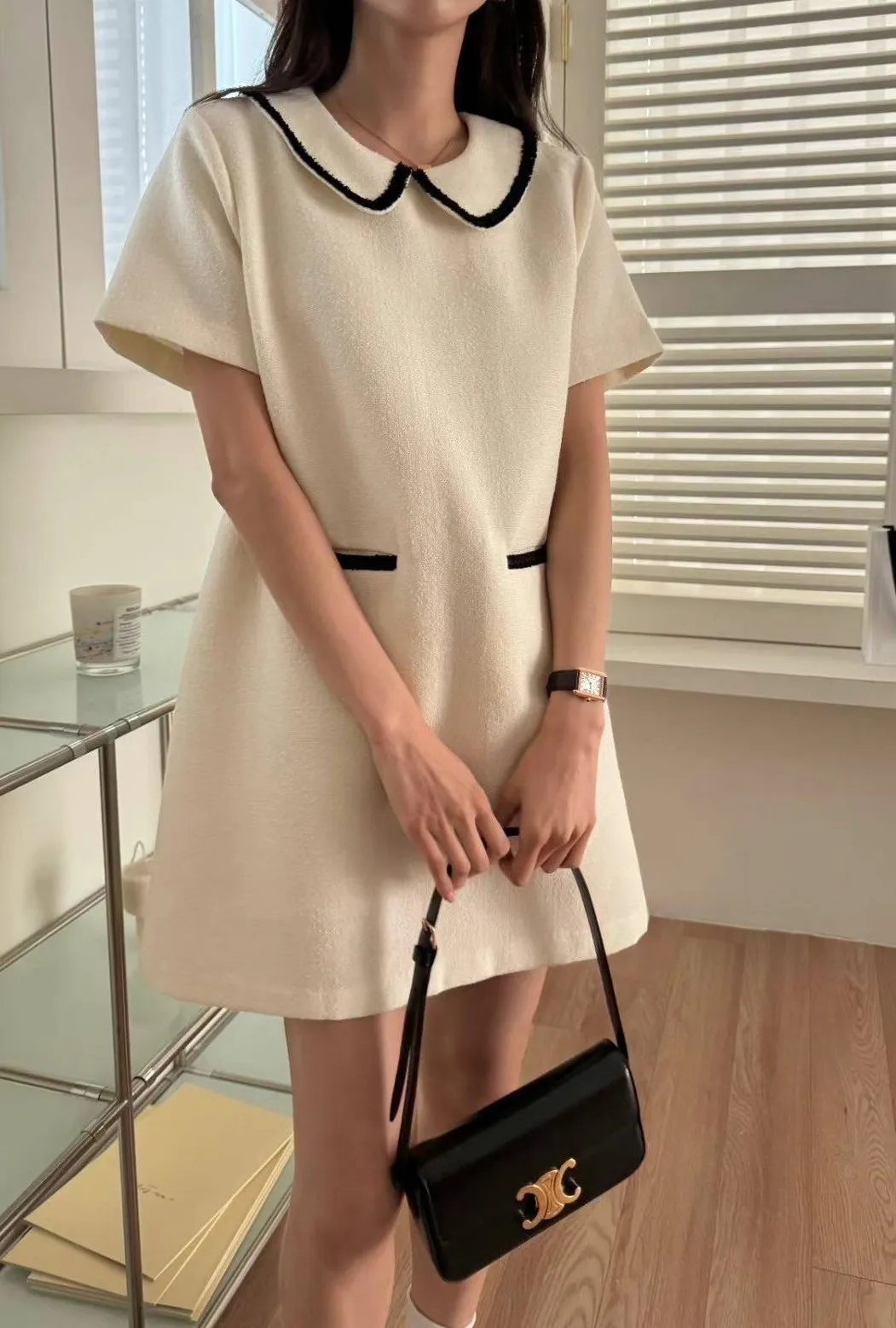 KM161滾邊跳色翻領小香風洋裝 米 黑 官網價$1660  線上價$1630