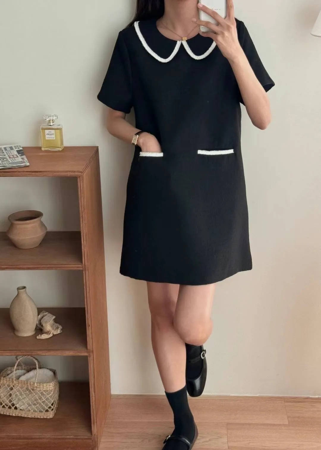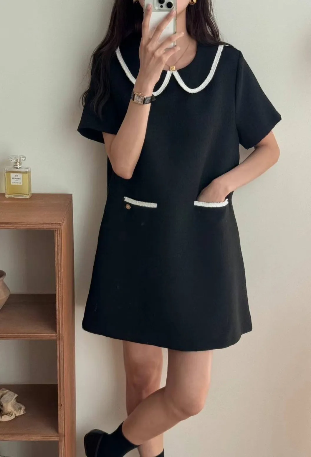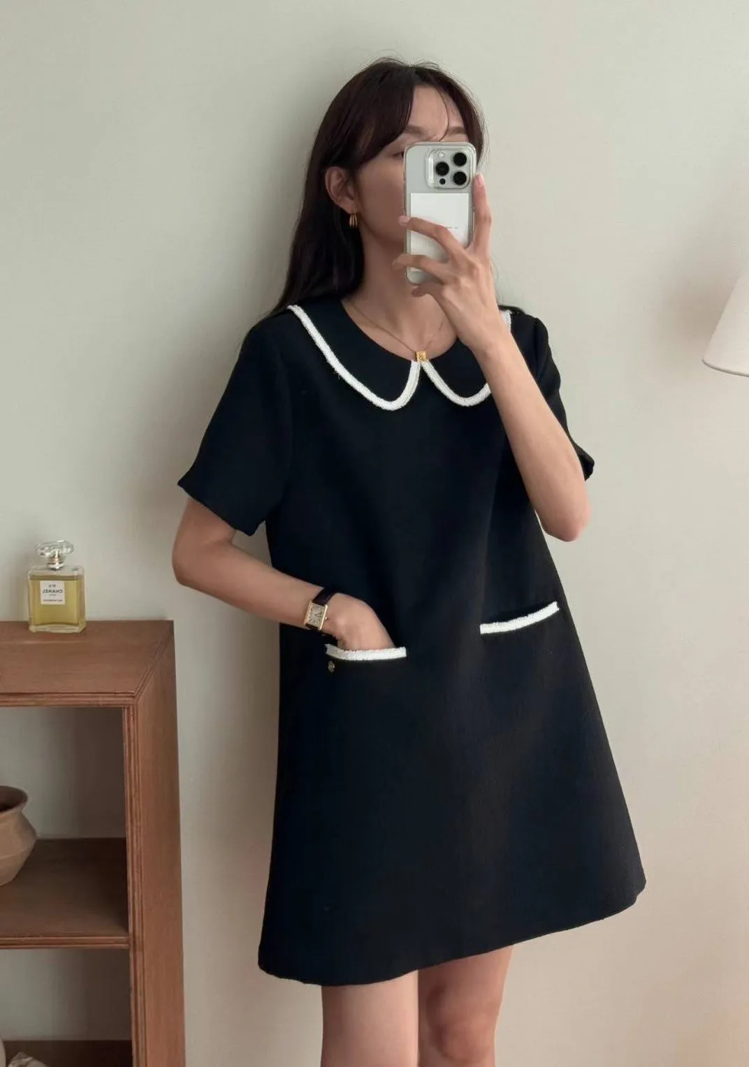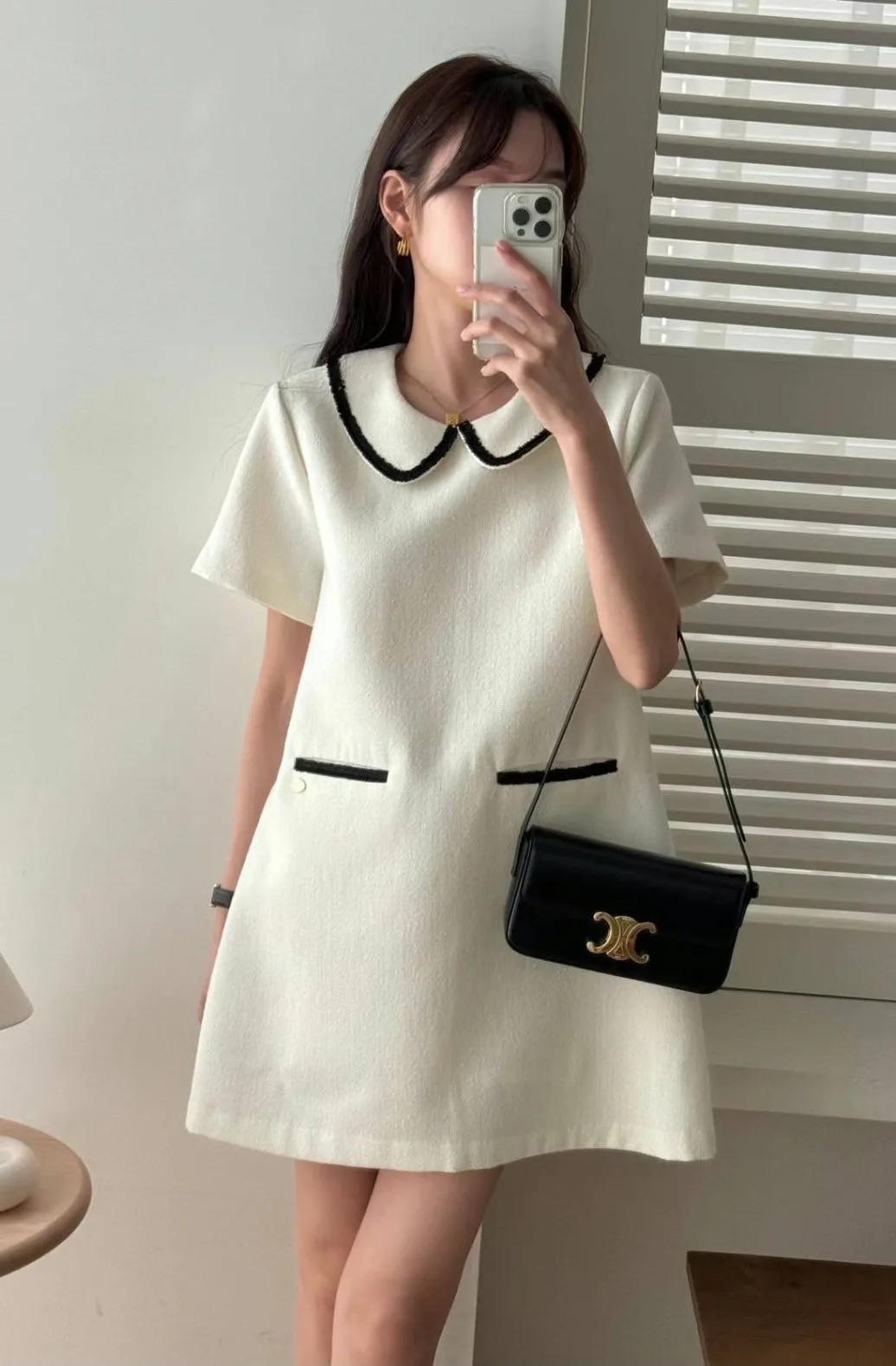 KM161滾邊跳色翻領小香風洋裝 米 黑 官網價$1660  線上價$1630
