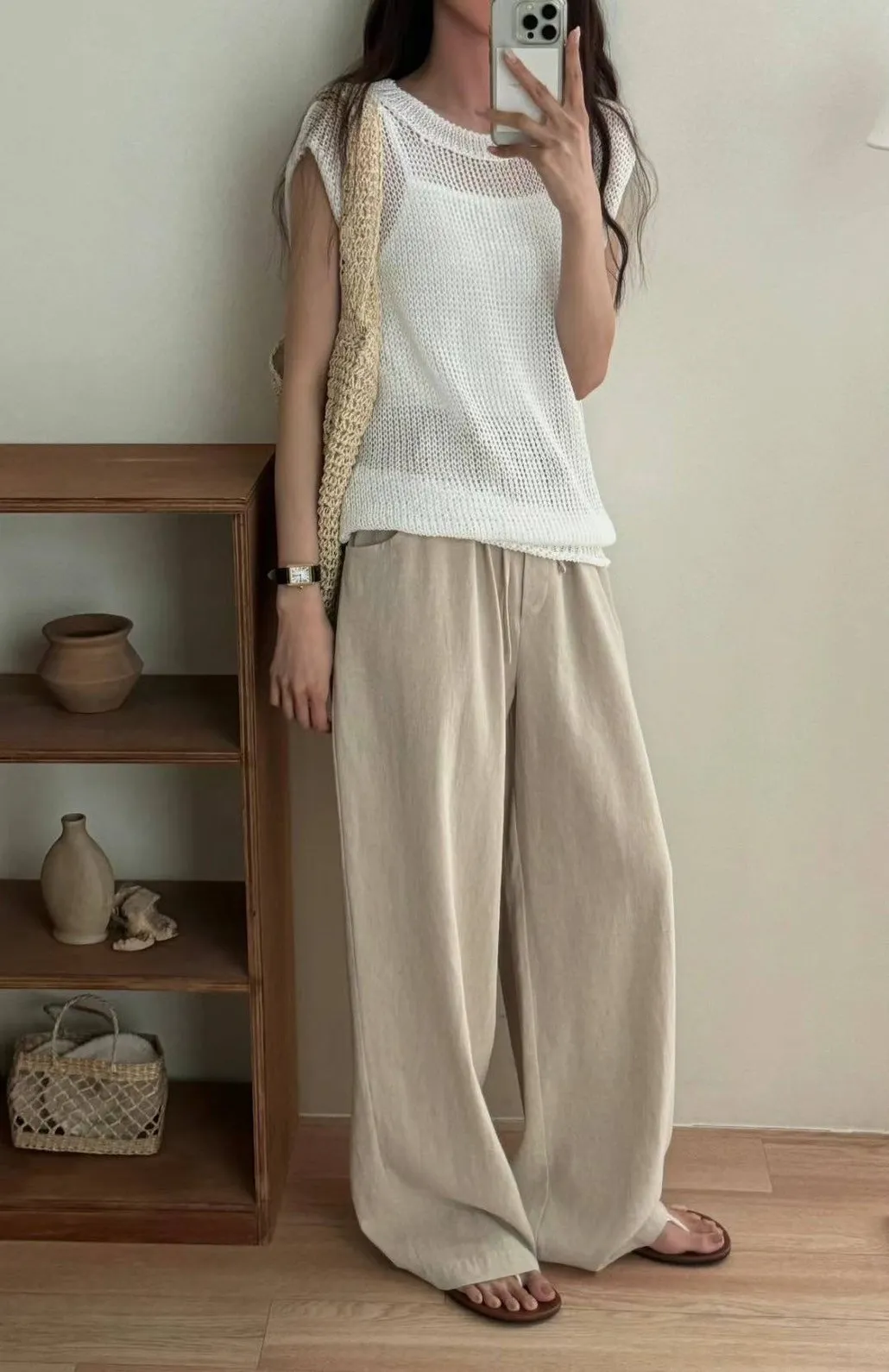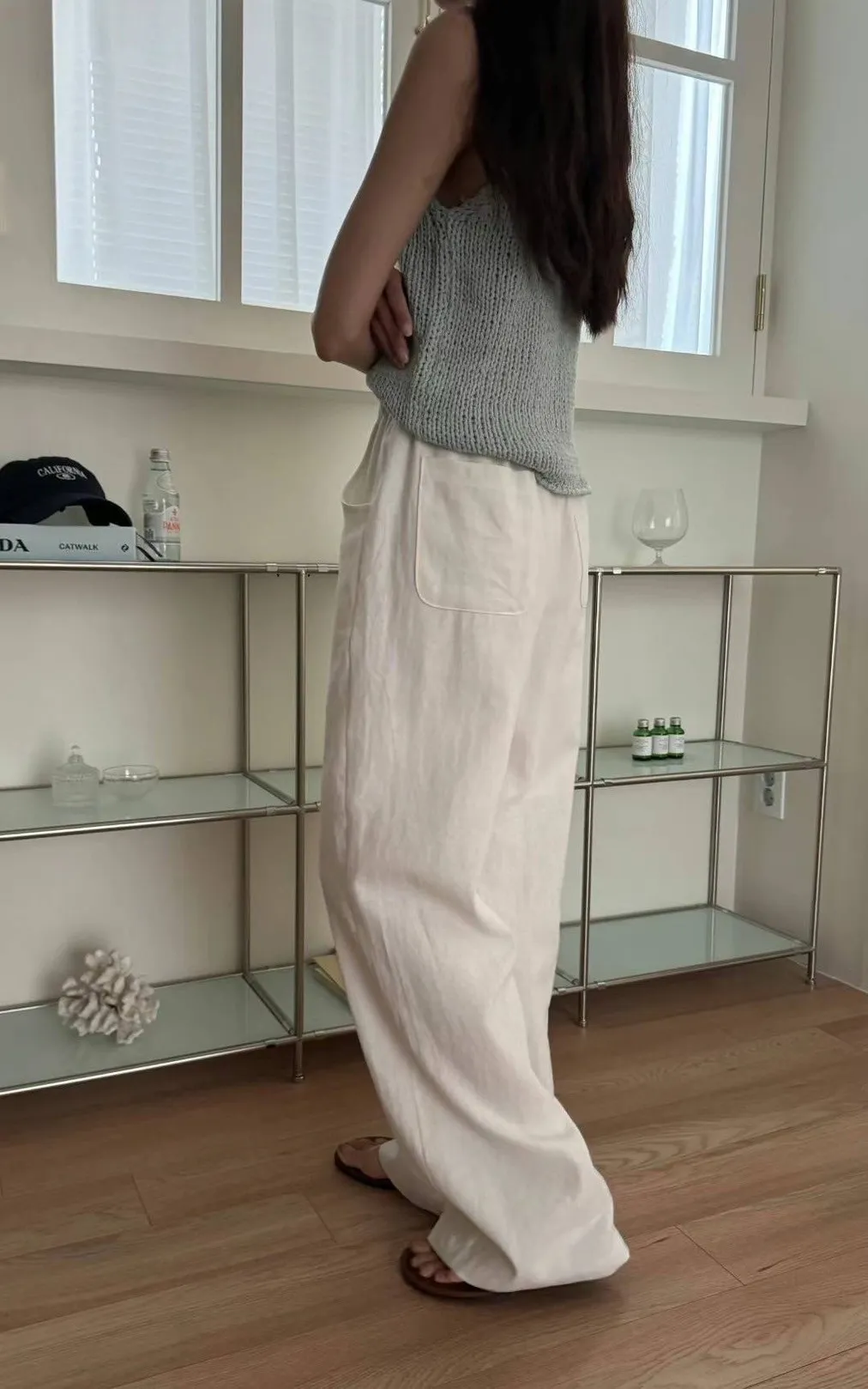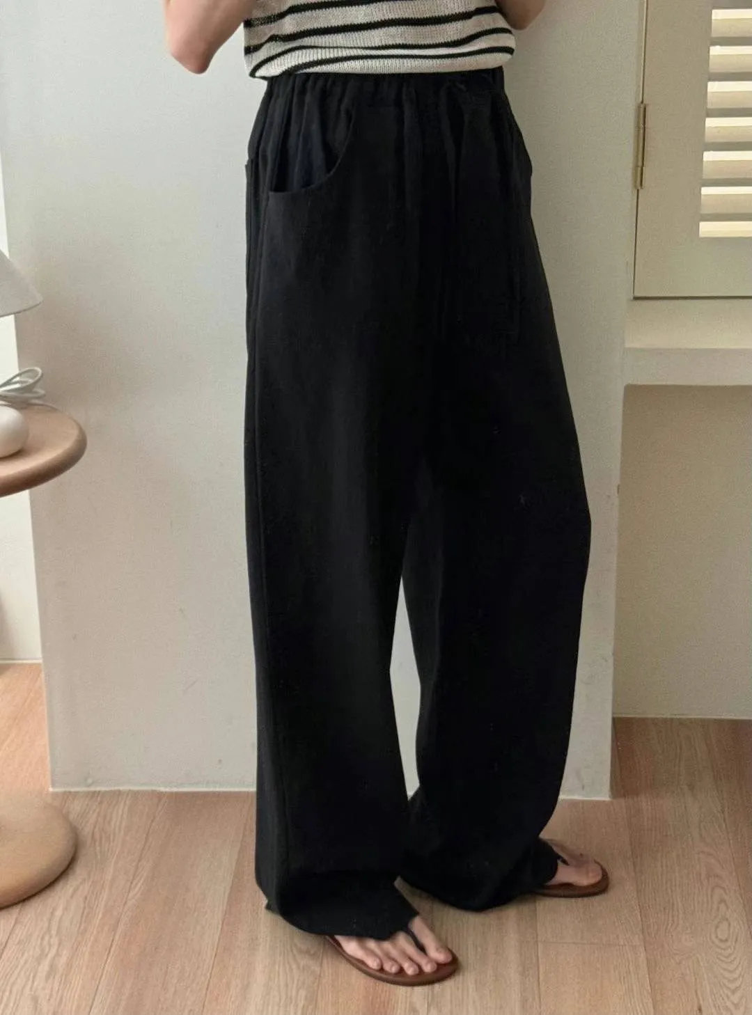 棉+亞麻 腰前有鈕扣 全腰鬆緊 有口袋