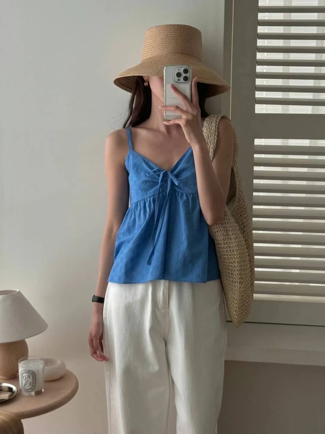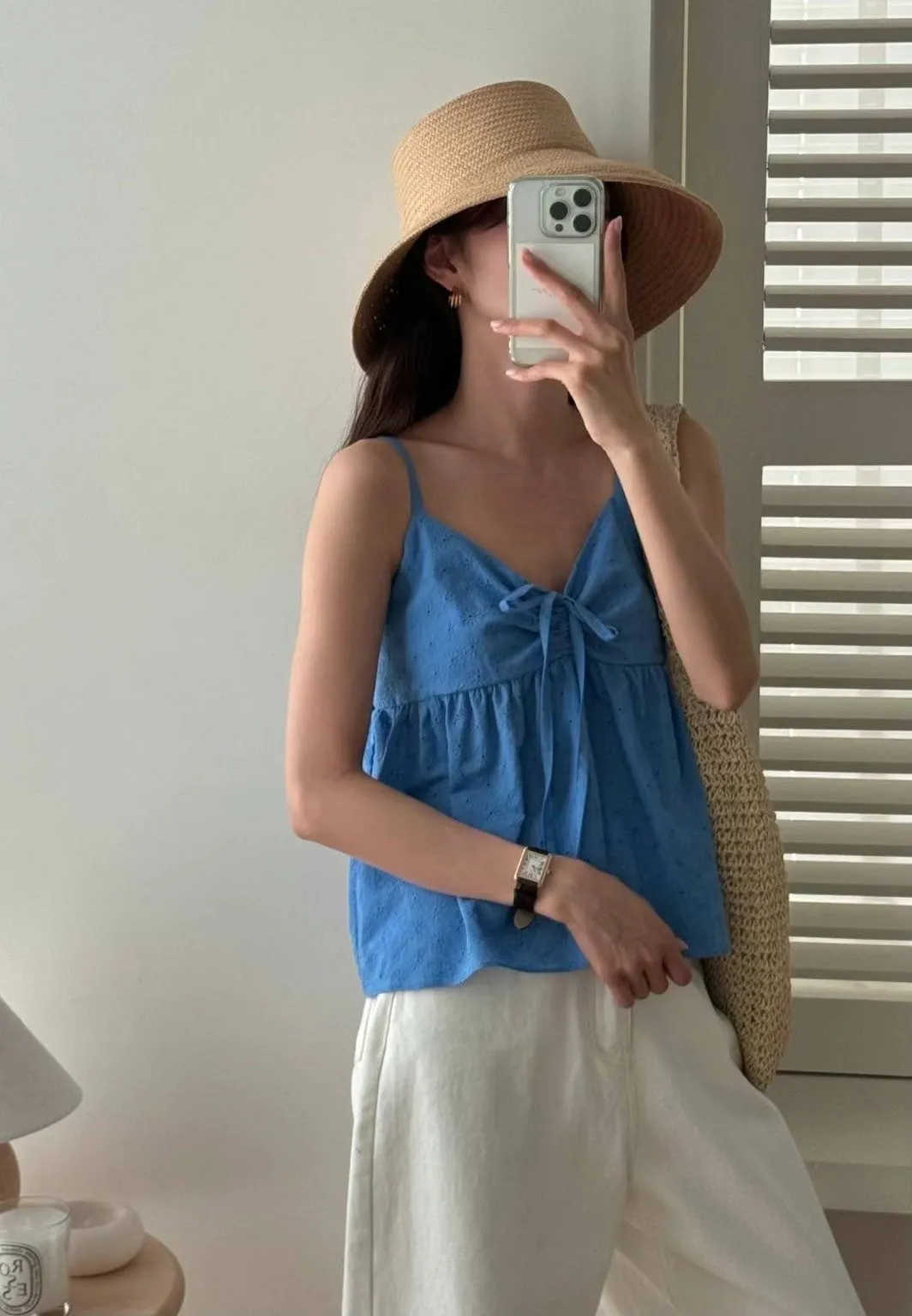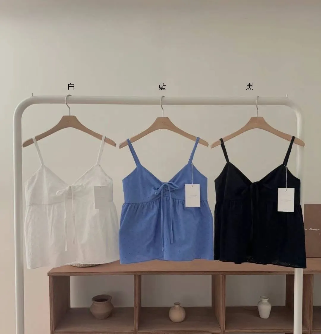 KM167細肩帶胸綁帶雕花上度假上衣 白 藍 黑 官網價$990  線上價$960