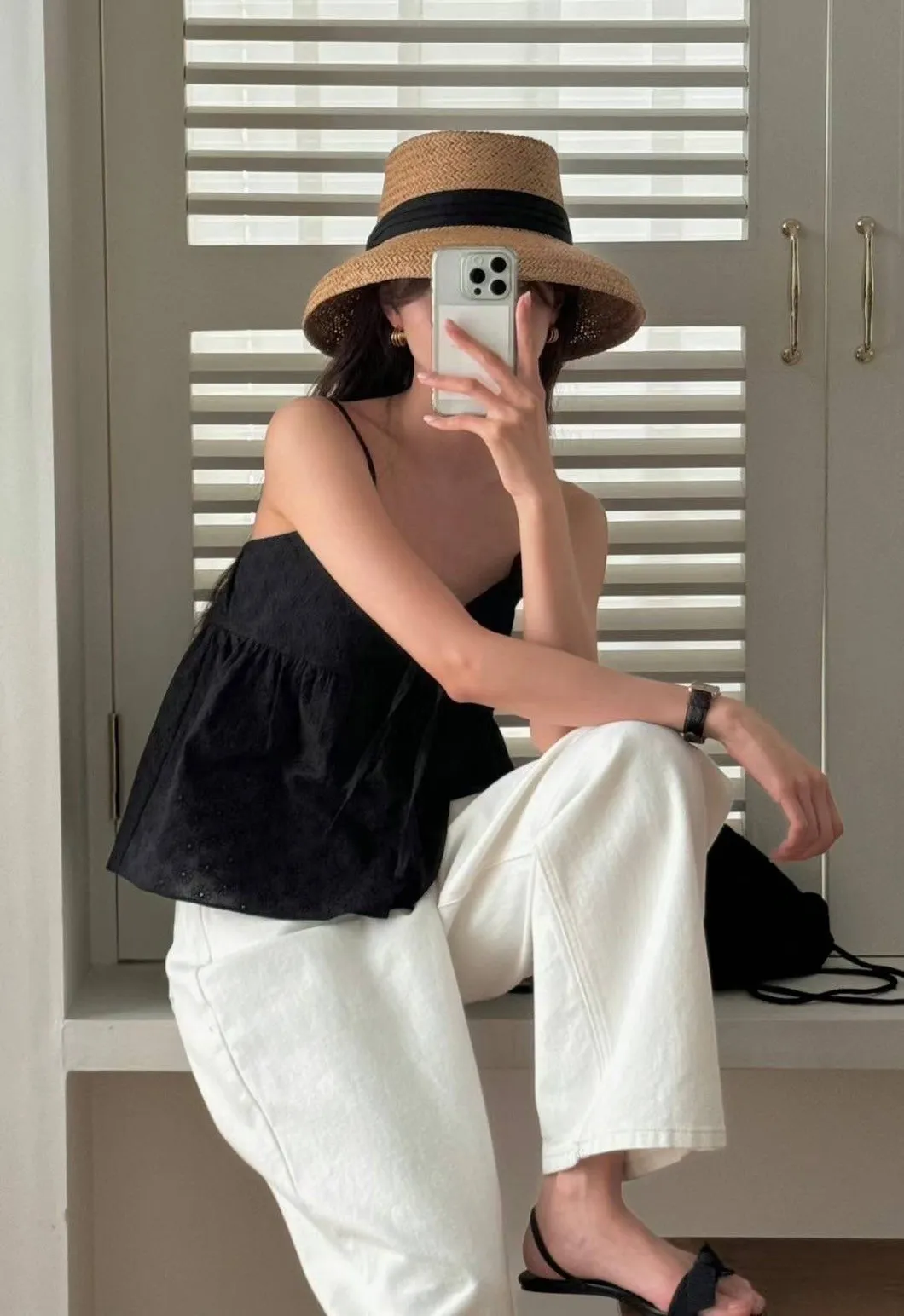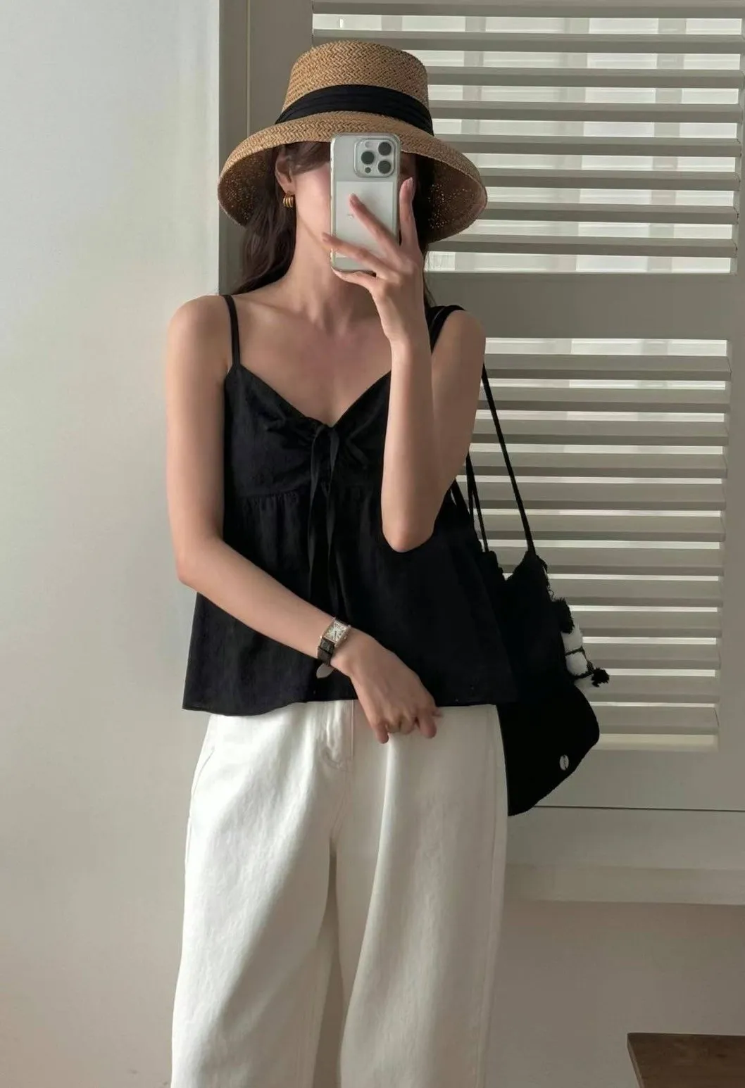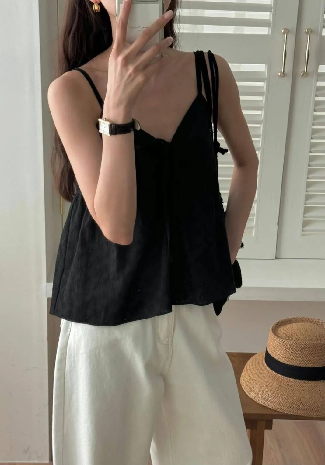 KM167細肩帶胸綁帶雕花上度假上衣 白 藍 黑 官網價$990  線上價$960