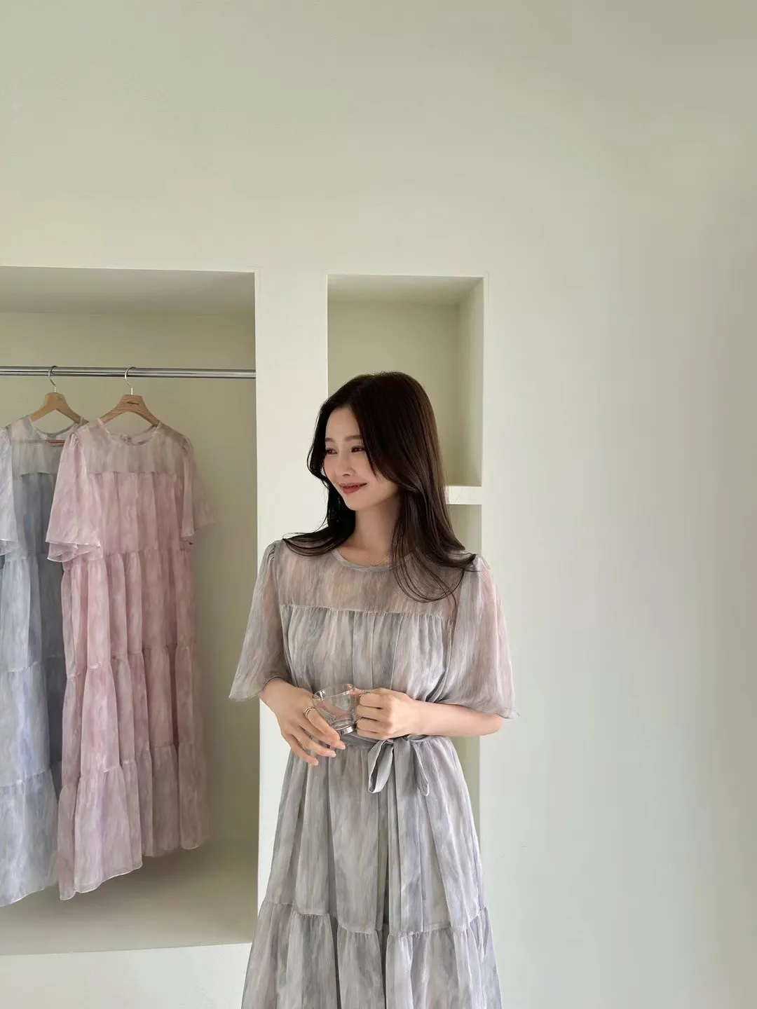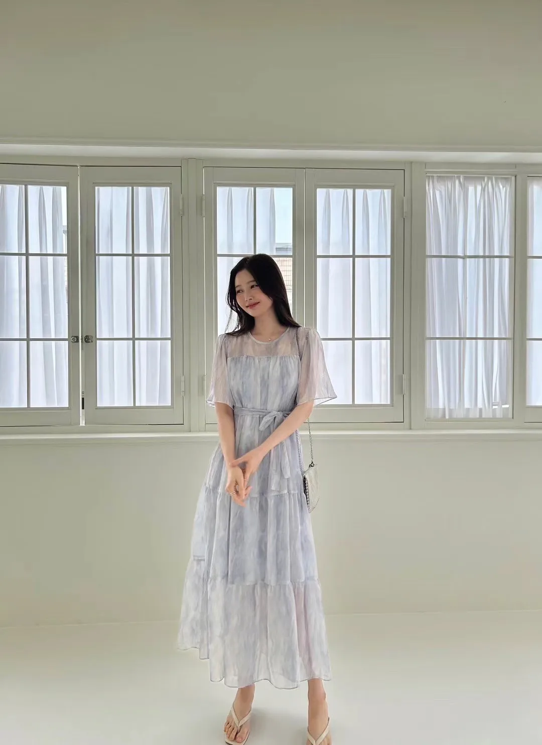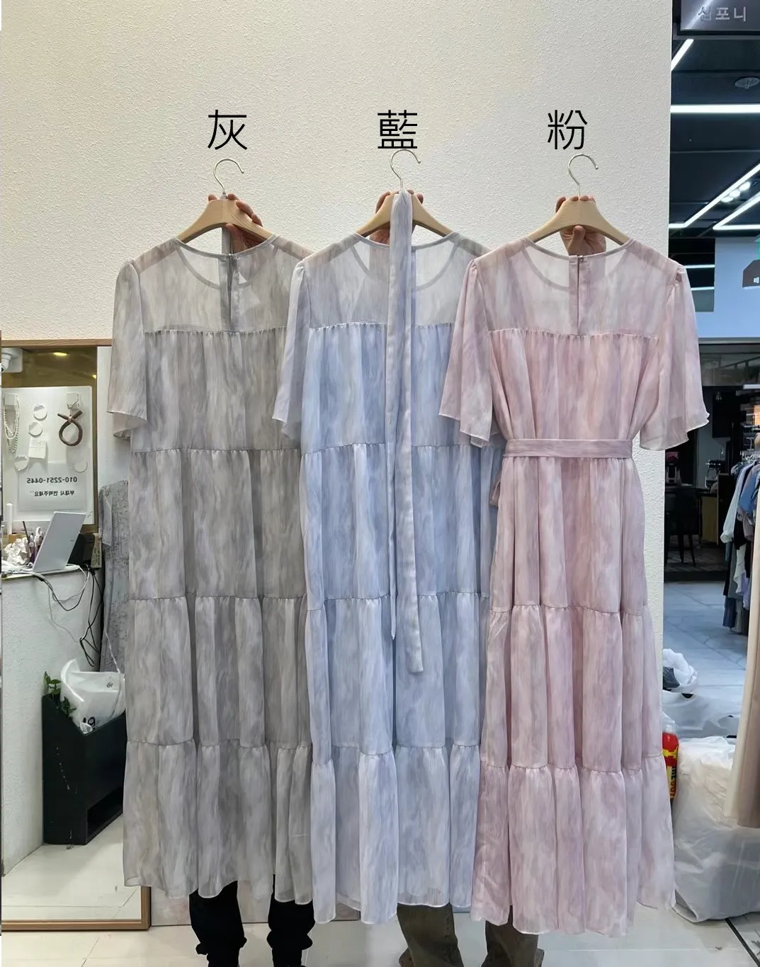 KM188 若隱若現氣質胸透膚洋裝(附綁帶) 灰 藍 粉 官網價$1490 線上價$1460雪紡 自然垂墜飄逸 有腰綁帶 層次暈染色 輕盈有內裡