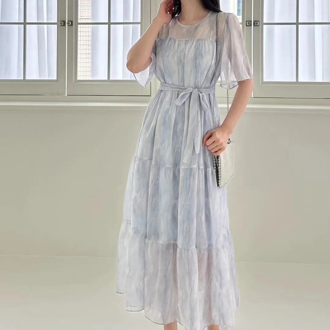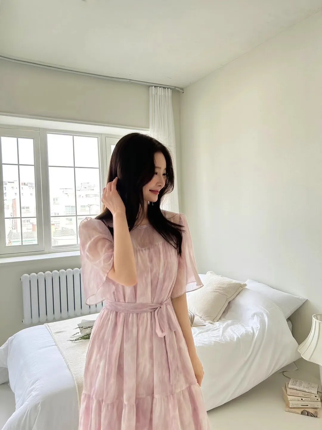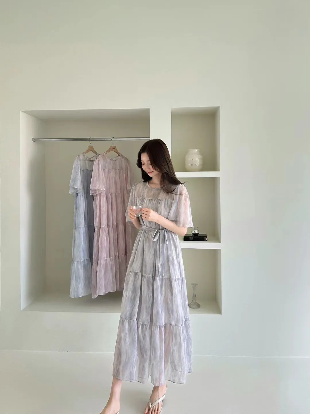 KM188 若隱若現氣質胸透膚洋裝(附綁帶) 灰 藍 粉 官網價$1490 線上價$1460雪紡 自然垂墜飄逸 有腰綁帶 層次暈染色 輕盈有內裡