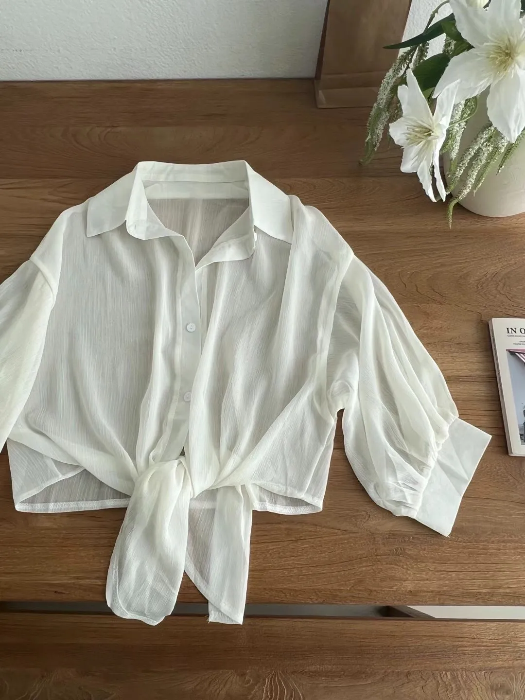 KM197視覺透光襯衫式罩衫 白 米 黑 官網價$890 線上價$860雪紡 髮絲紋理 下擺可綁蝴蝶結 輕盈飄逸
