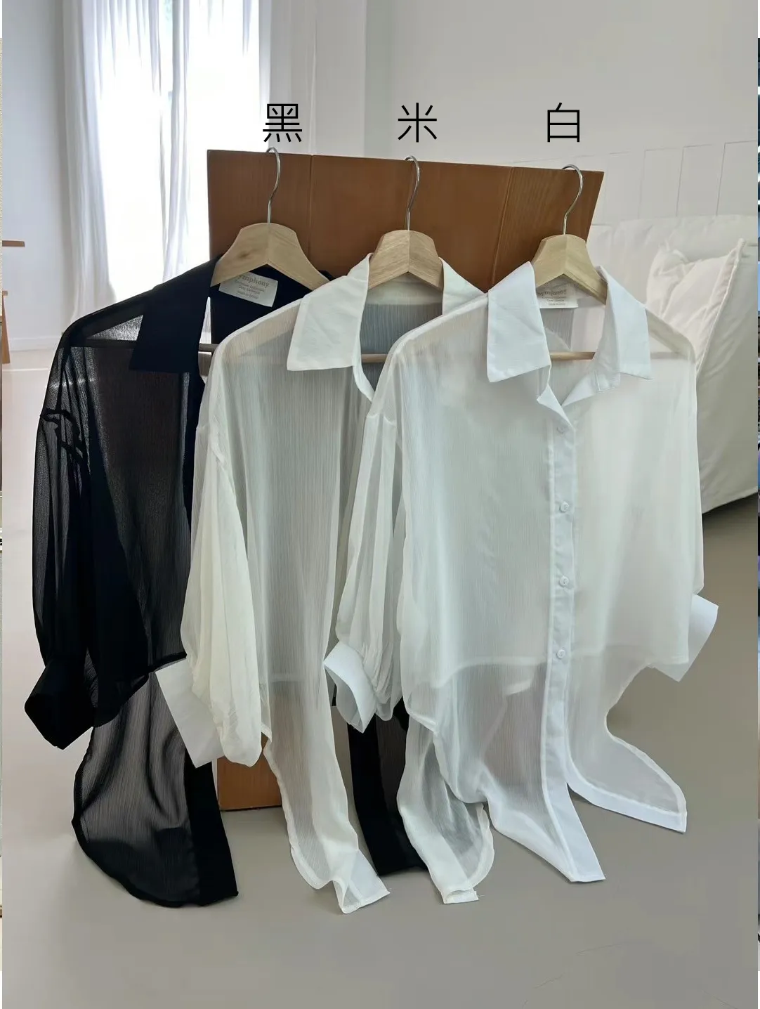 KM197視覺透光襯衫式罩衫 白 米 黑 官網價$890 線上價$860