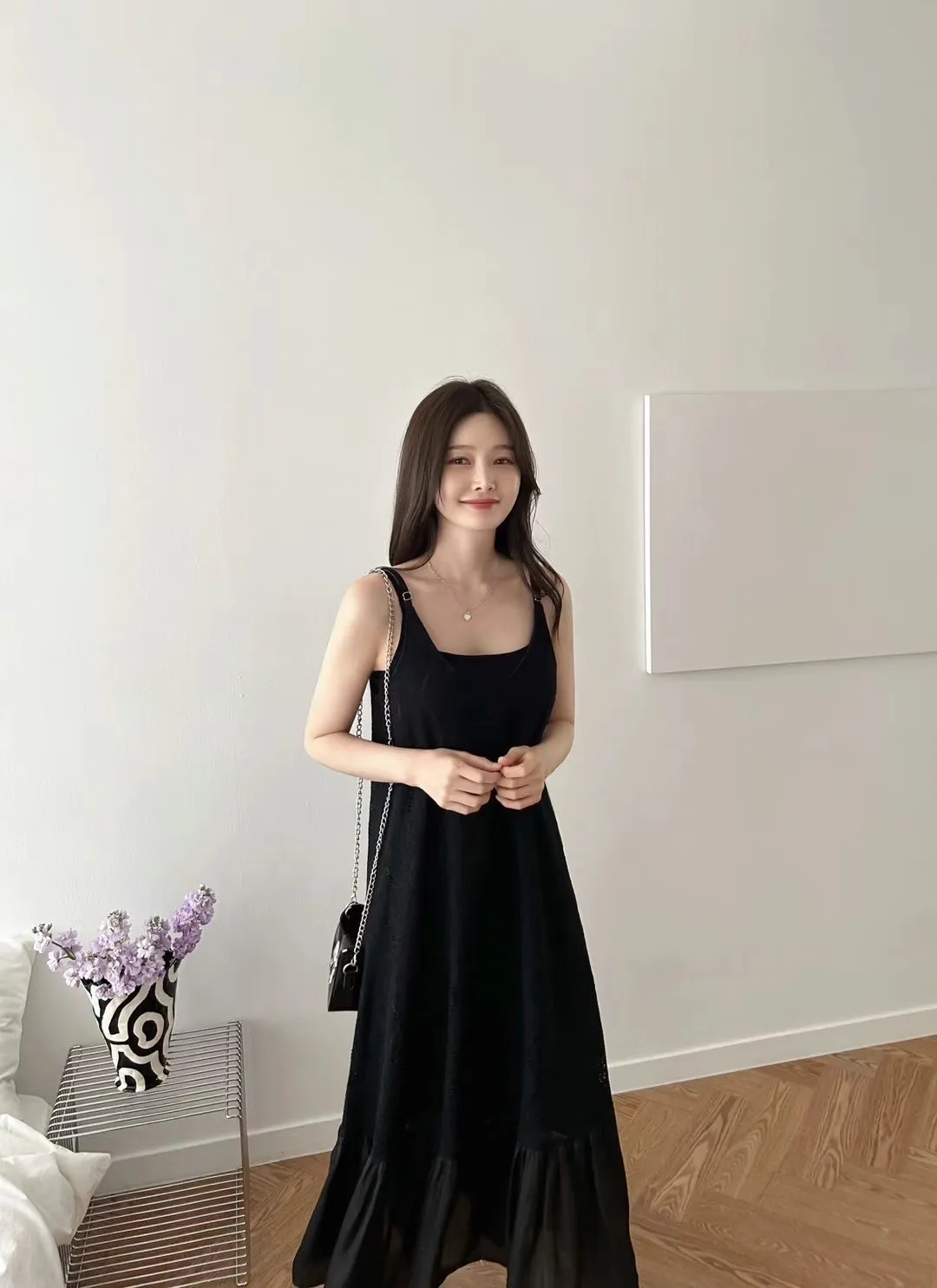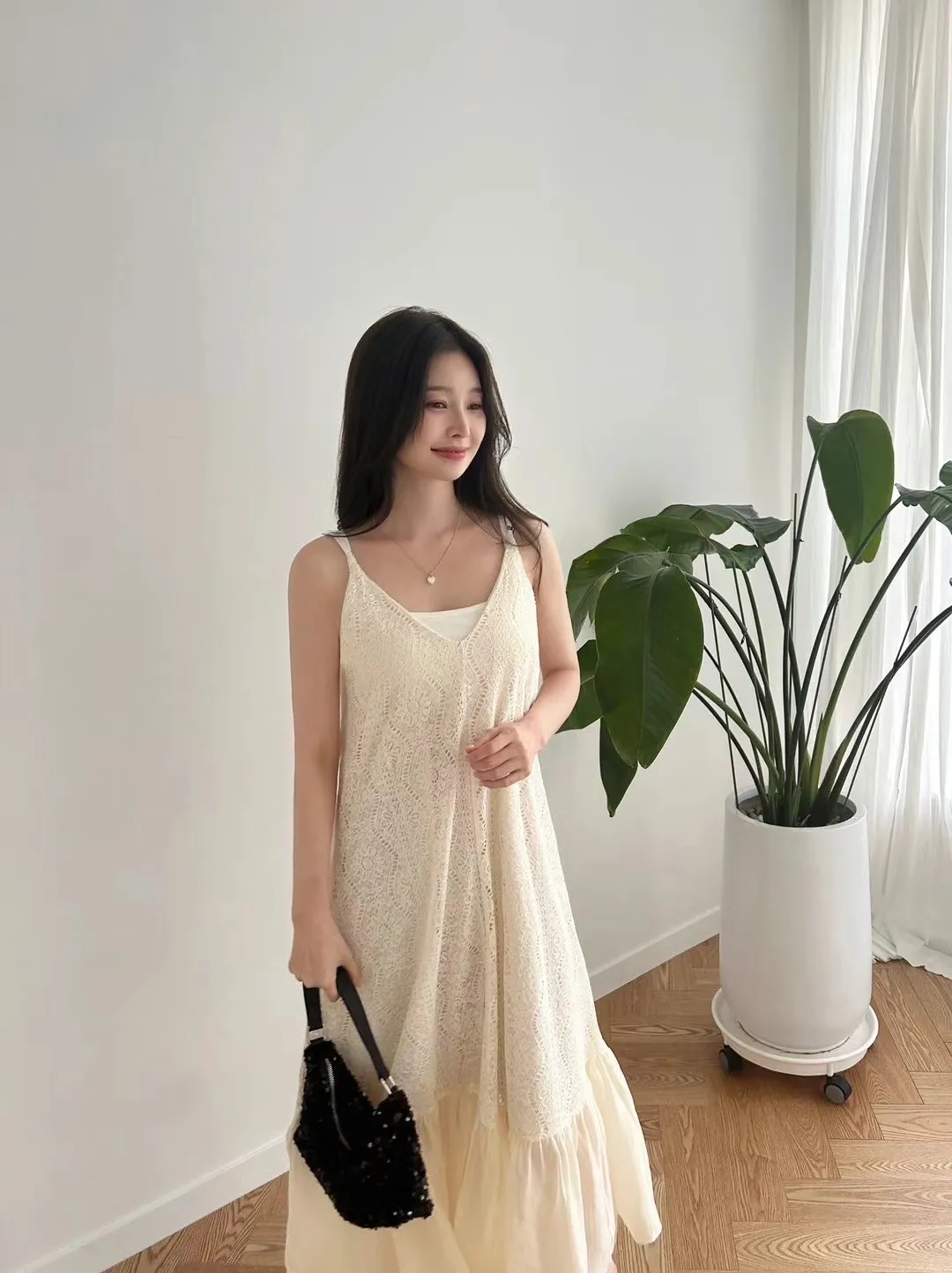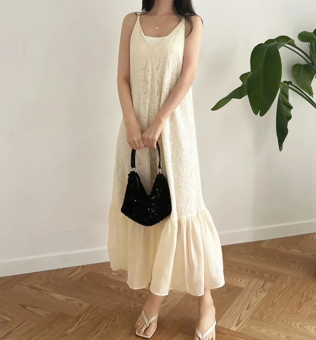KM200細肩帶蕾絲薄紗下擺洋裝 米 黑 官網價$1290 線上價$1260