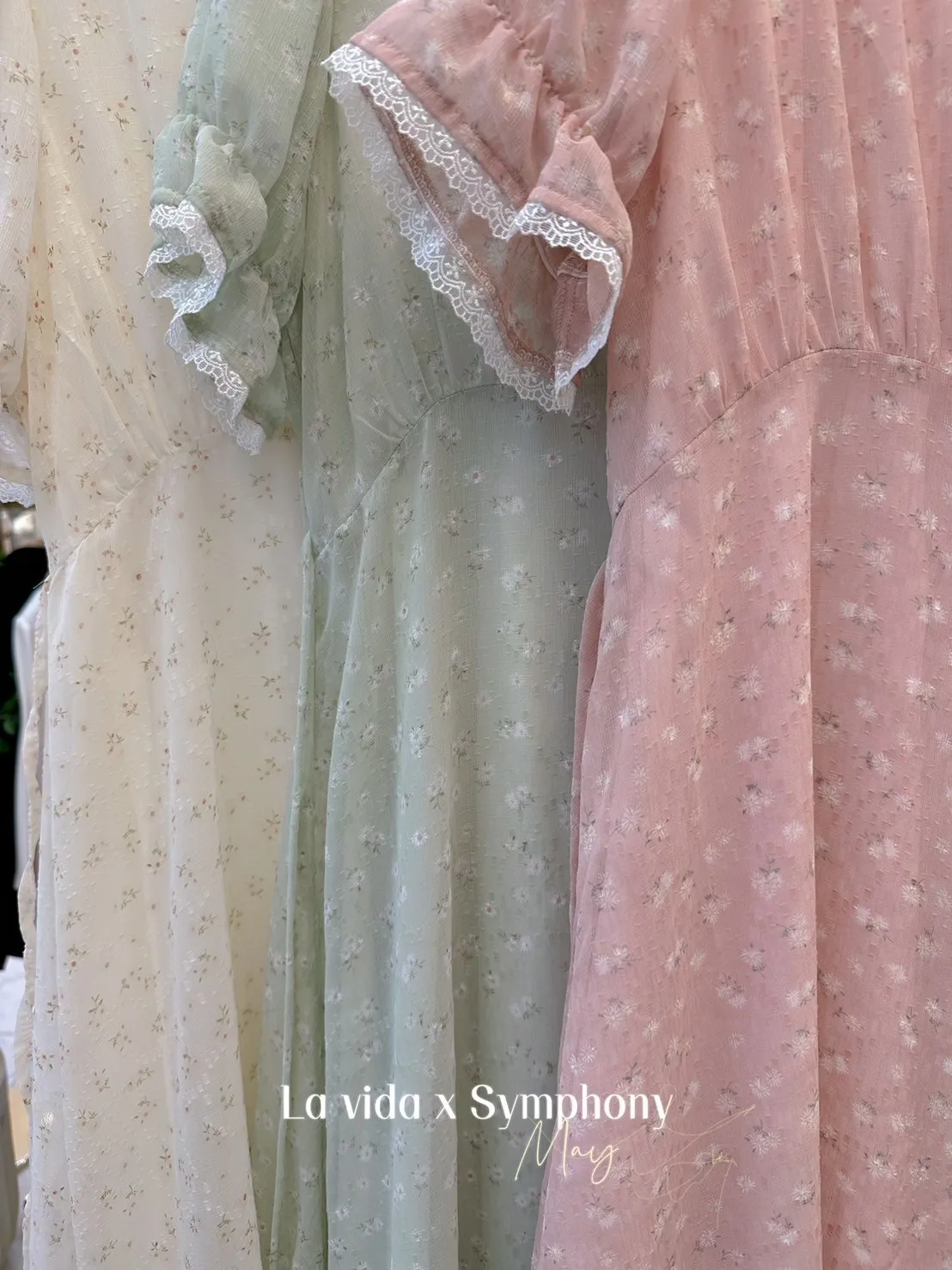 KM214蕾絲網紗V領細緻小花高腰洋裝 米 綠 粉 官網價$1460 線上價$1430