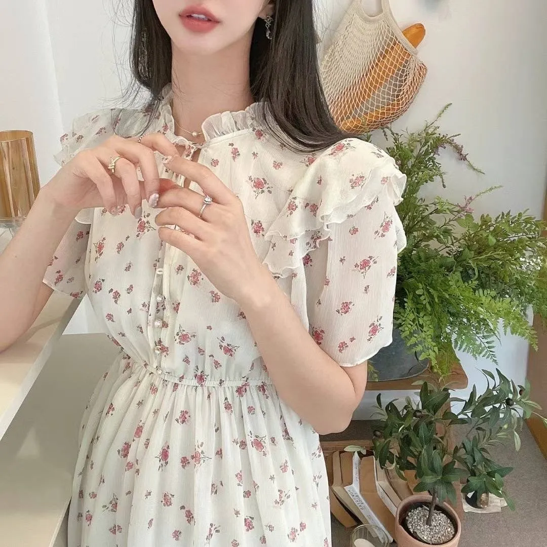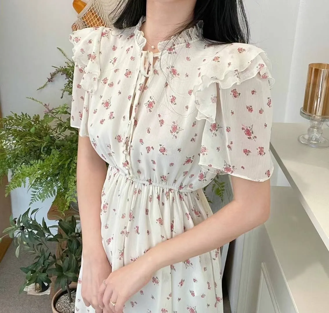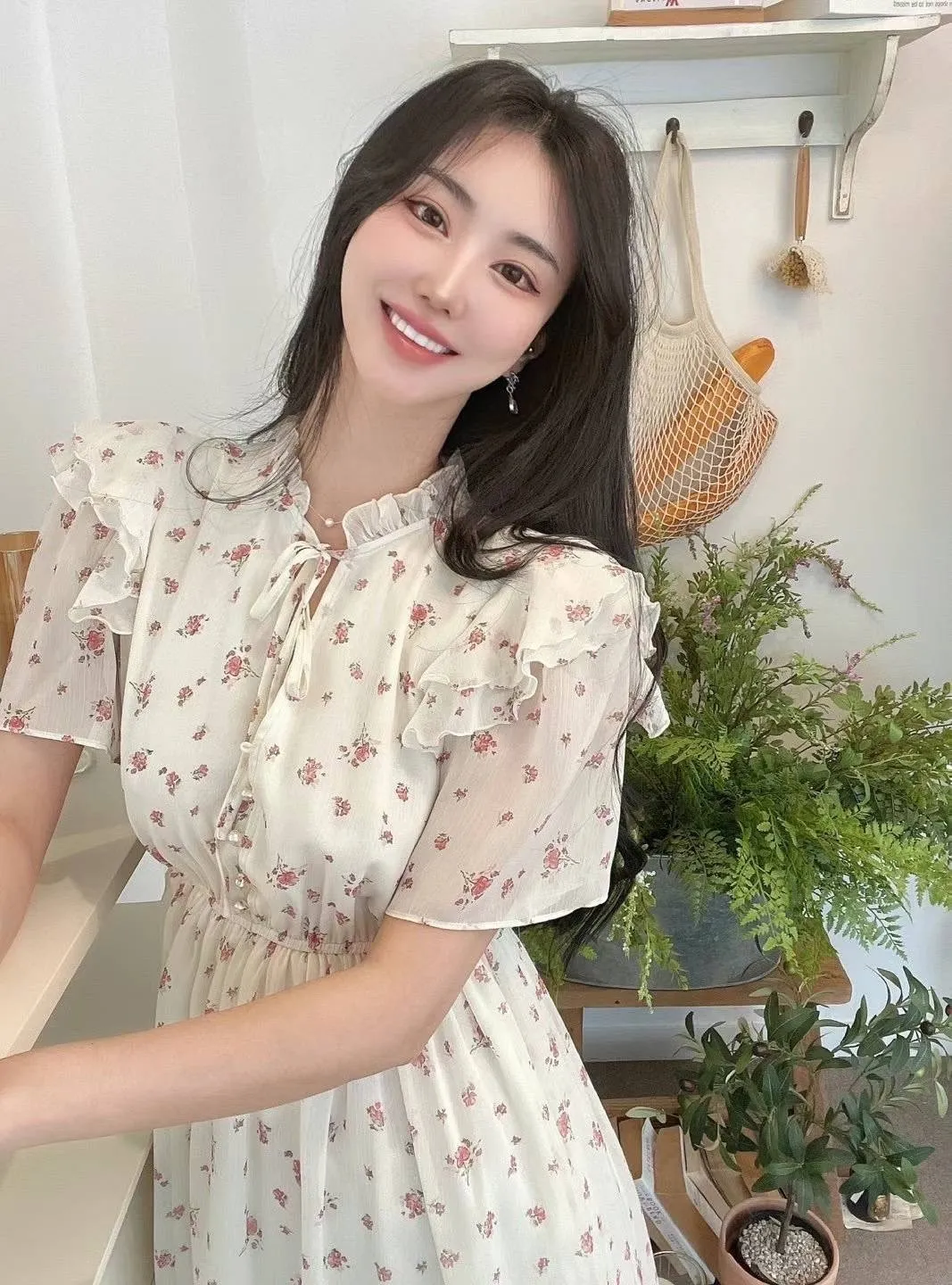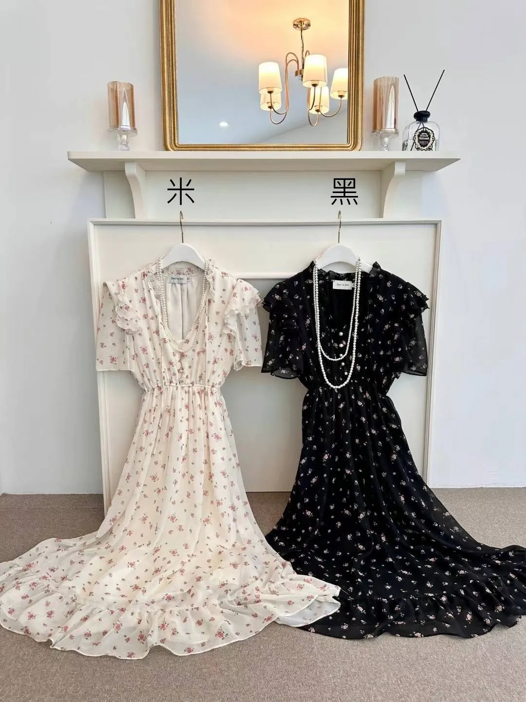 雪紡 雙層領 胸綁帶 V領金邊釦 有內裡 高腰長腿 飄逸裙擺