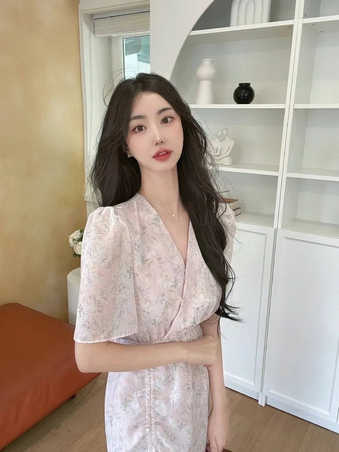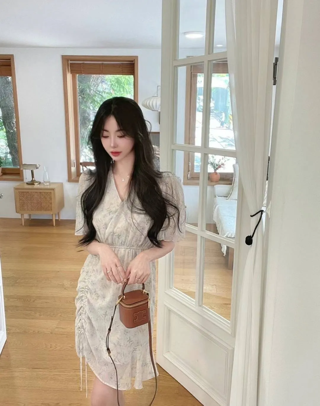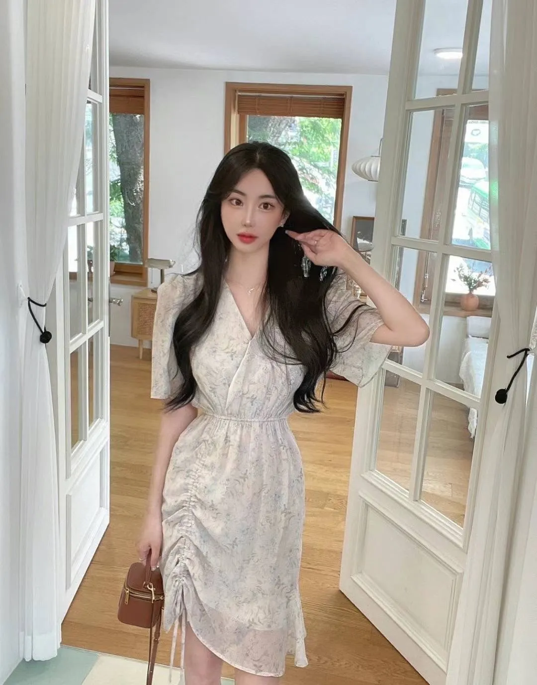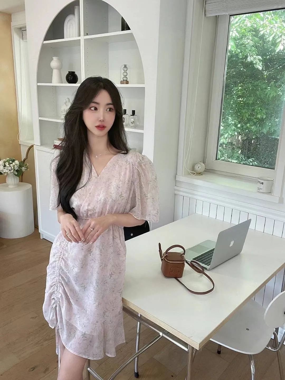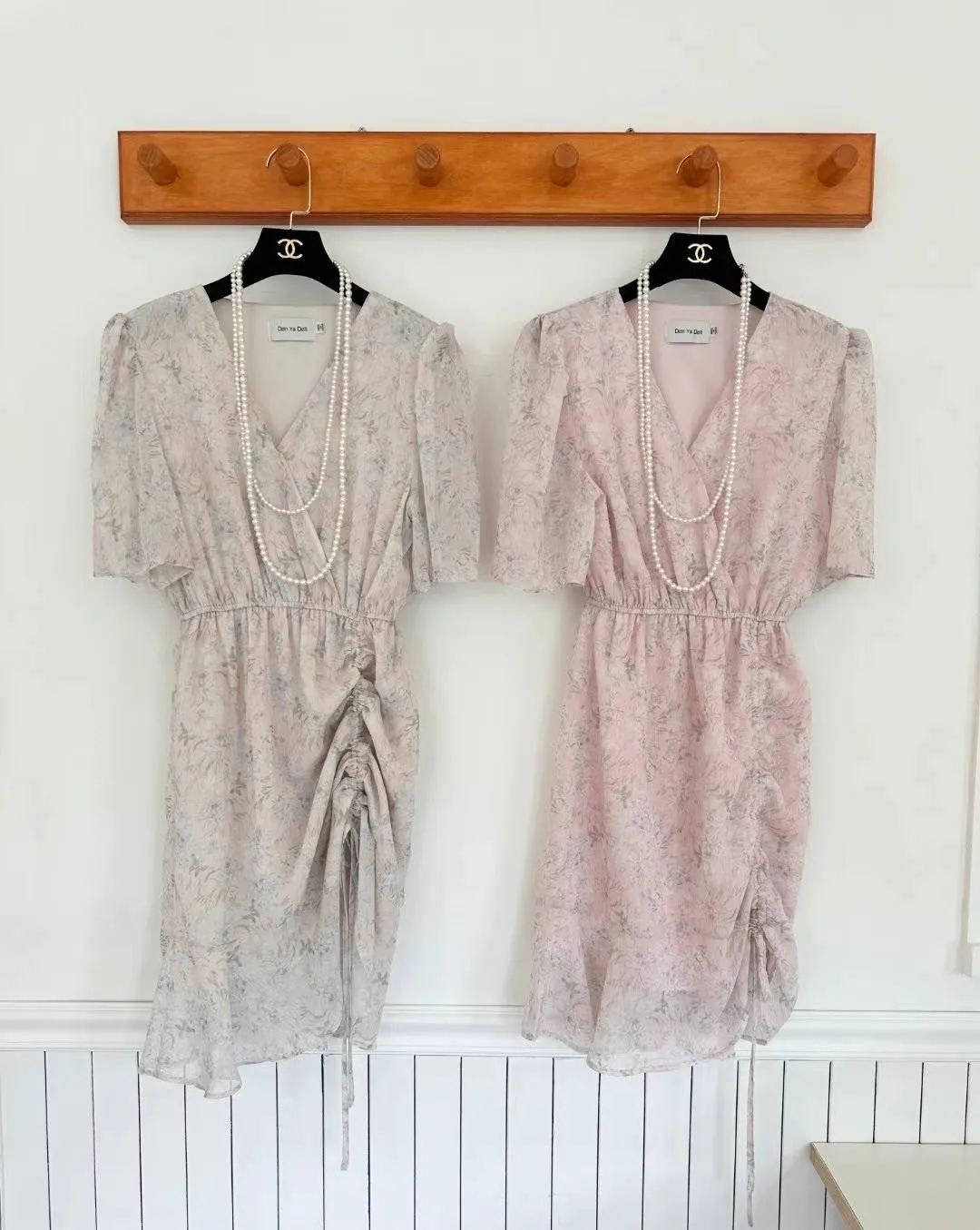 KM236交疊V領側腿抽繩氣質洋裝 綠 粉 官網價$1390 線上價$1360