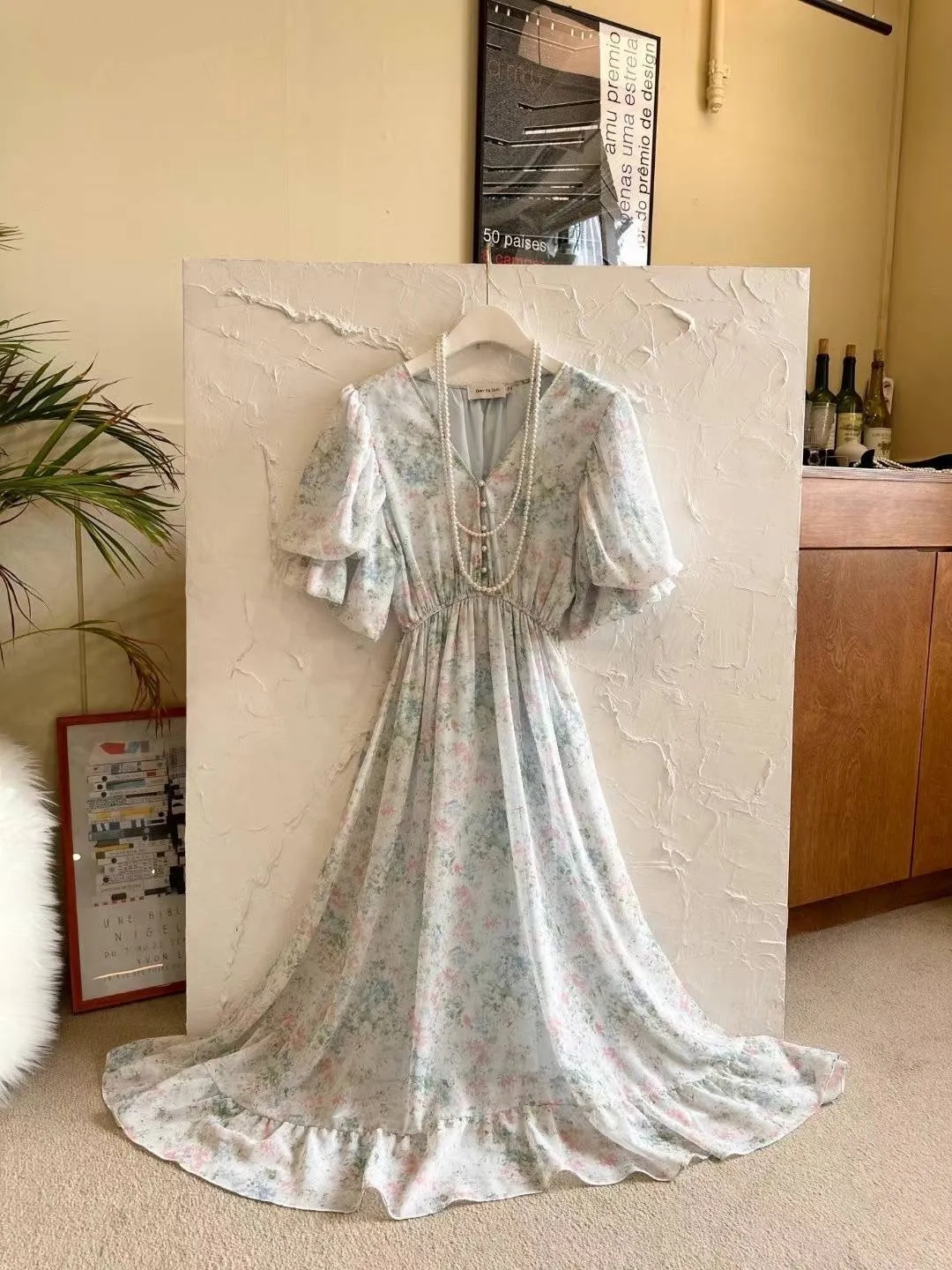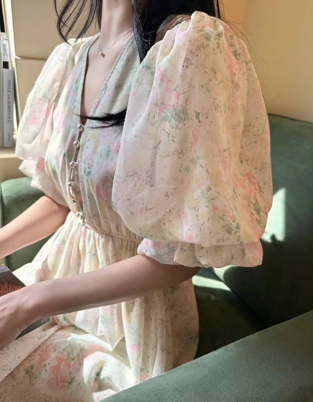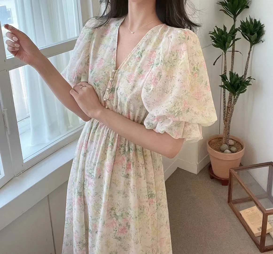 KM240雪紡極美春天V領層次美袖洋裝 米 綠 官網價$1660 線上價$ 1630