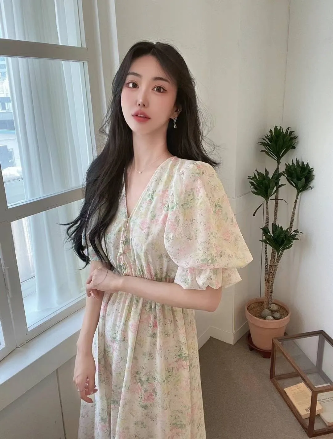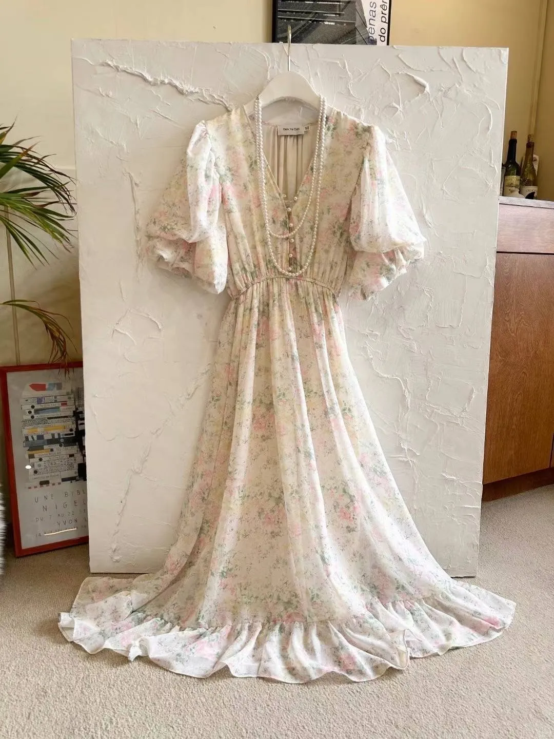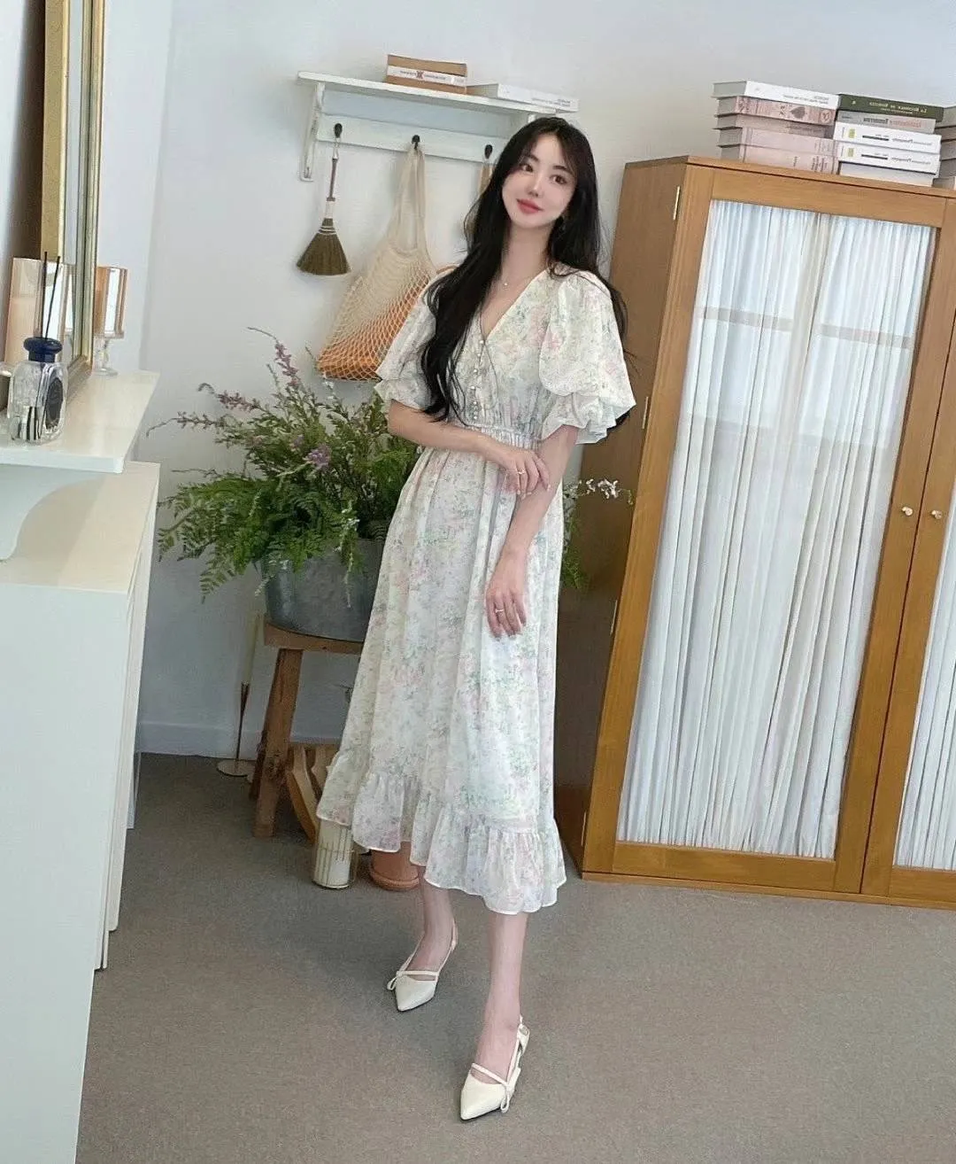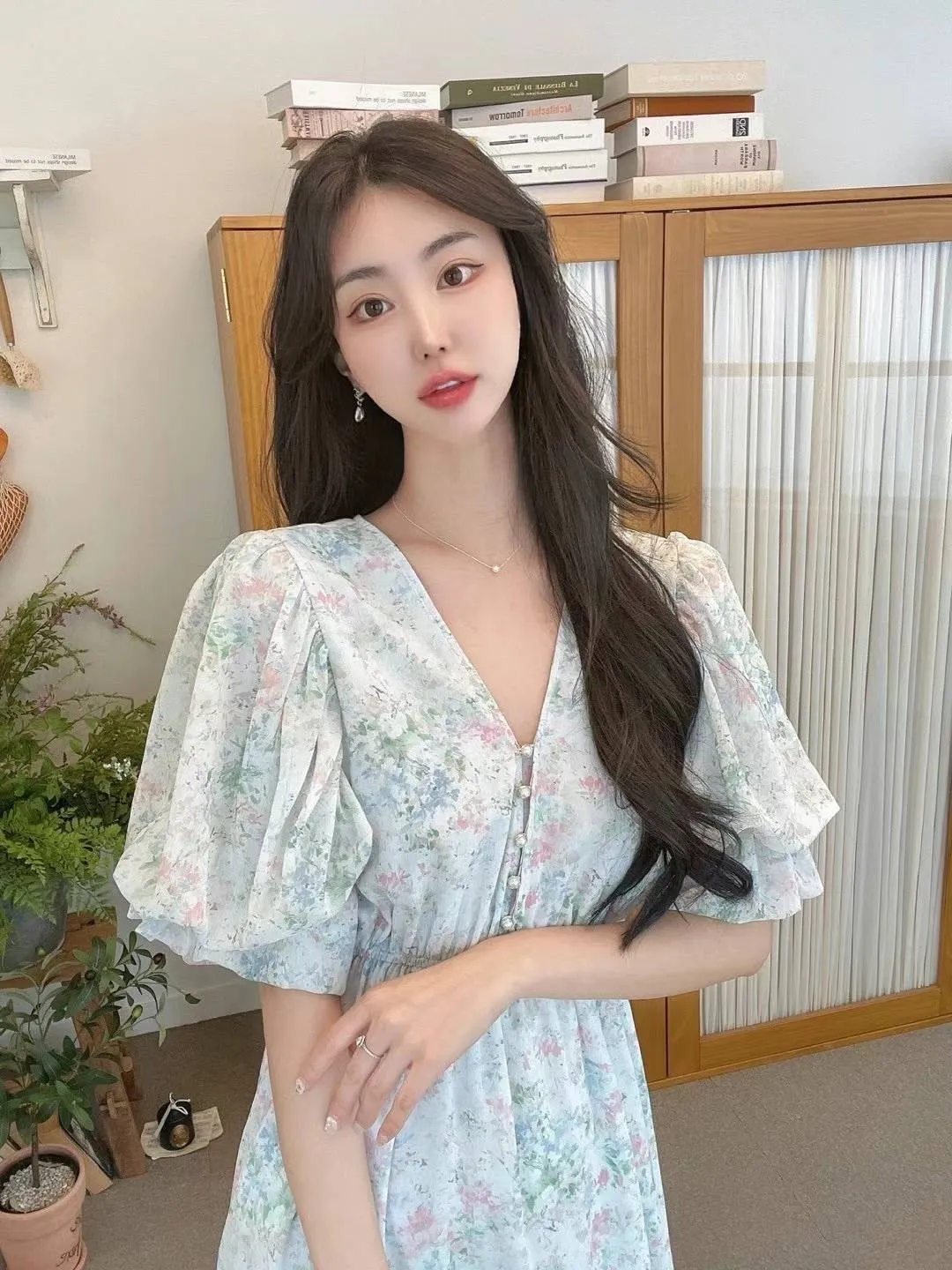 KM240雪紡極美春天V領層次美袖洋裝 米 綠 官網價$1660 線上價$ 1630