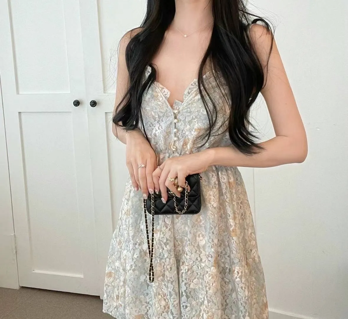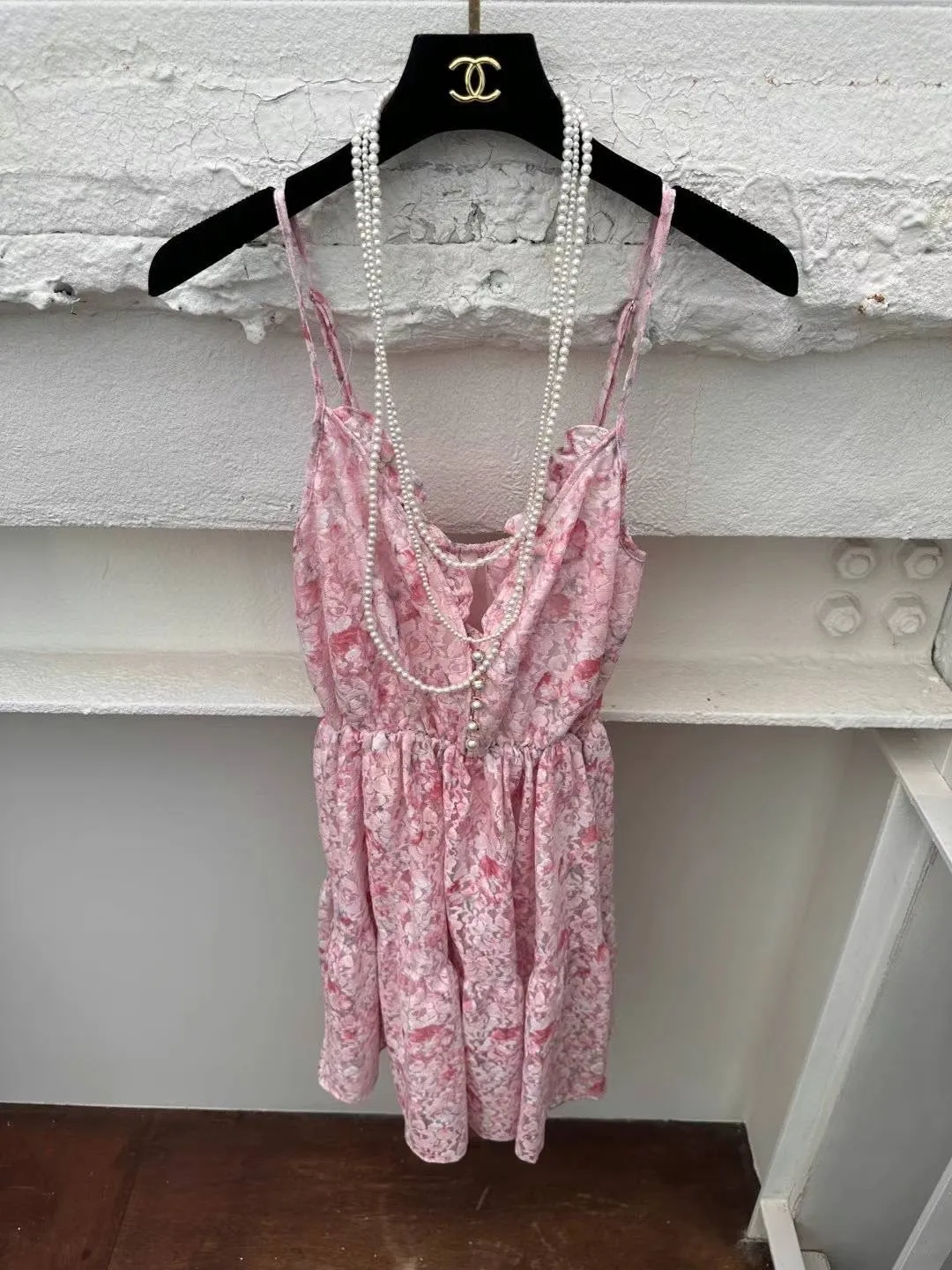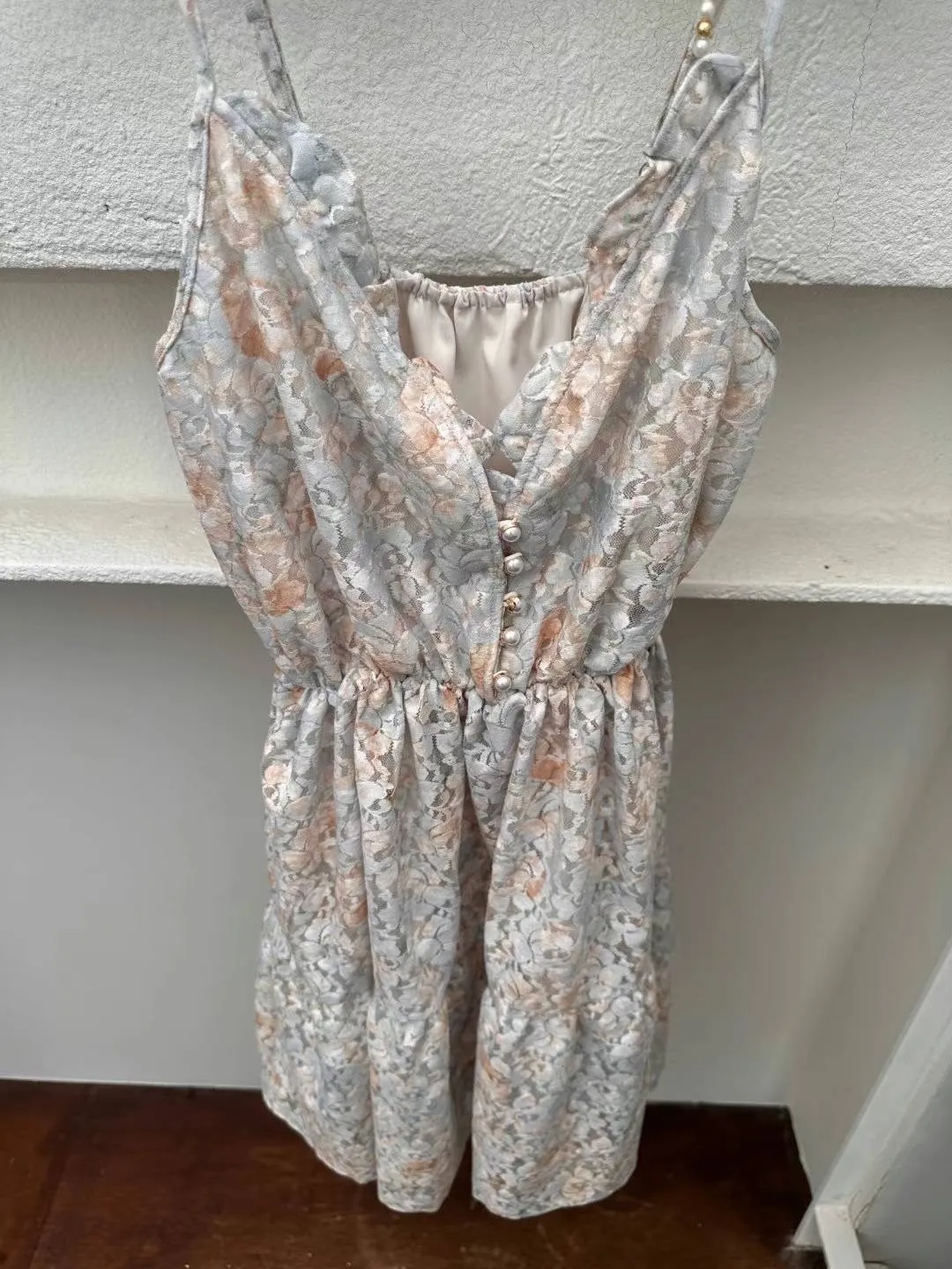 雪紡 金邊珍珠釦 有內裡 腰綁帶 腰有鬆緊 短版洋裝 肩帶可調