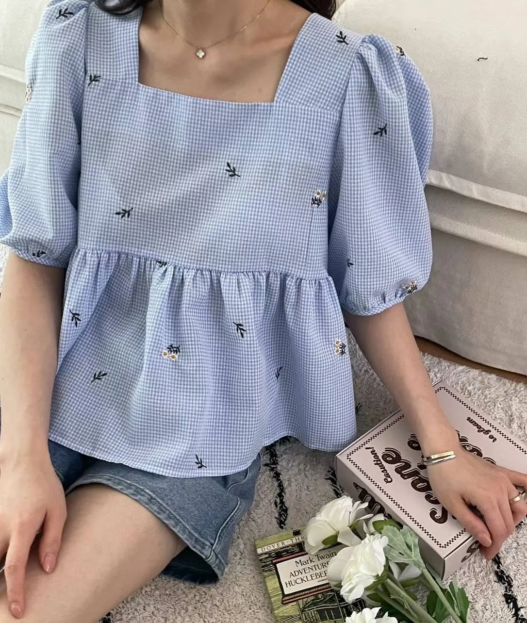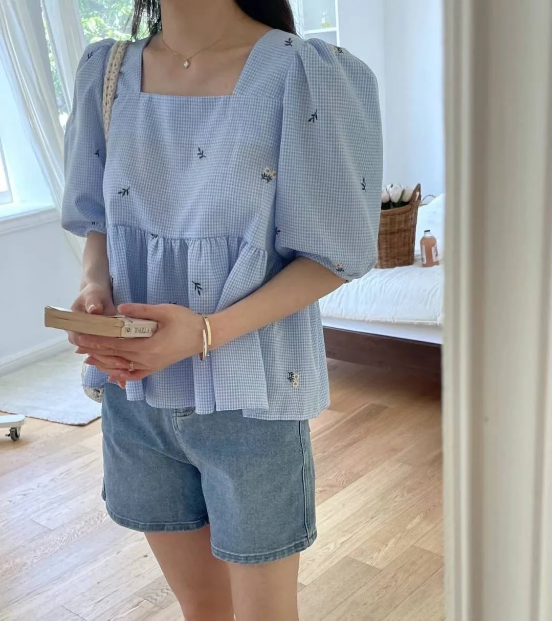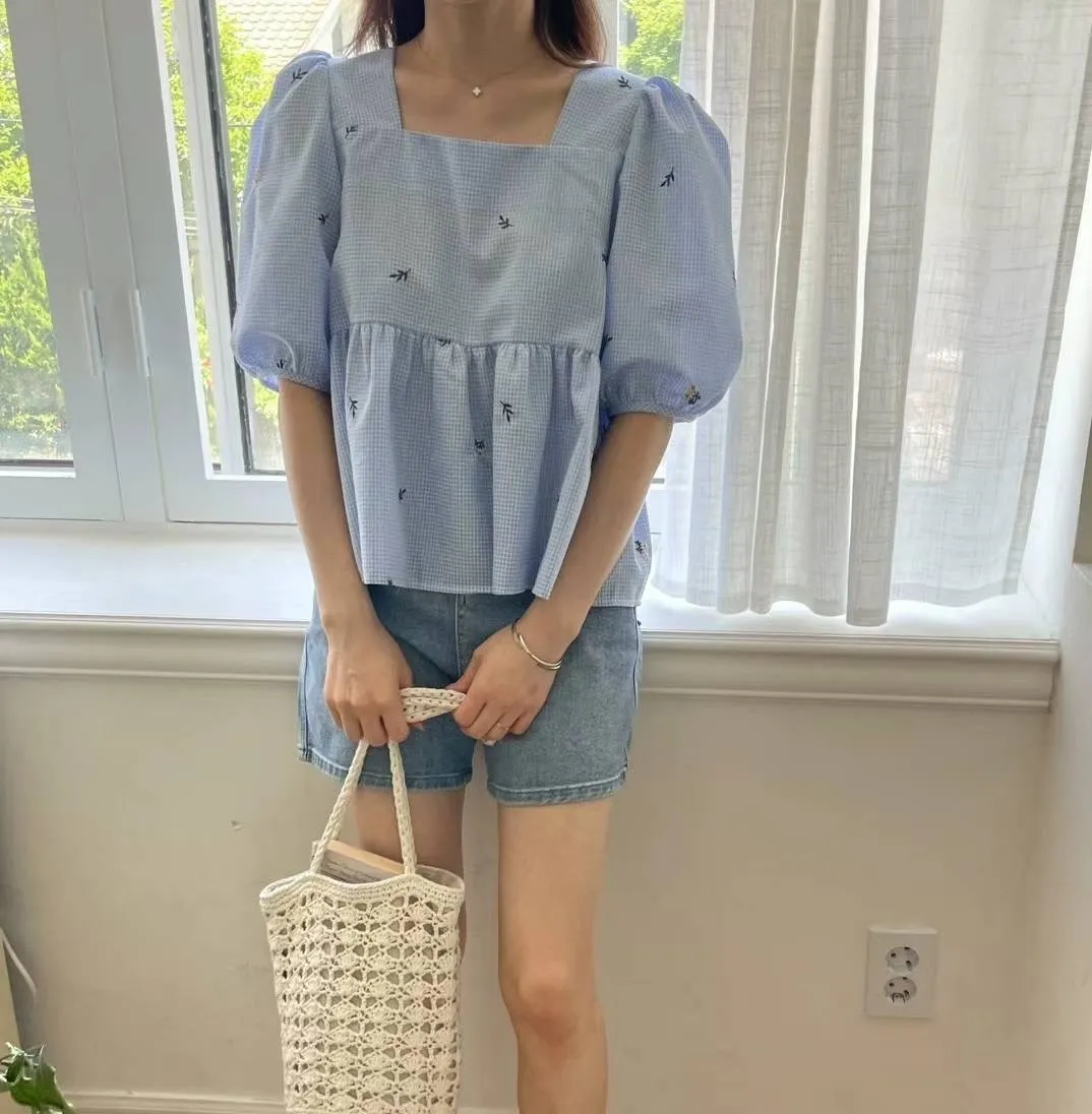 KM350方領刺繡小花後綁帶上衣 米 藍 官網價$810 線上價$780