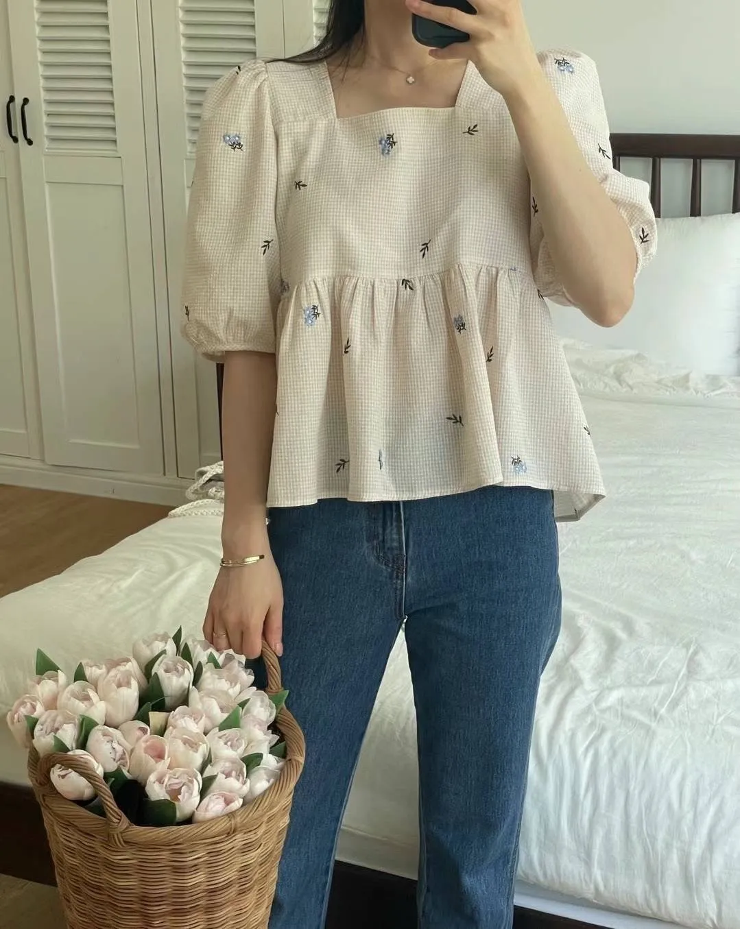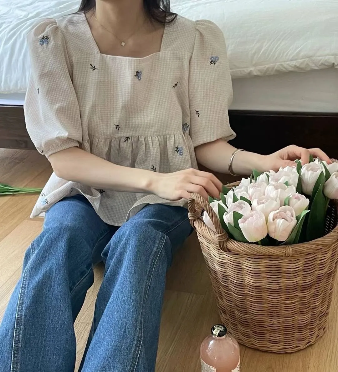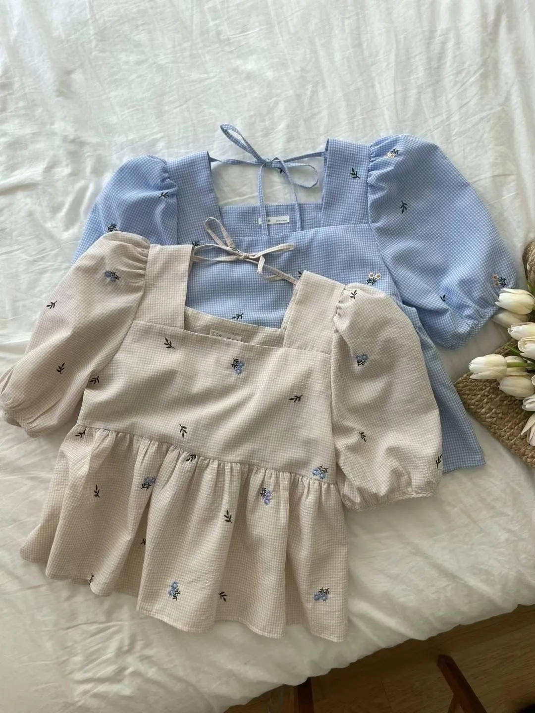 KM350方領刺繡小花後綁帶上衣