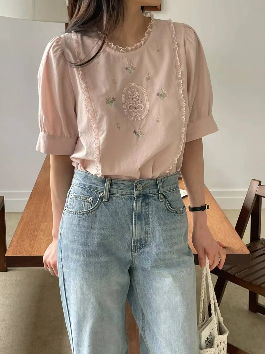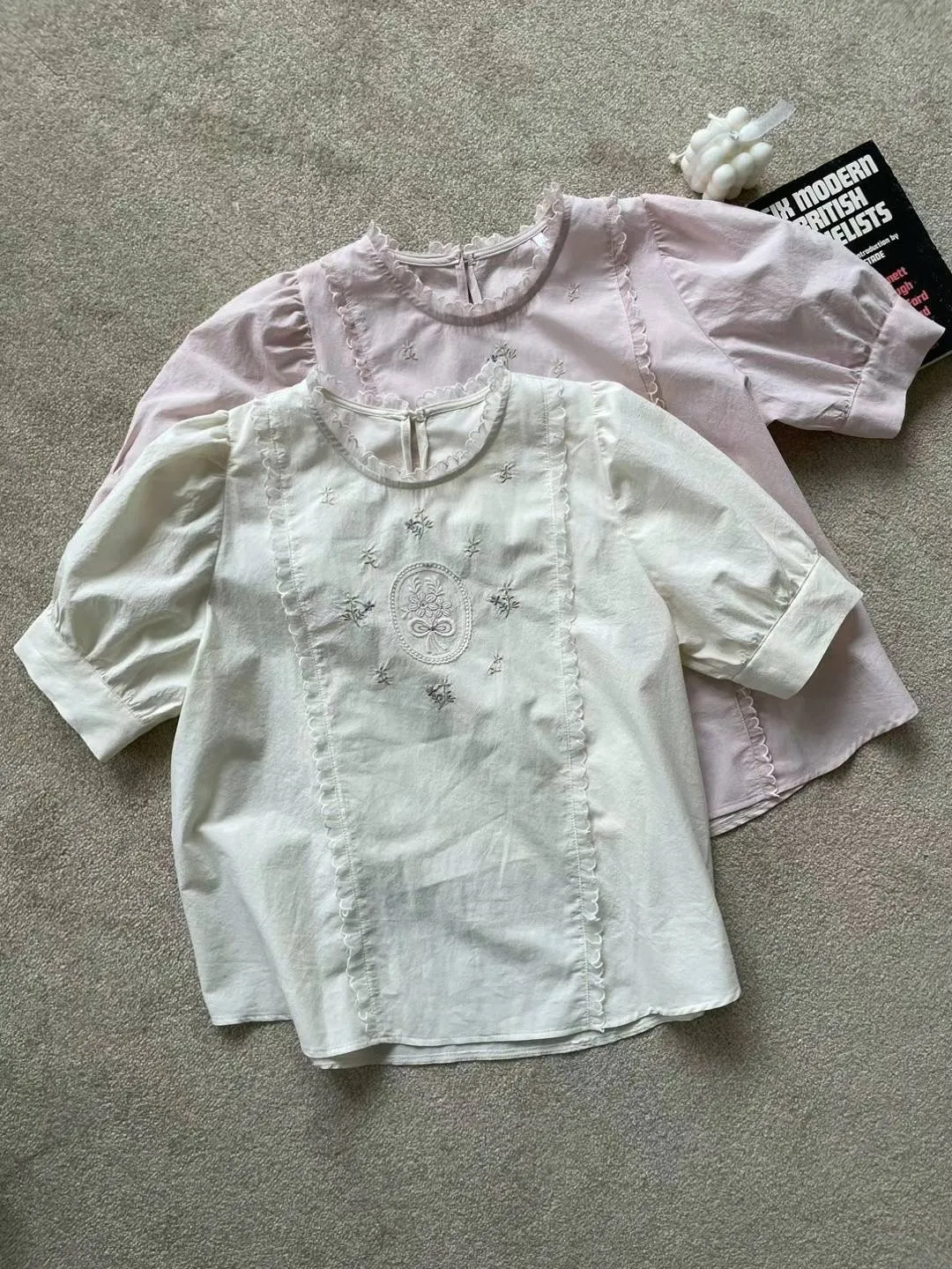 棉 刺繡小花 薄款輕盈 拼接蕾絲滾邊 袖口有釦 適合台灣夏天