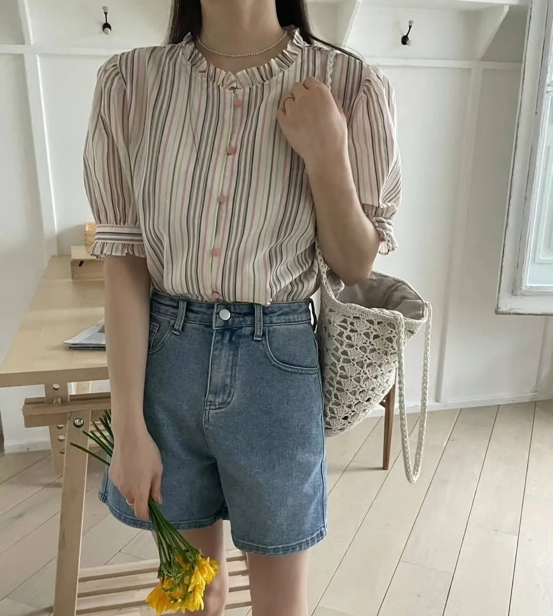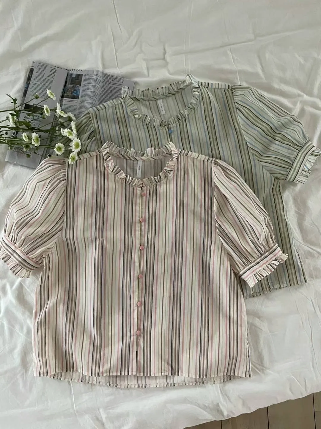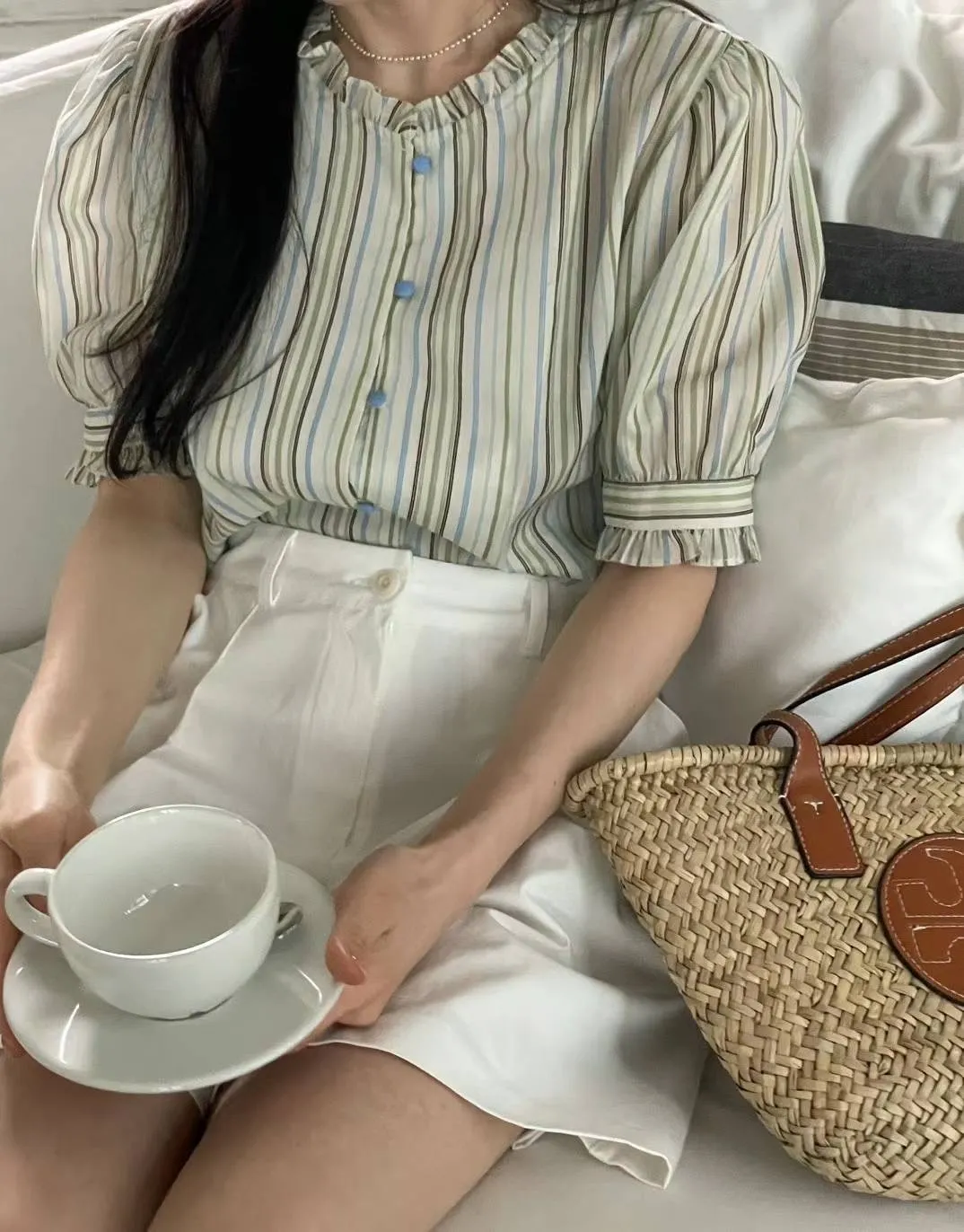 棉 層次感條紋 釦子穿脫 小荷葉立領 透氣舒適 袖口有釦 穿到小L