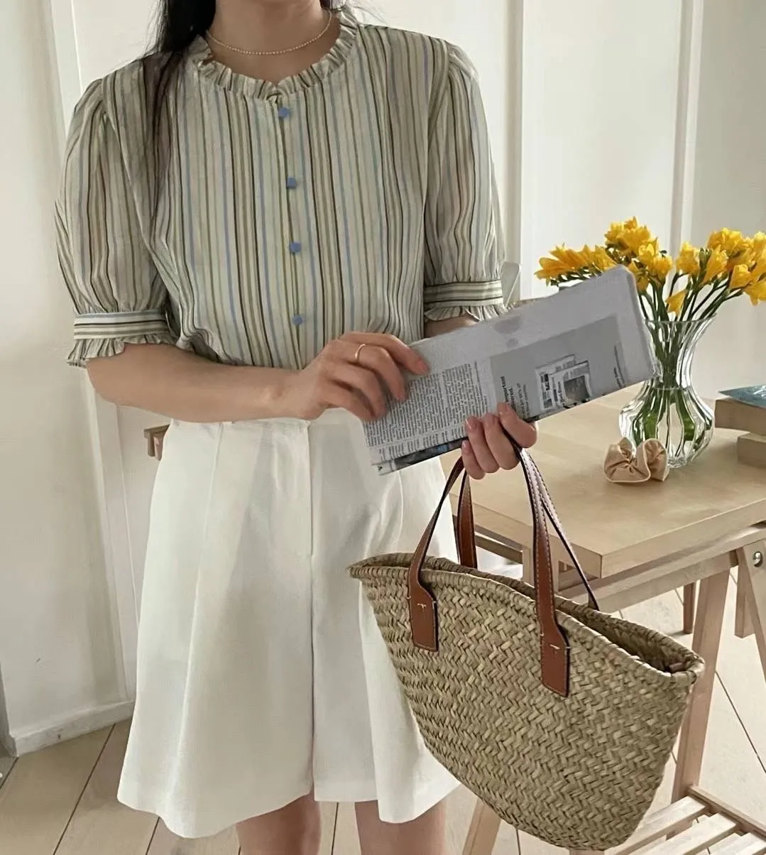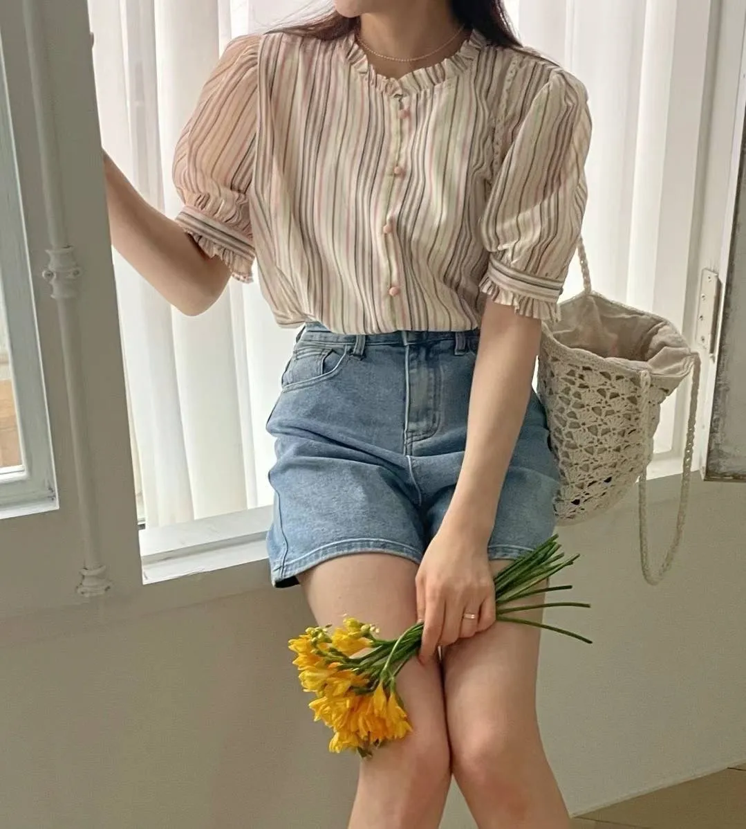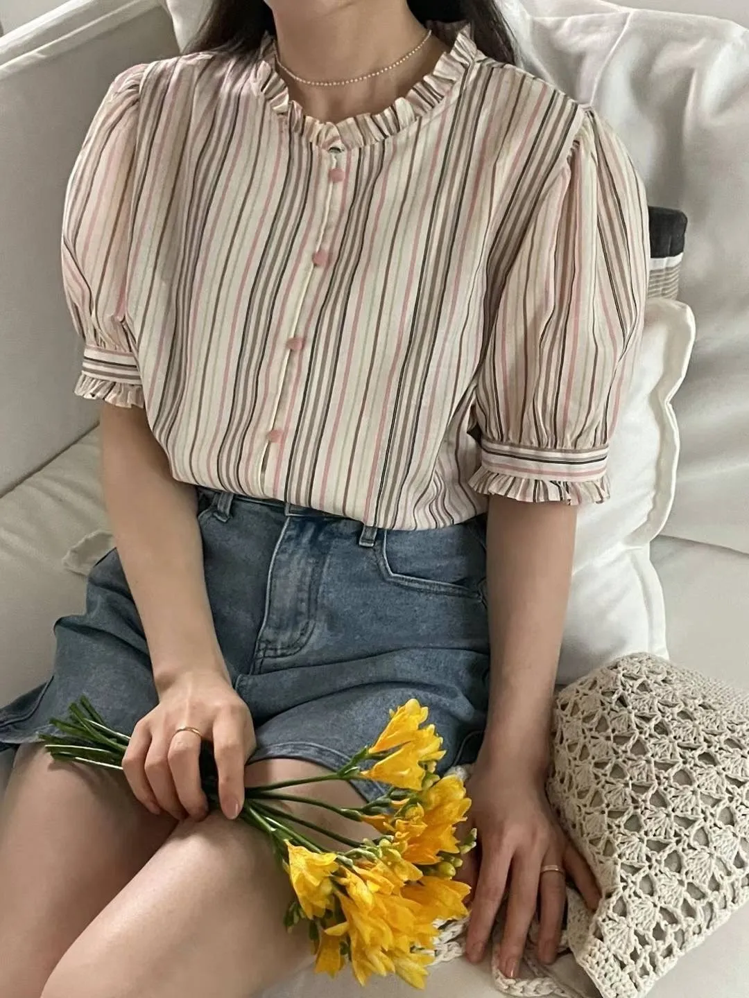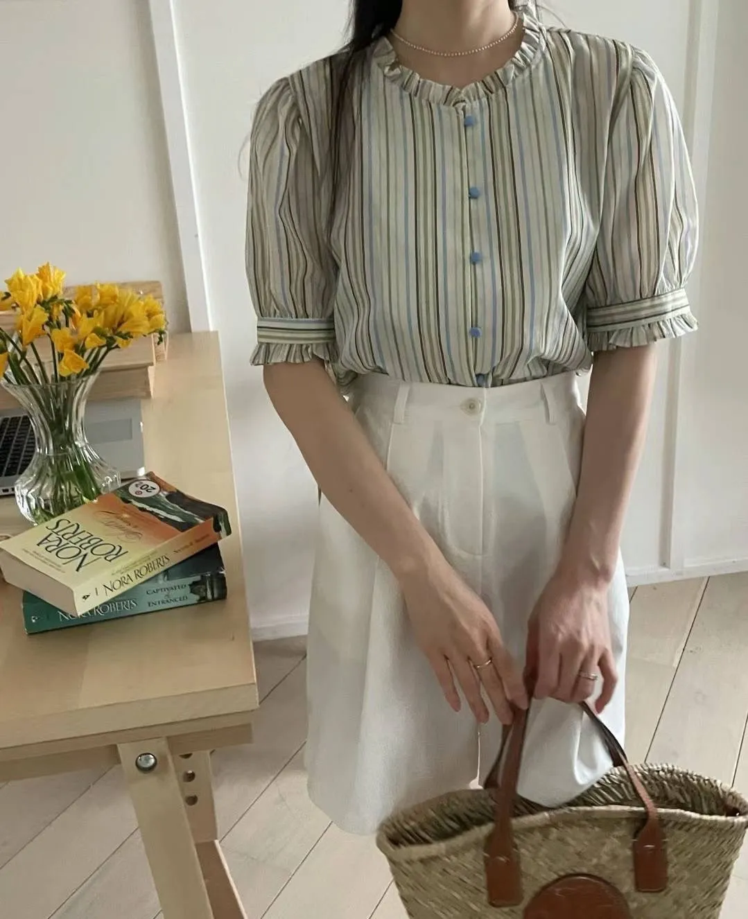 棉 層次感條紋 釦子穿脫 小荷葉立領 透氣舒適 袖口有釦 穿到小L