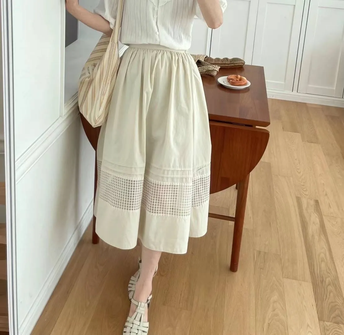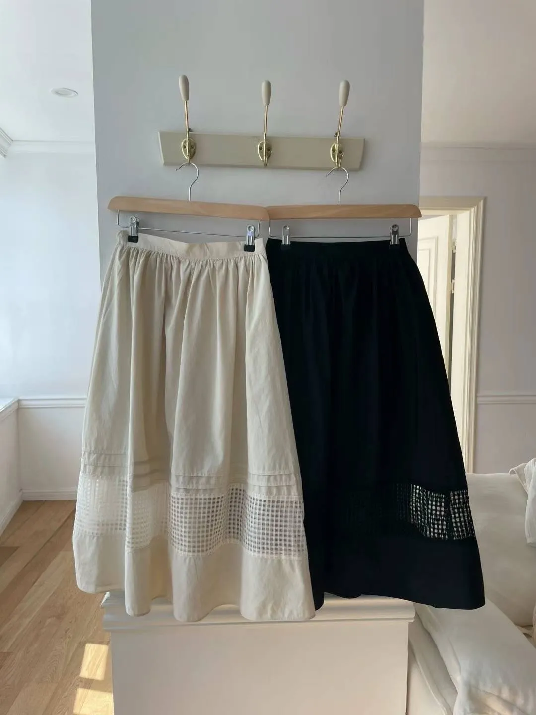 KM357細緻隱約簍空格紋傘擺美裙 米 黑 官網價$840 線上價$810