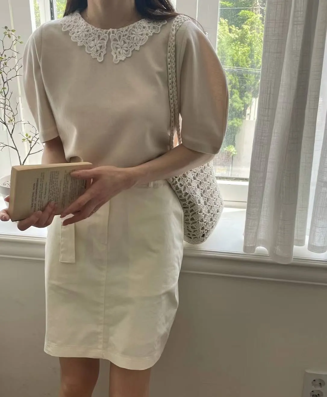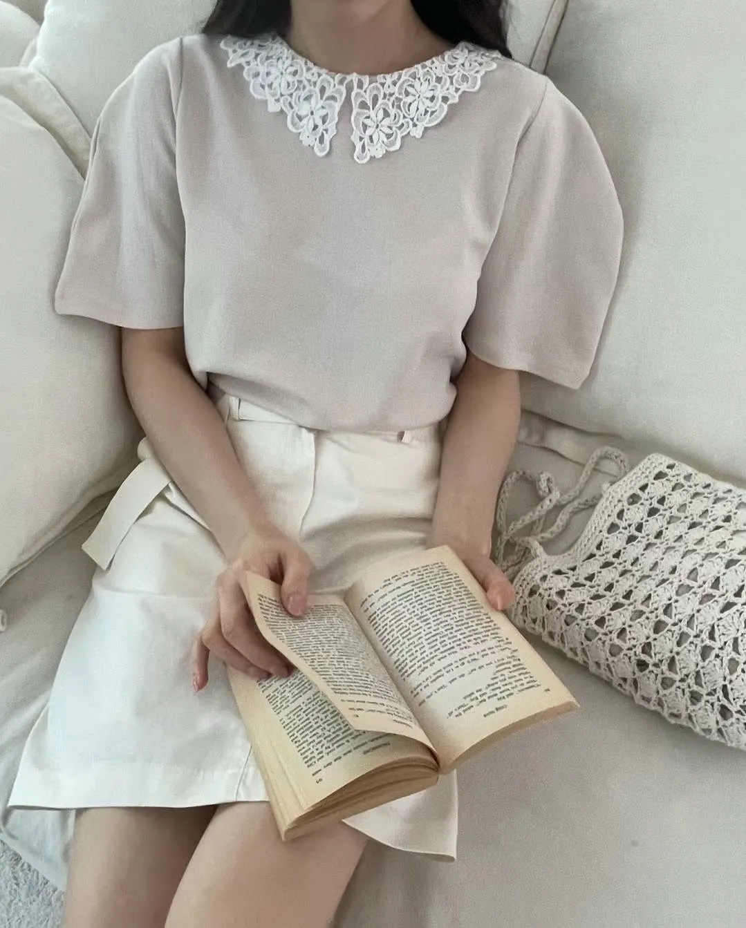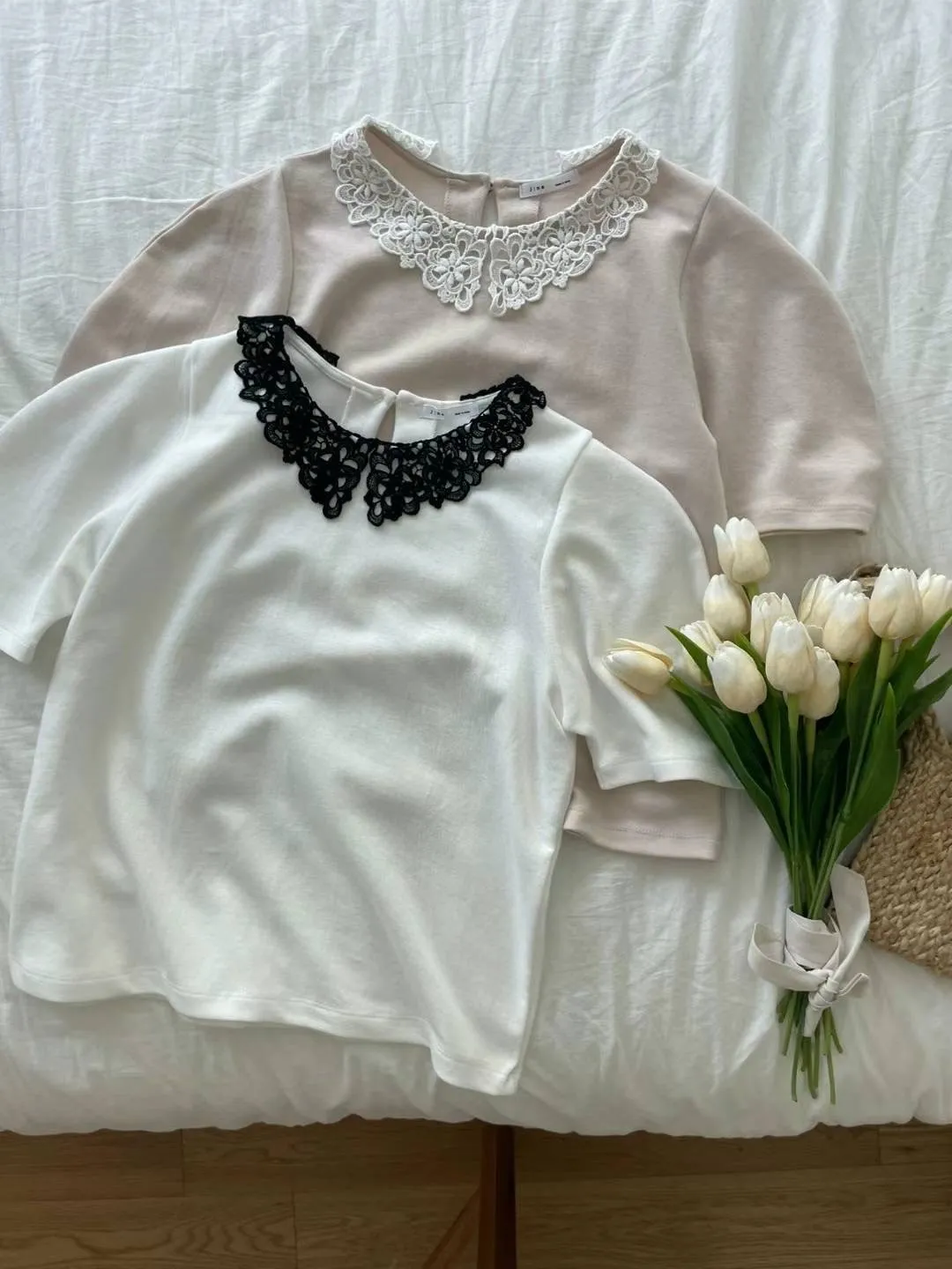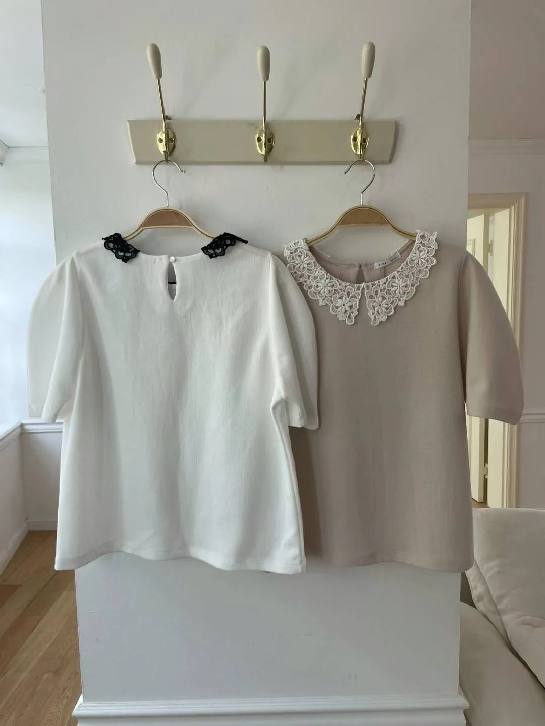 KM364細緻蕾絲領上衣 白 粉 官網價$599 線上價$569