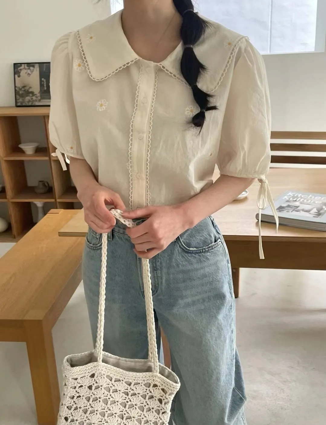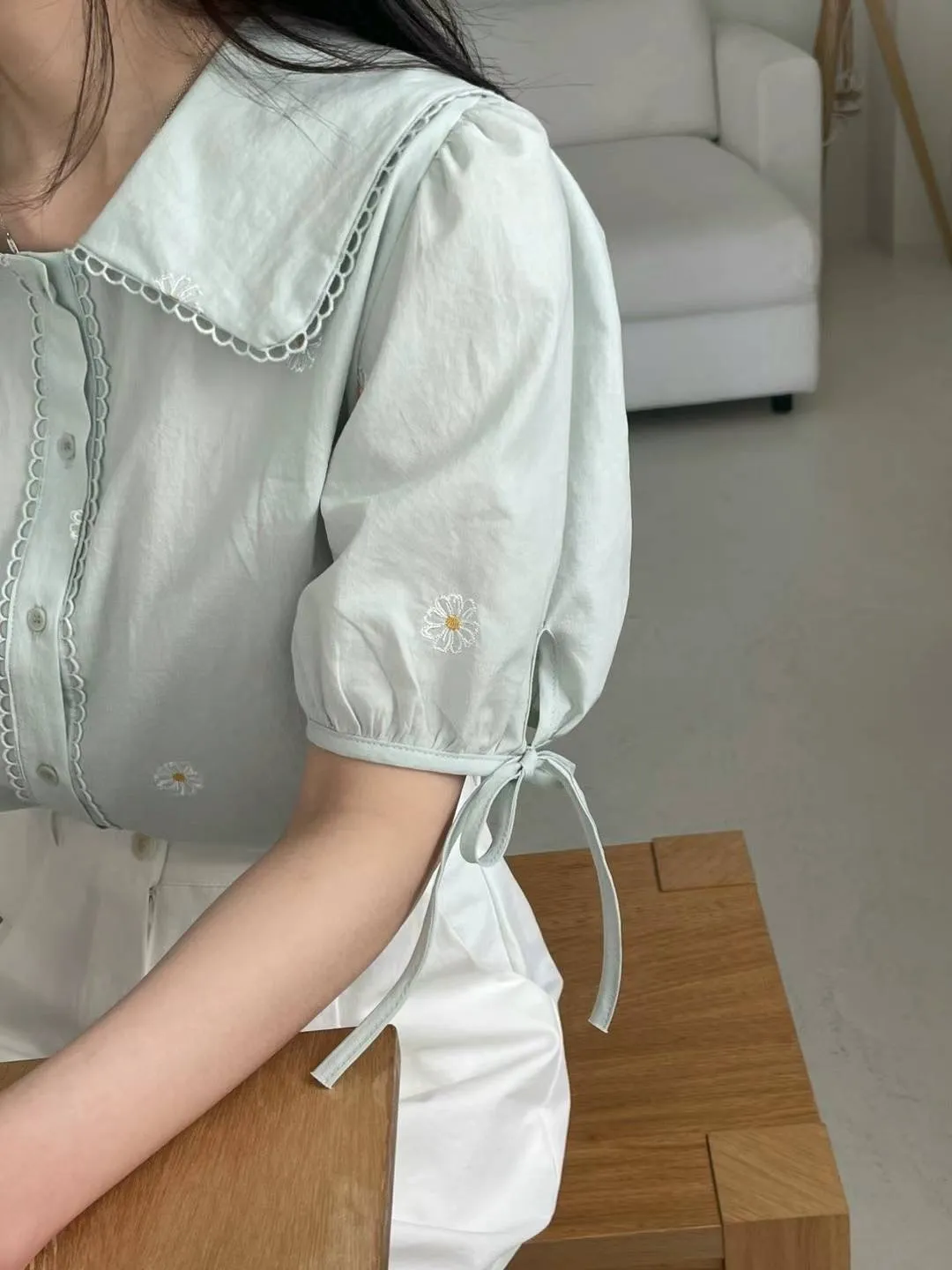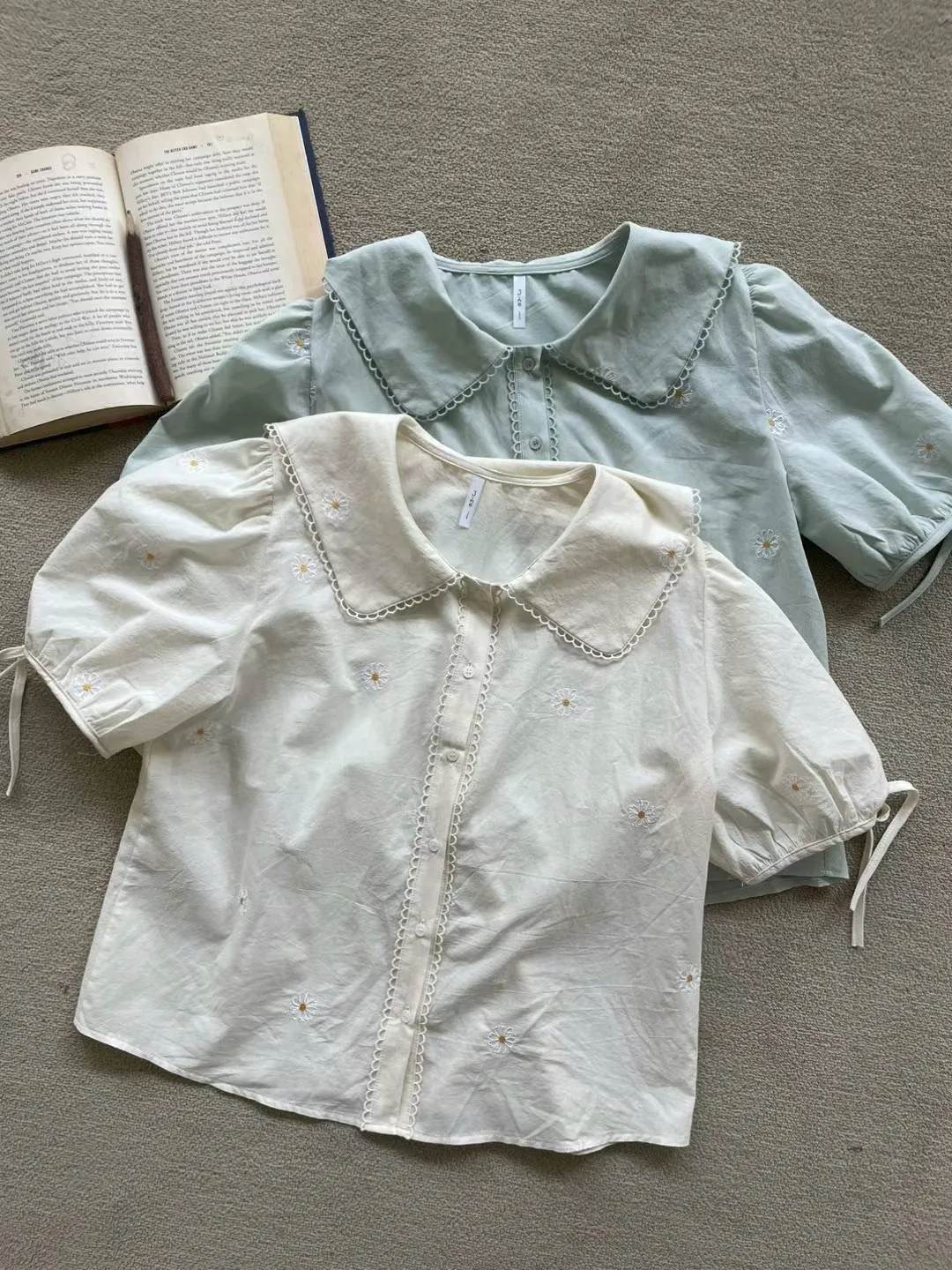 棉 刺繡小雛菊 蕾絲滾邊翻領 綁帶袖口設計 空間寬鬆舒適 薄款適合夏天