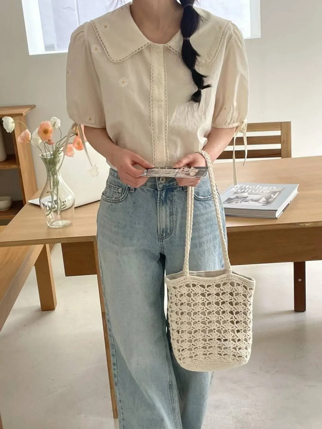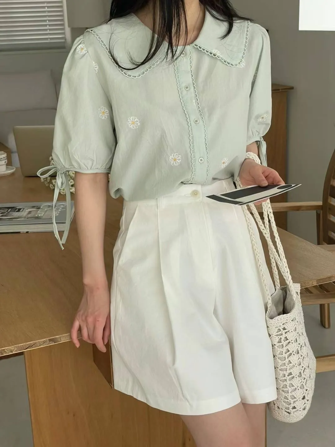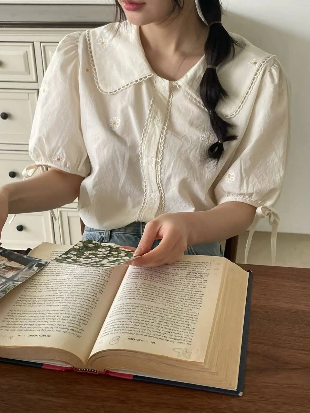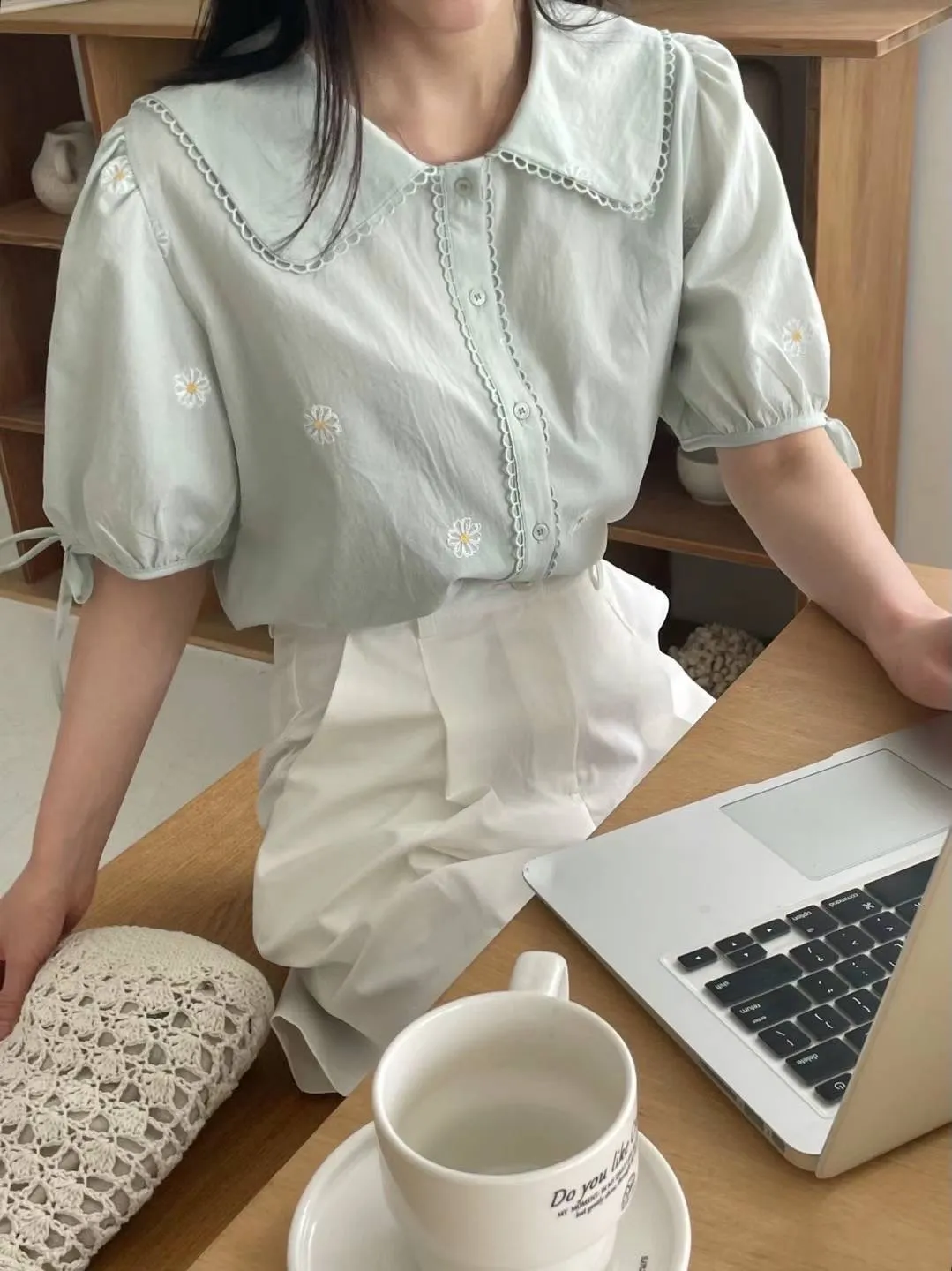 棉 刺繡小雛菊 蕾絲滾邊翻領 綁帶袖口設計 空間寬鬆舒適 薄款適合夏天